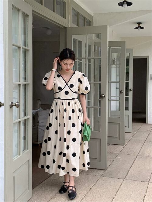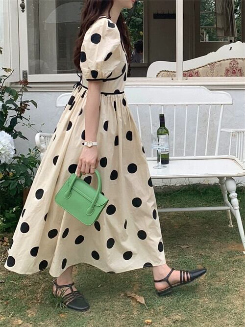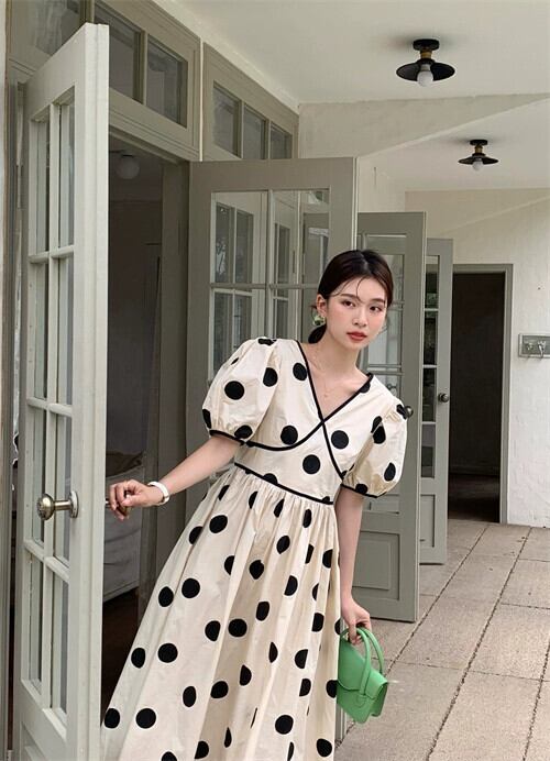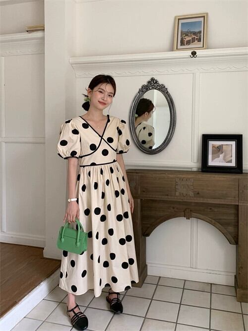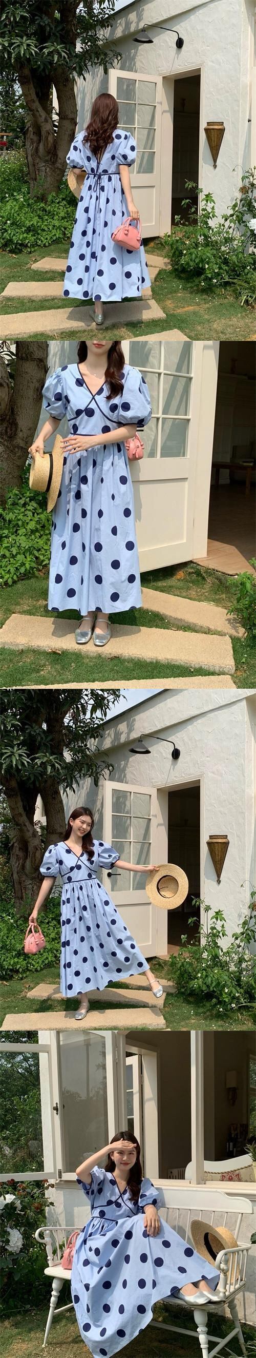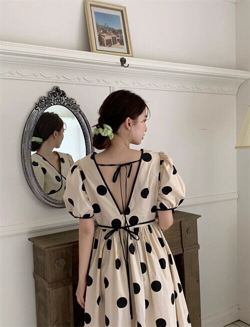 ブルー水玉ドレスの女性の夏の 2023 新しいデザインセンスニッチ気質パフスリーブウエストバックレススカート サマー 夏物 8571657851594448