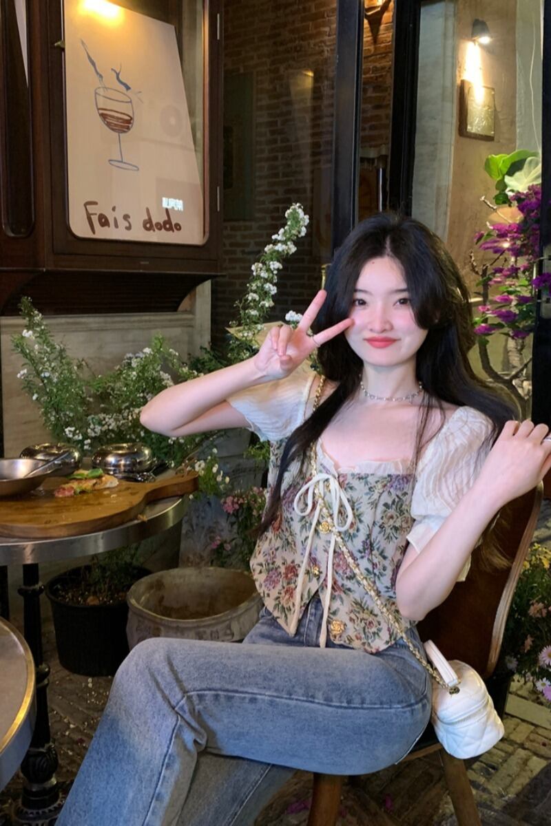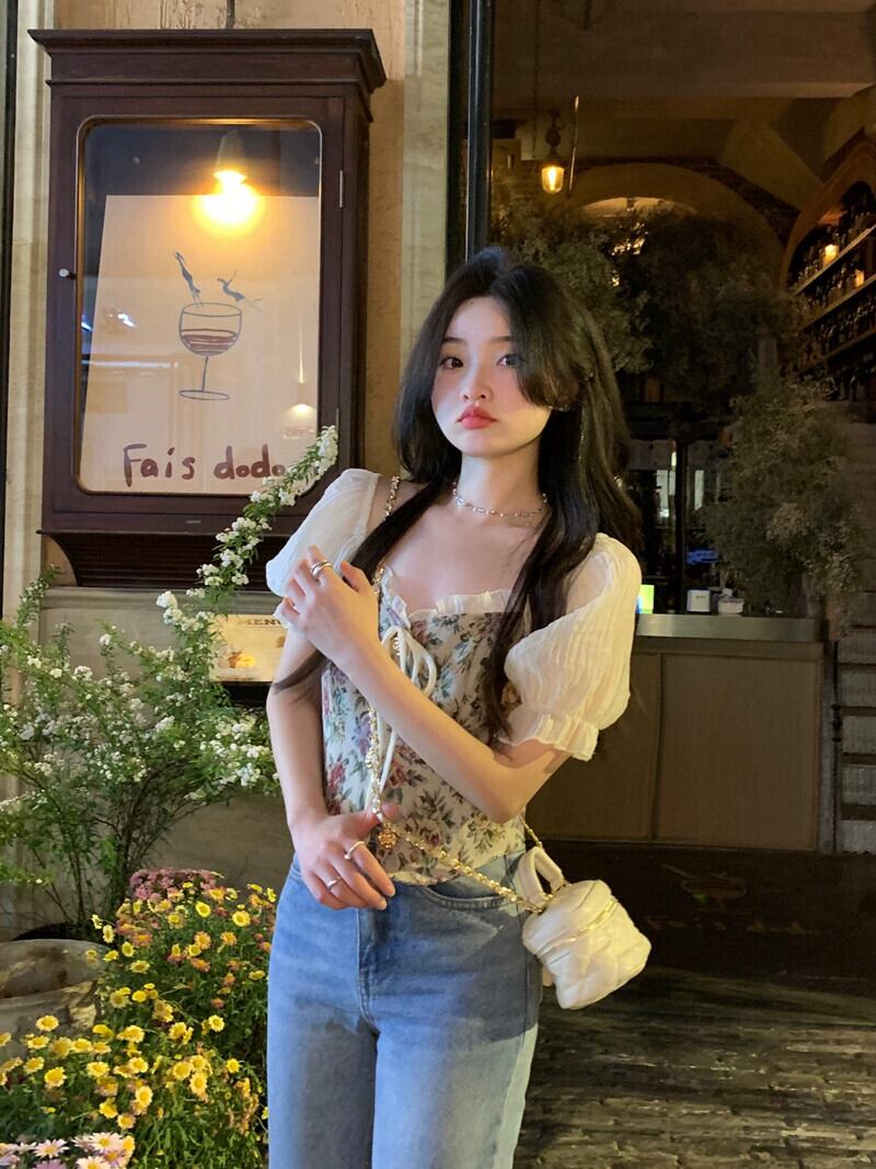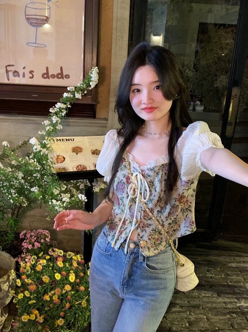 パフスリーブスクエアカラーショートトップレディース夏デザインセンスニッチフレンチスイートレトロ小さめ半袖シャツ 大人ガーリー スウィート キュート カジュアル サマー 夏物 スクウェア 8571668570579690