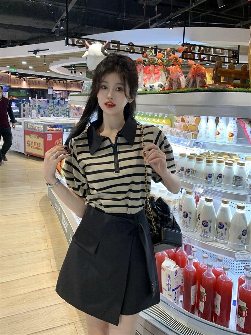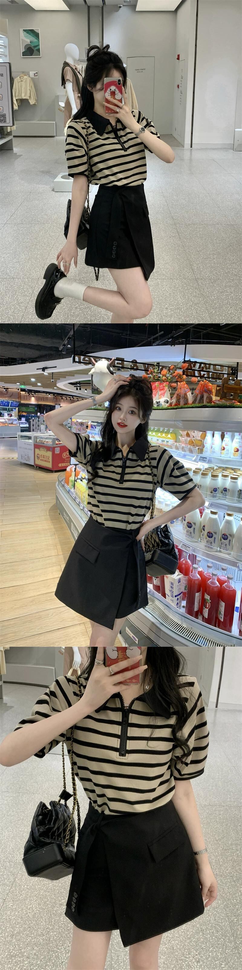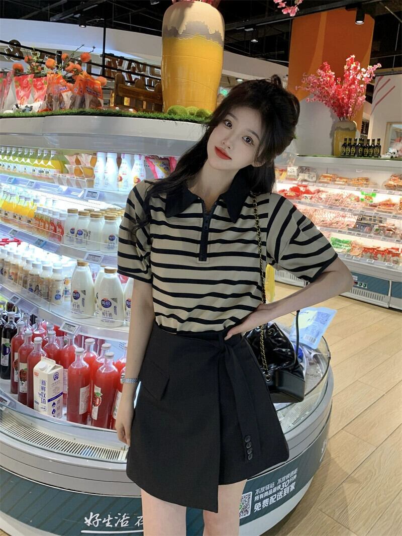 グレーストライプ半袖 T シャツレディース 2023 夏の新しいデザインセンス小さな eign スタイル年齢を減らすポロ襟トップ サマー 夏物 Tシャツ 8571675709010873