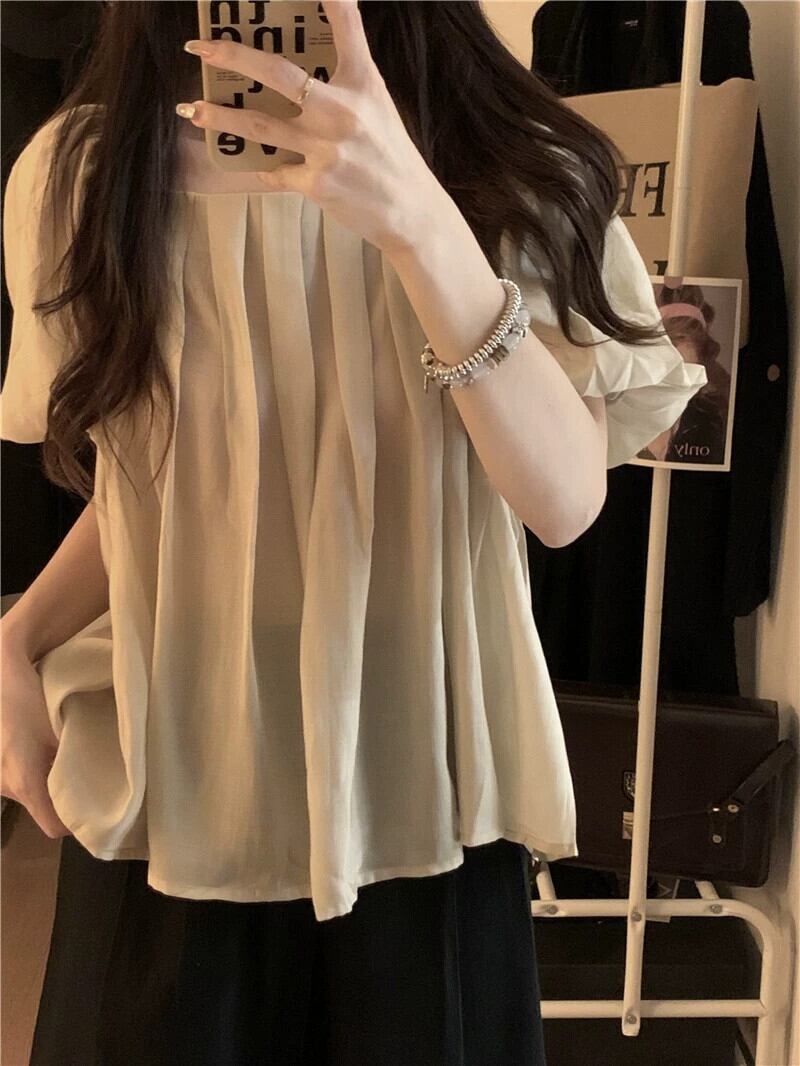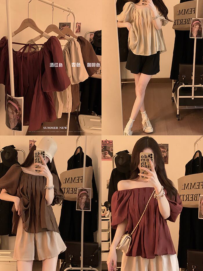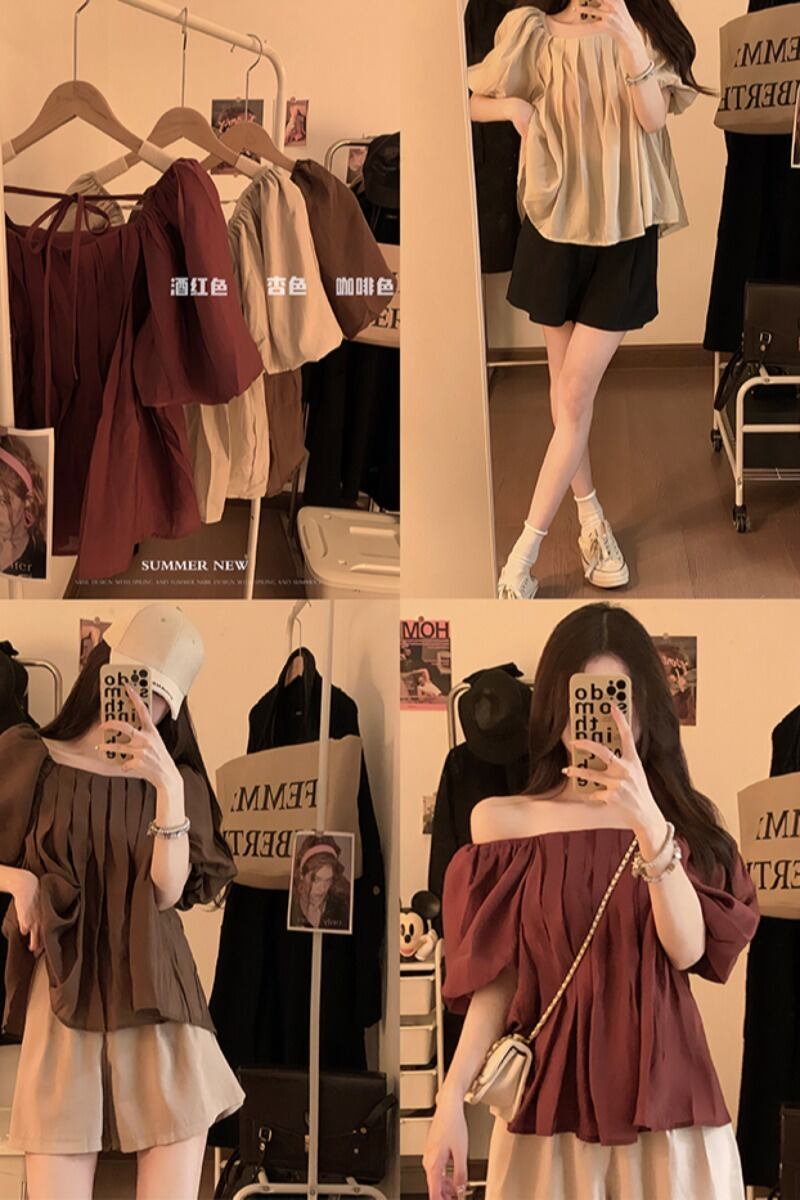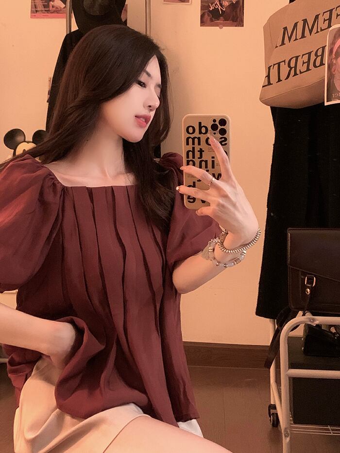 パフスリーブスクエアカラートップスレディース夏デザインセンスニッチフランスの優しい気質美しいワインレッド半袖シャツ サマー 夏物 スクウェア 8571687542683363