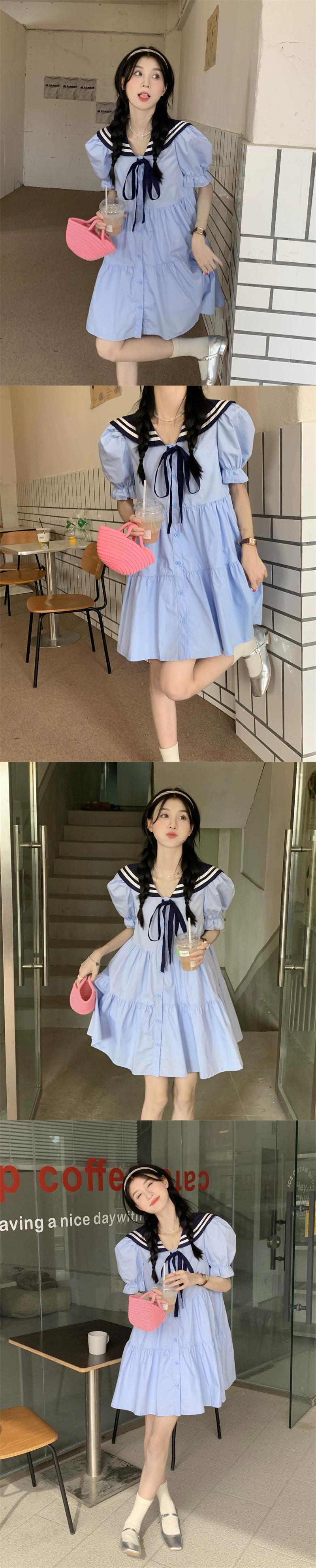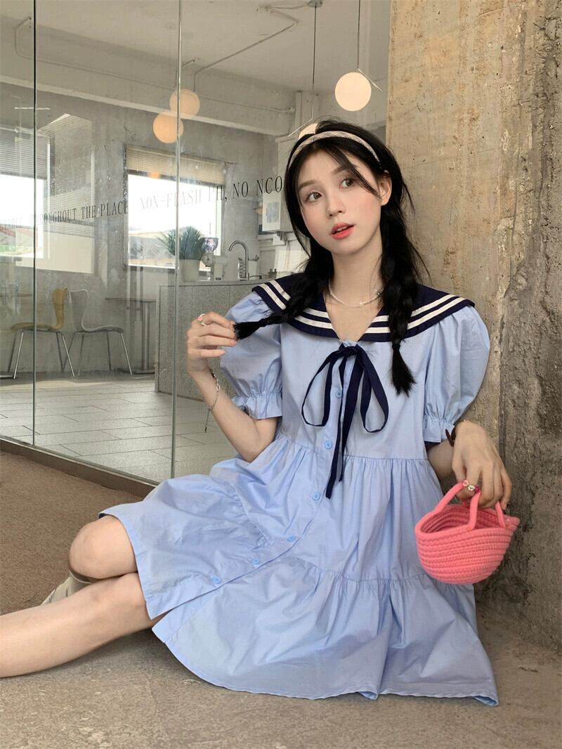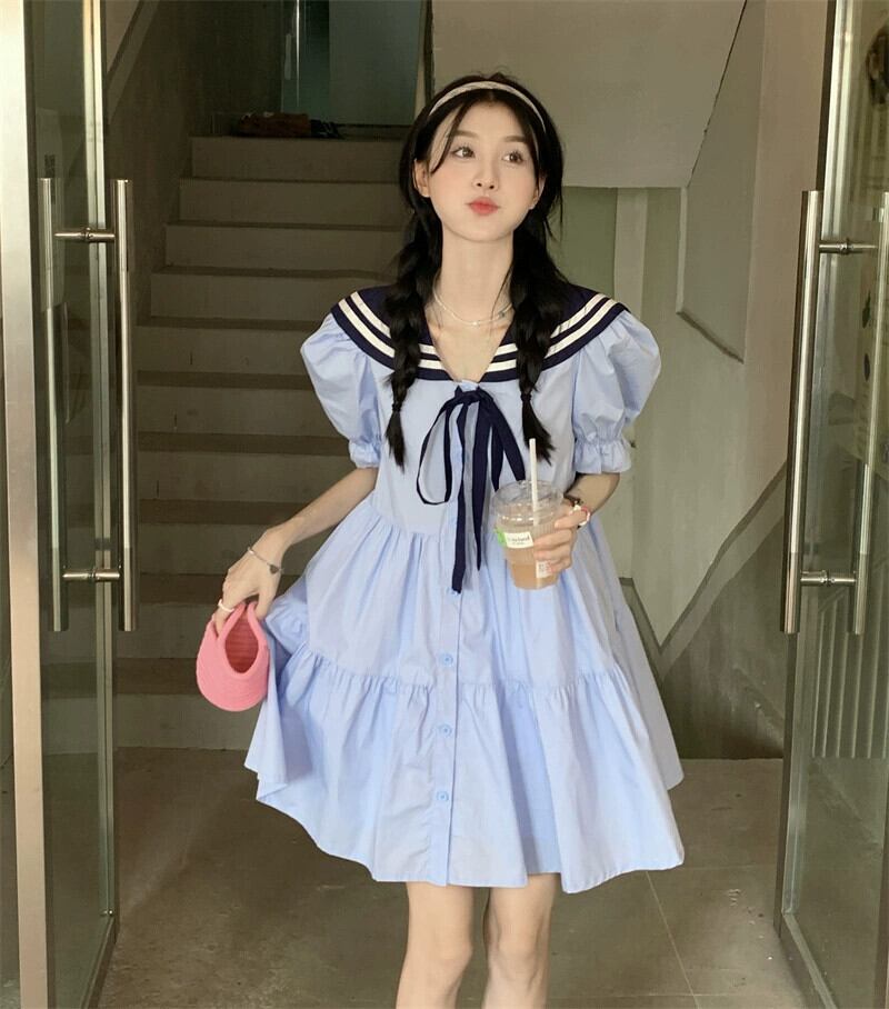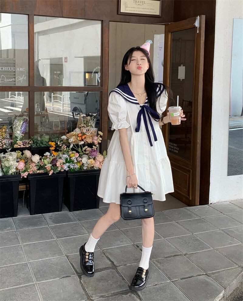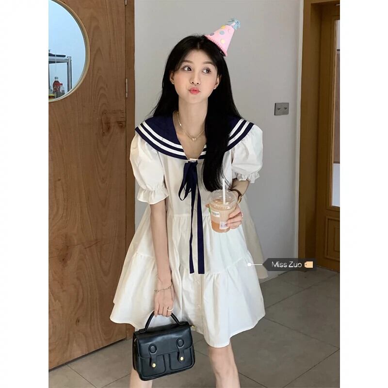 ネイビーカラーの白いドレスの女性の小さな夏ニッチデザイン甘い年齢削減カバー腹パフスリーブスカート ホワイト 大人ガーリー スウィート キュート カジュアル サマー 夏物 8571694399149839