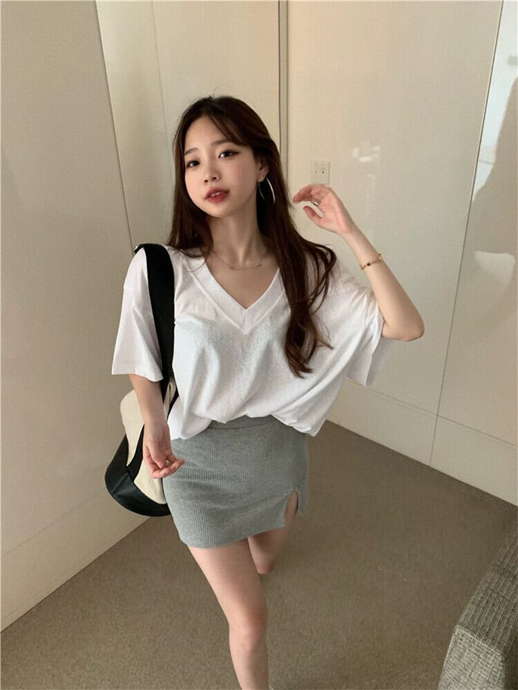 黒の V ネック半袖 T シャツの女性の 2023 夏の新しいデザイン感覚のニッチな小さい緩い甘いトップ ブラック 大人ガーリー スウィート キュート カジュアル サマー 夏物 Vネック Tシャツ 8571693129446608