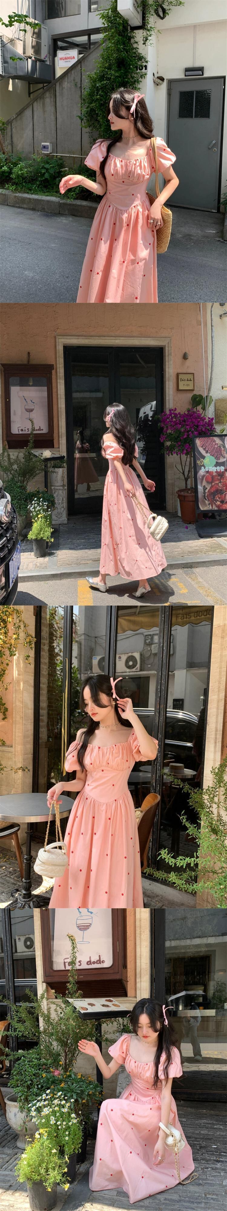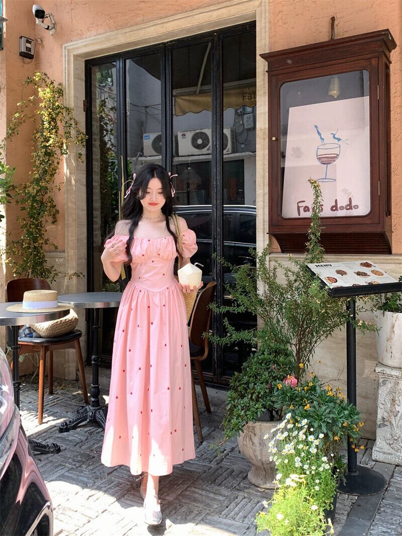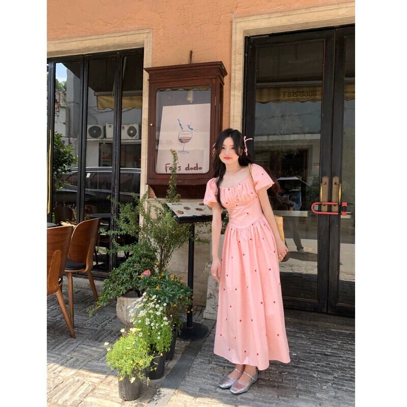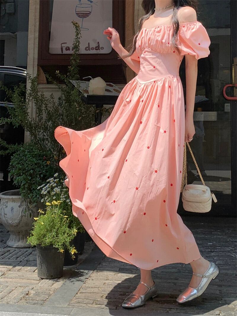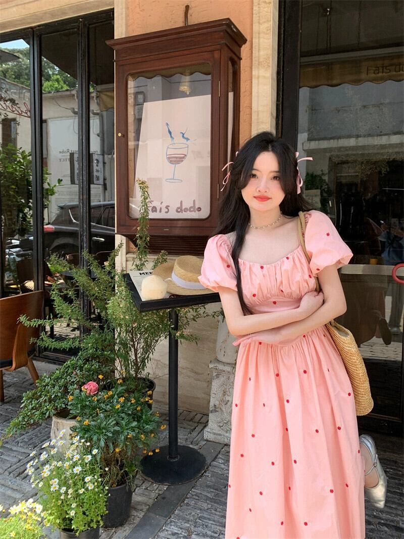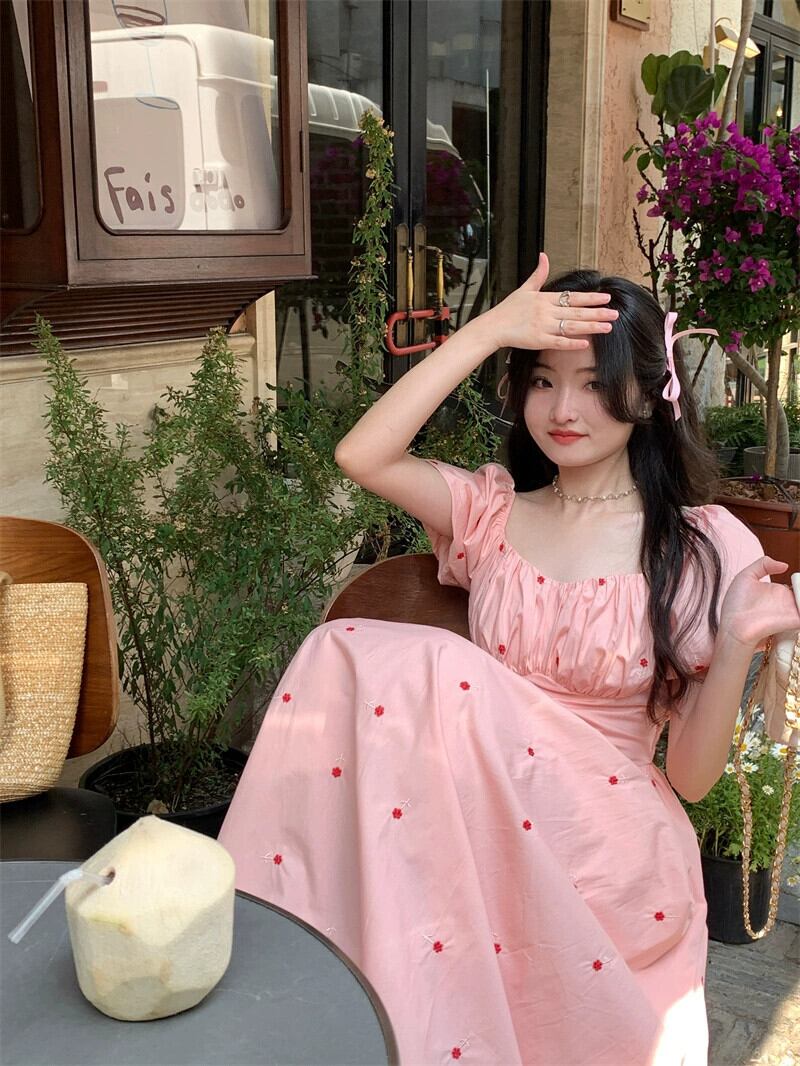 ピンクパフスリーブドレスの女性の夏 2023 フレンチスタイル甘い初恋優しい刺繍スクエアカラーロングスカート レッド 大人ガーリー スウィート キュート カジュアル サマー 夏物 スクウェア 8571697310170906