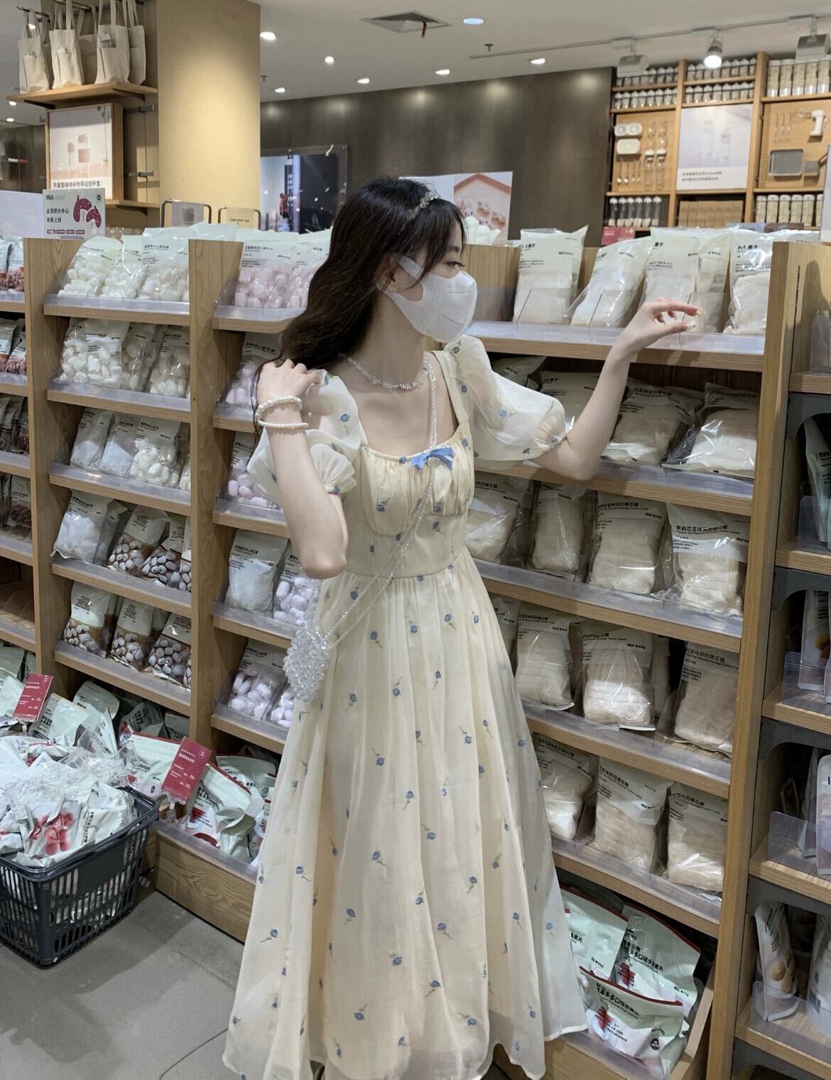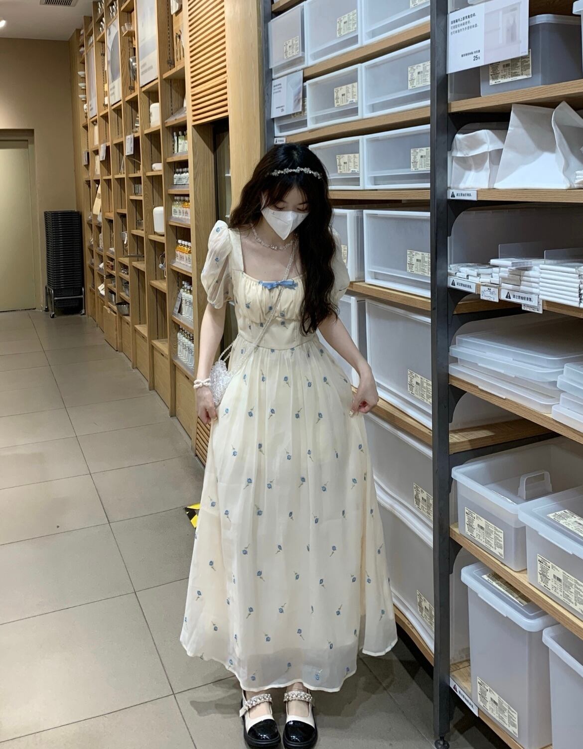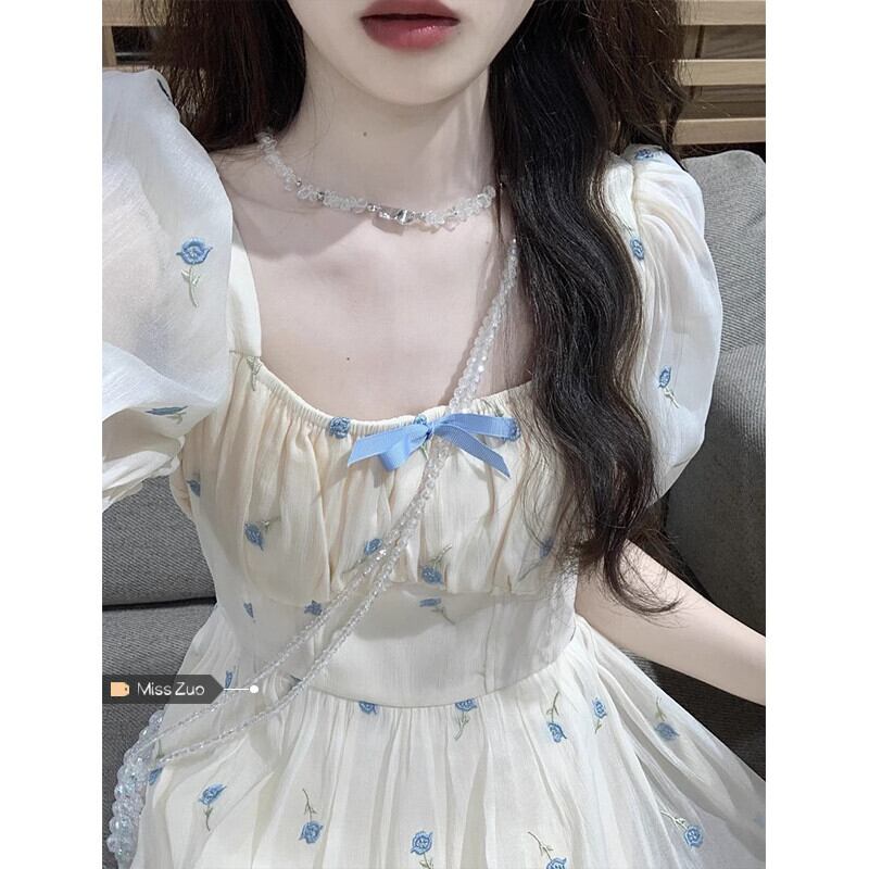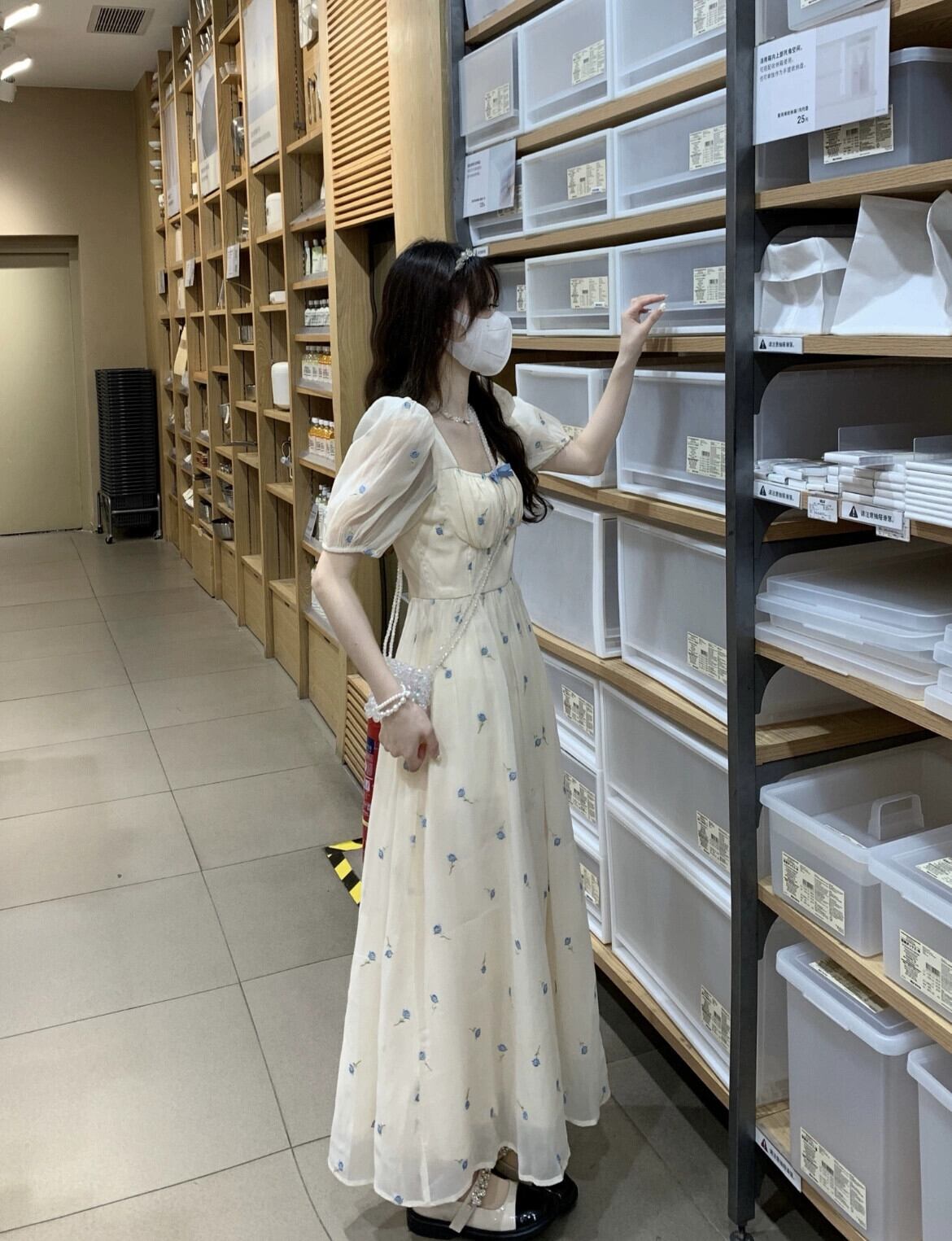 パフスリーブ花柄ドレスレディース夏ニッチセンスフレンチ初恋スーパーフェアリー優しい風スクエアネックロングスカート サマー 夏物 スクウェア 8571621098758646