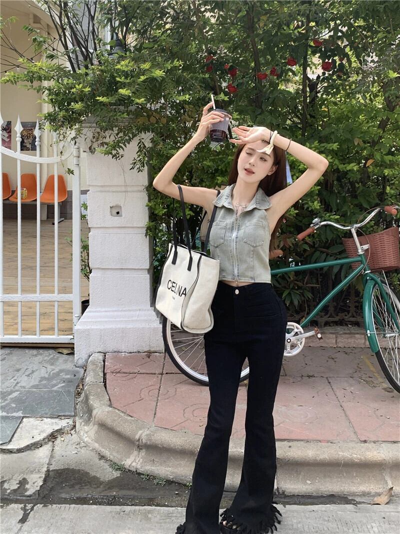 ジッパーデニムベストレディース夏アウターデザインセンスニッチ純粋な欲望セクシーなノースリーブホルターネックホルタートップ サマー 夏物 ピュア 8571691997195037