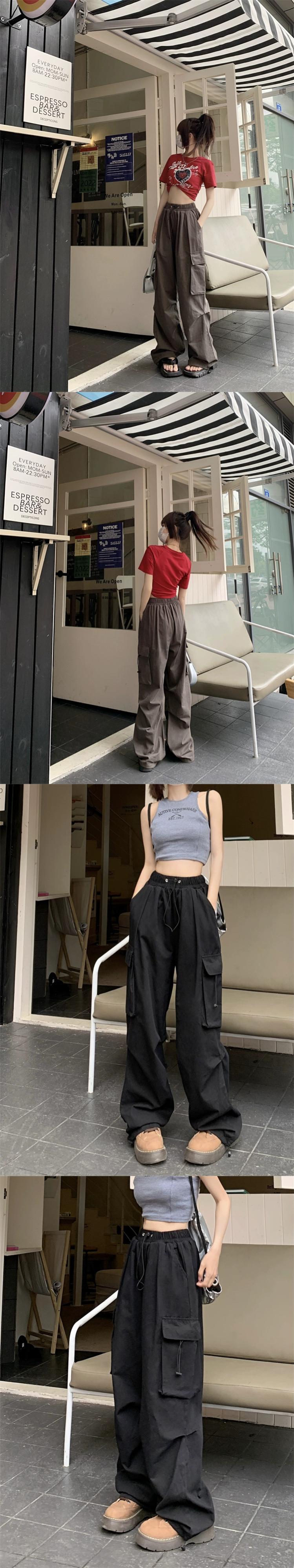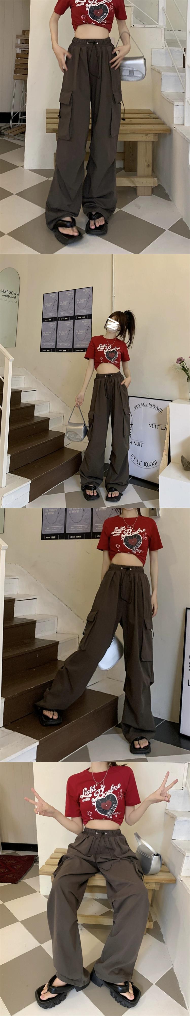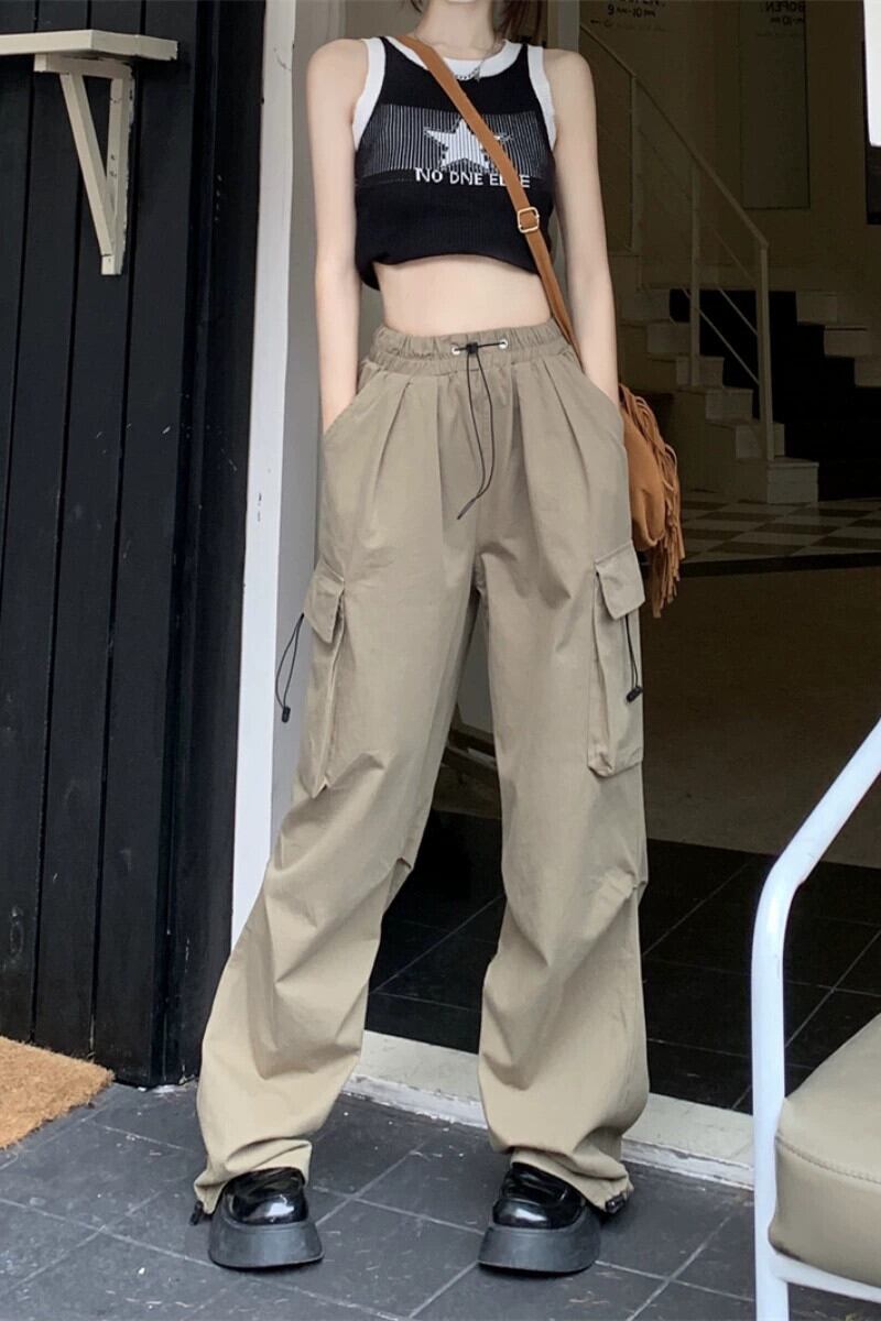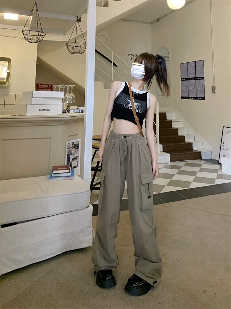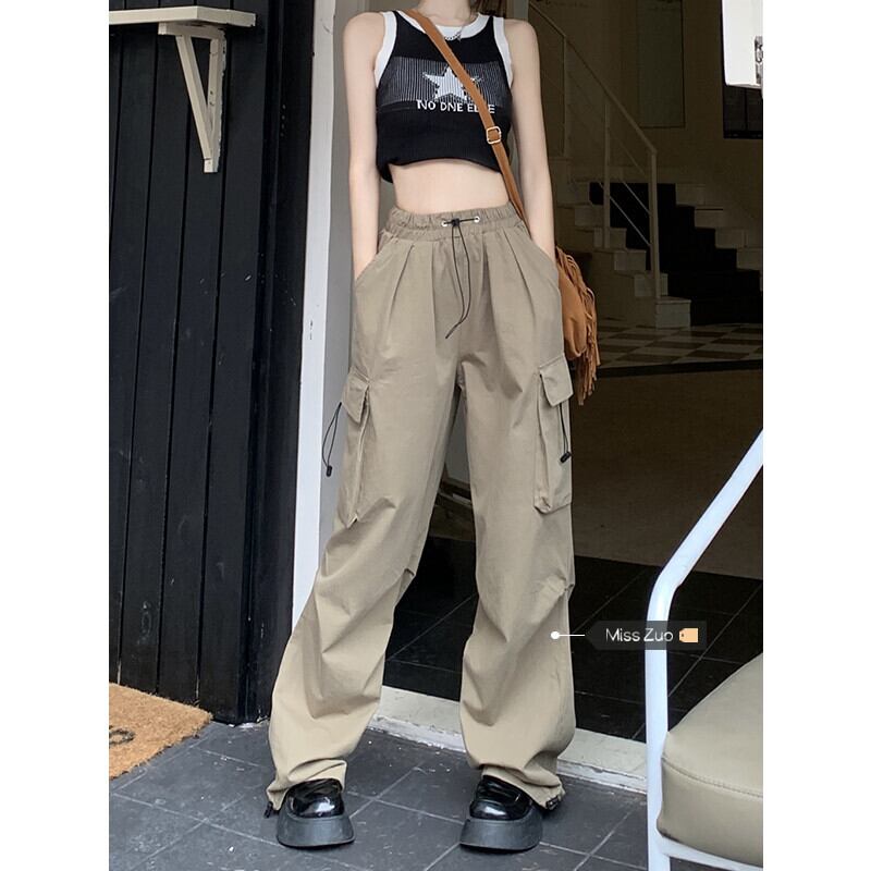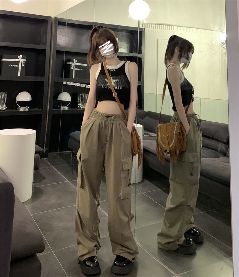 アーミーグリーンアメリカンオーバーオールレディース夏デザインセンスニッチモップワイドパンツハイウエストストレートカジュアルロングパンツ ハイウェスト サマー 夏物 8571639418639179
