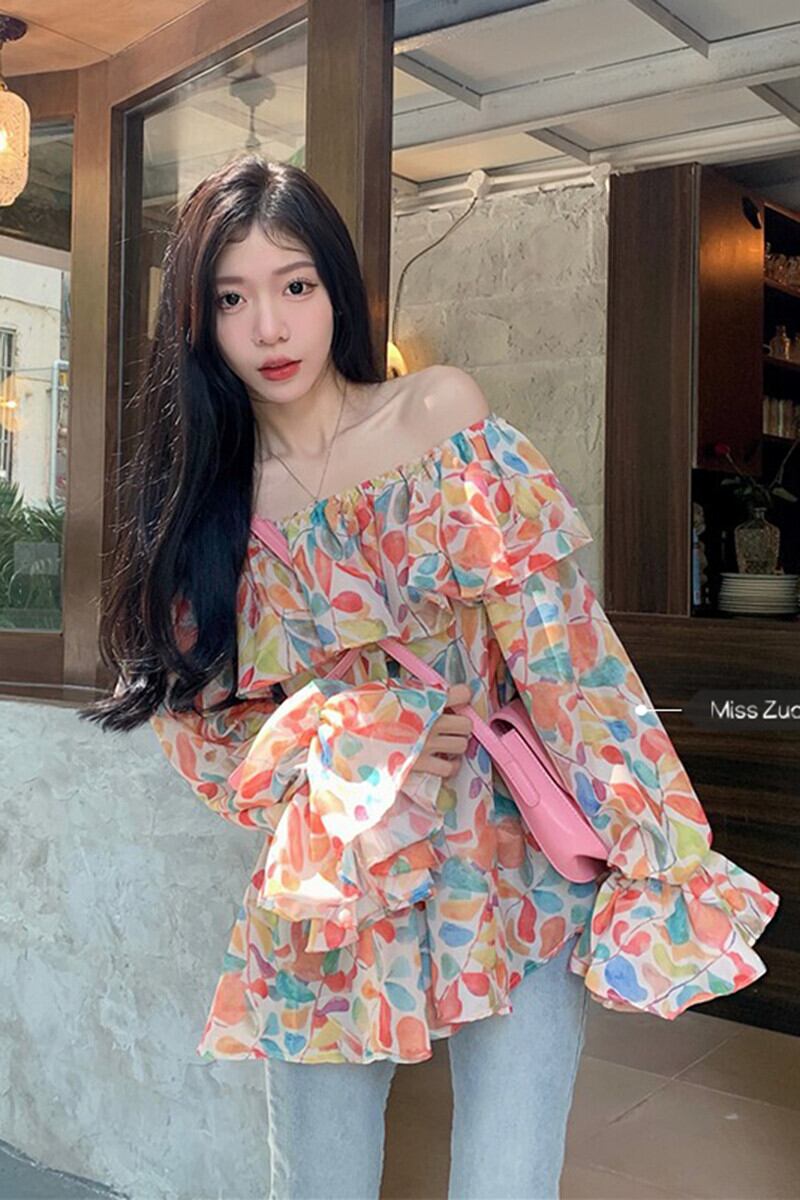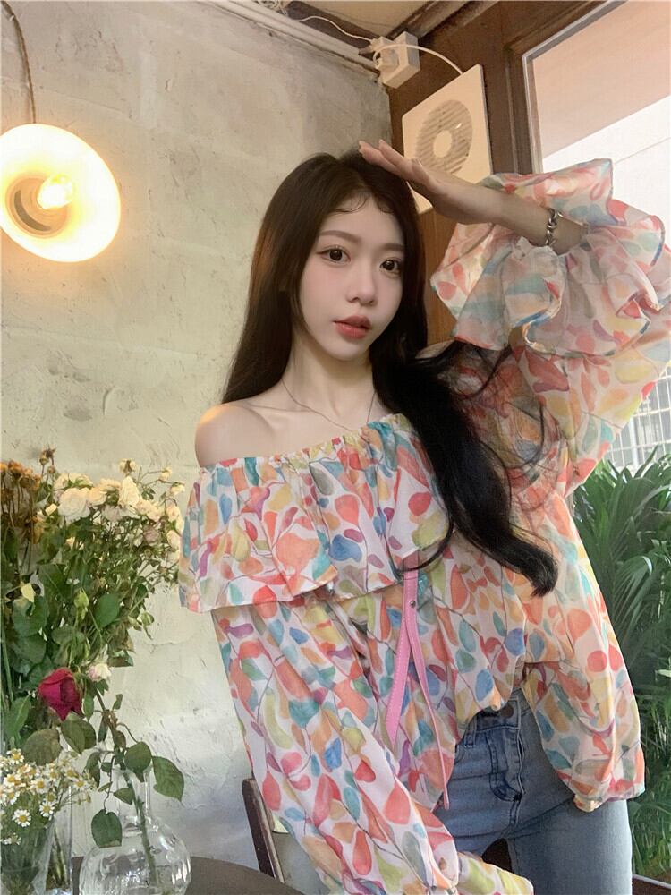 ワンショルダートップレディース春ハイエンドデザインセンスニッチフレンチ露鎖骨優しい気質長袖プリントシャツ ロング スプリング 春物 857167707791626