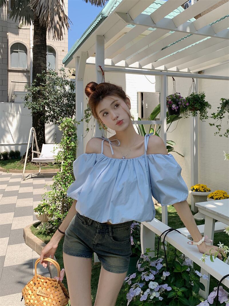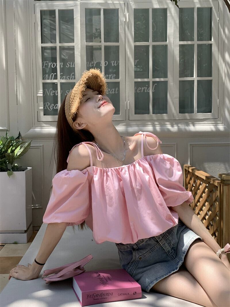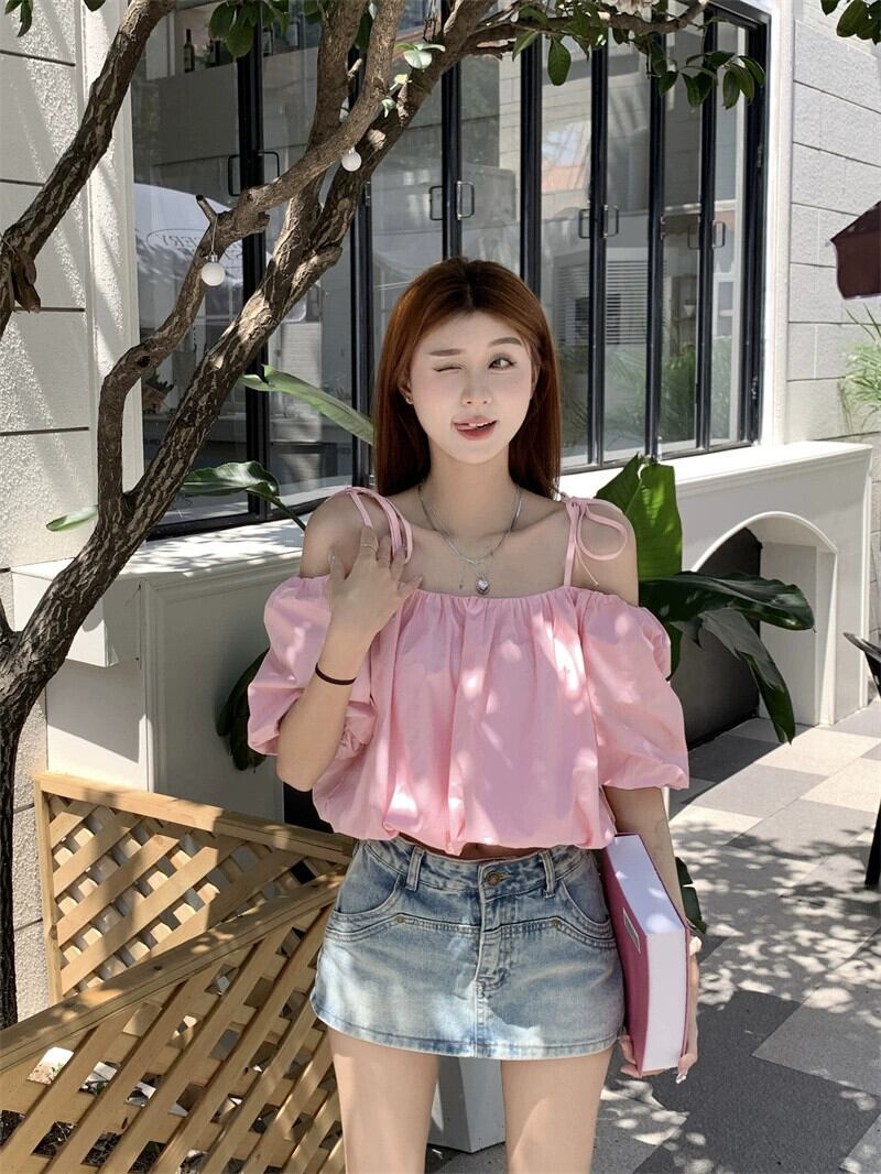 ピンクのワンショルダートップレディースデザインセンスニッチシャツ夏フレンチスイートパフスリーブショート半袖シャツ 大人ガーリー スウィート キュート カジュアル サマー 夏物 8571674442822558