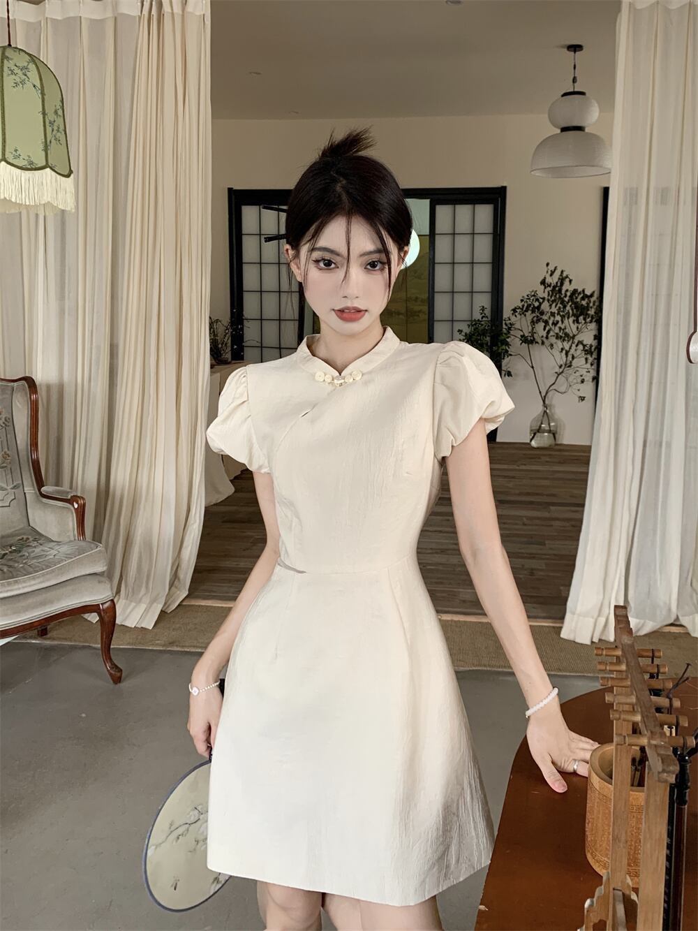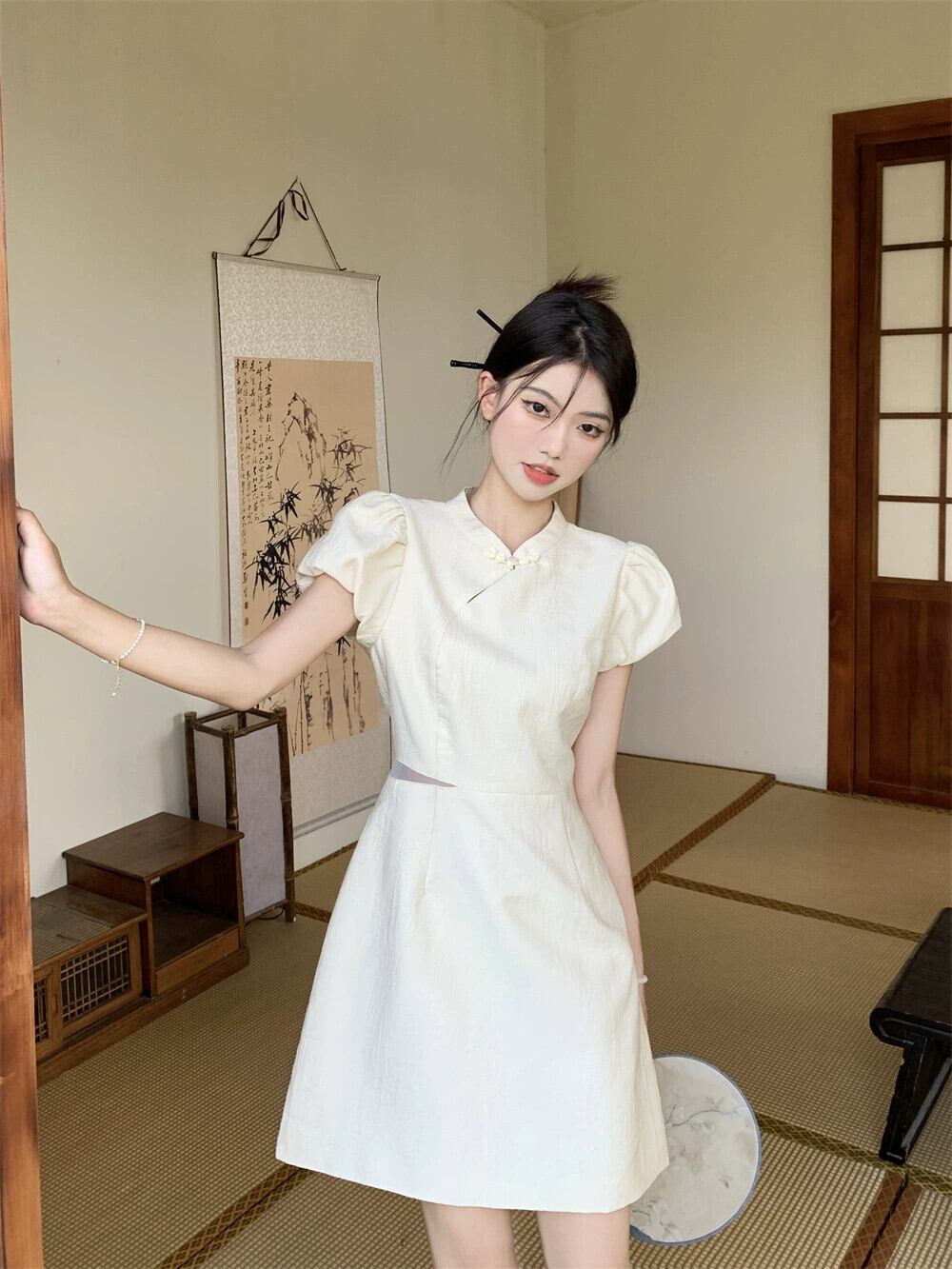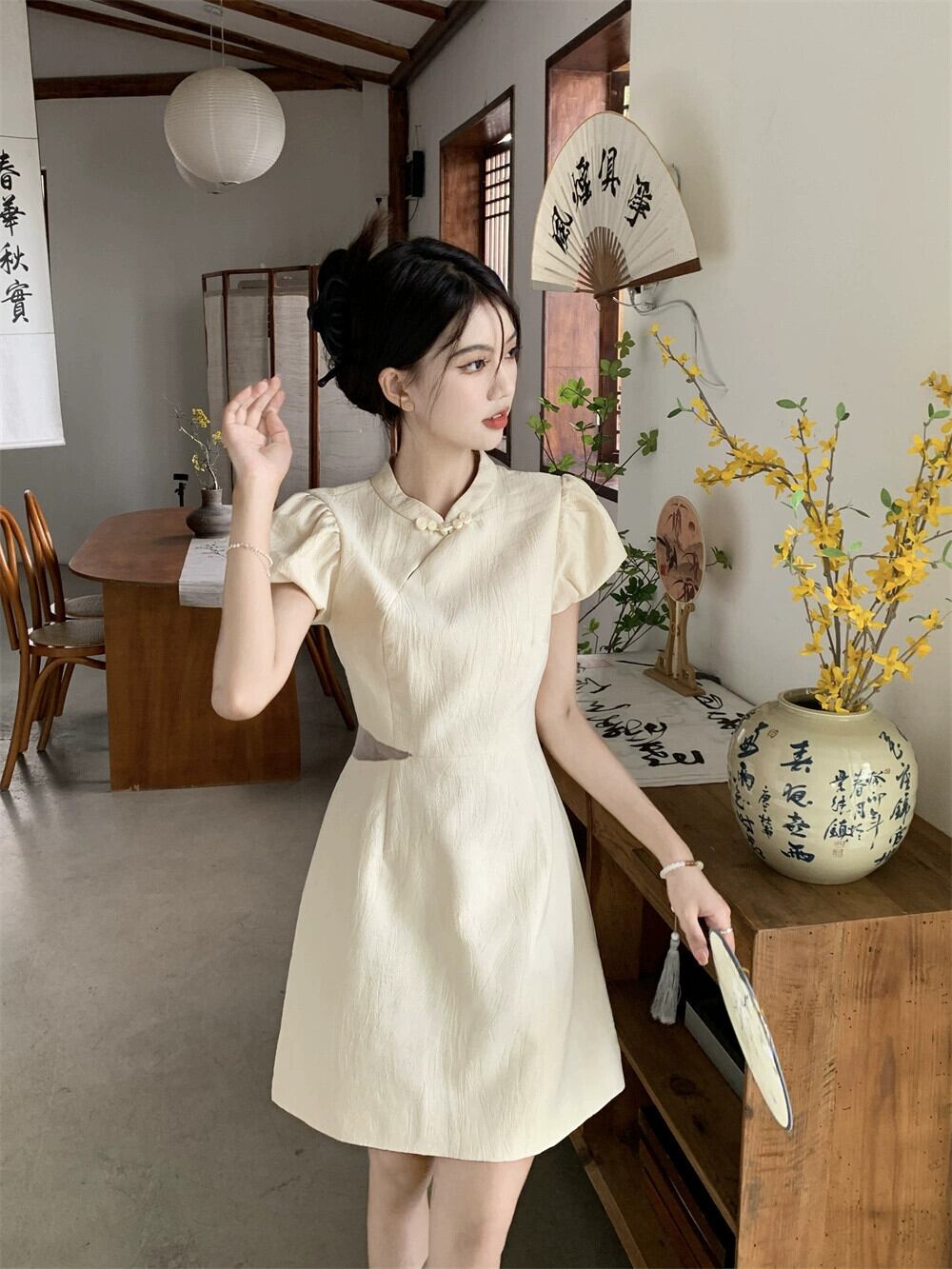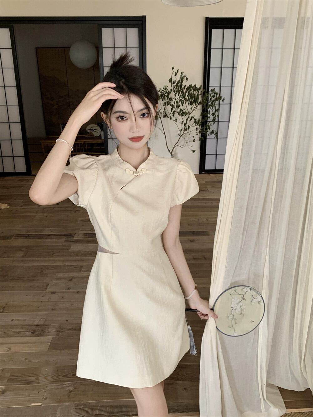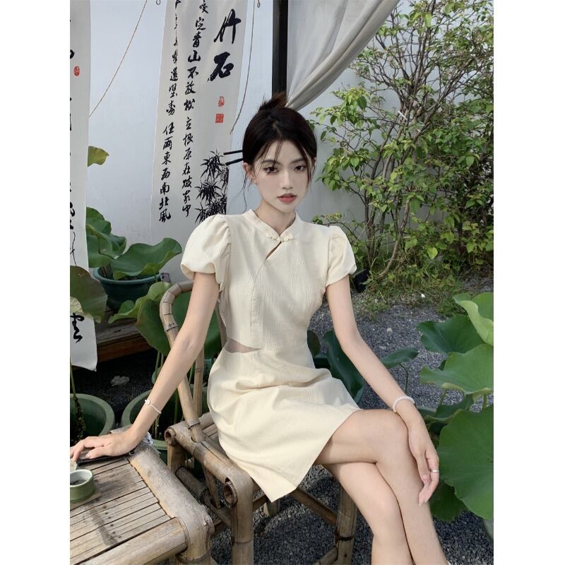 改良されたチャイナドレス女性の夏ニッチデザインセンス新しい中国風国民風中空アウトウエストパフスリーブショートスカート サマー 夏物 8571694354323725