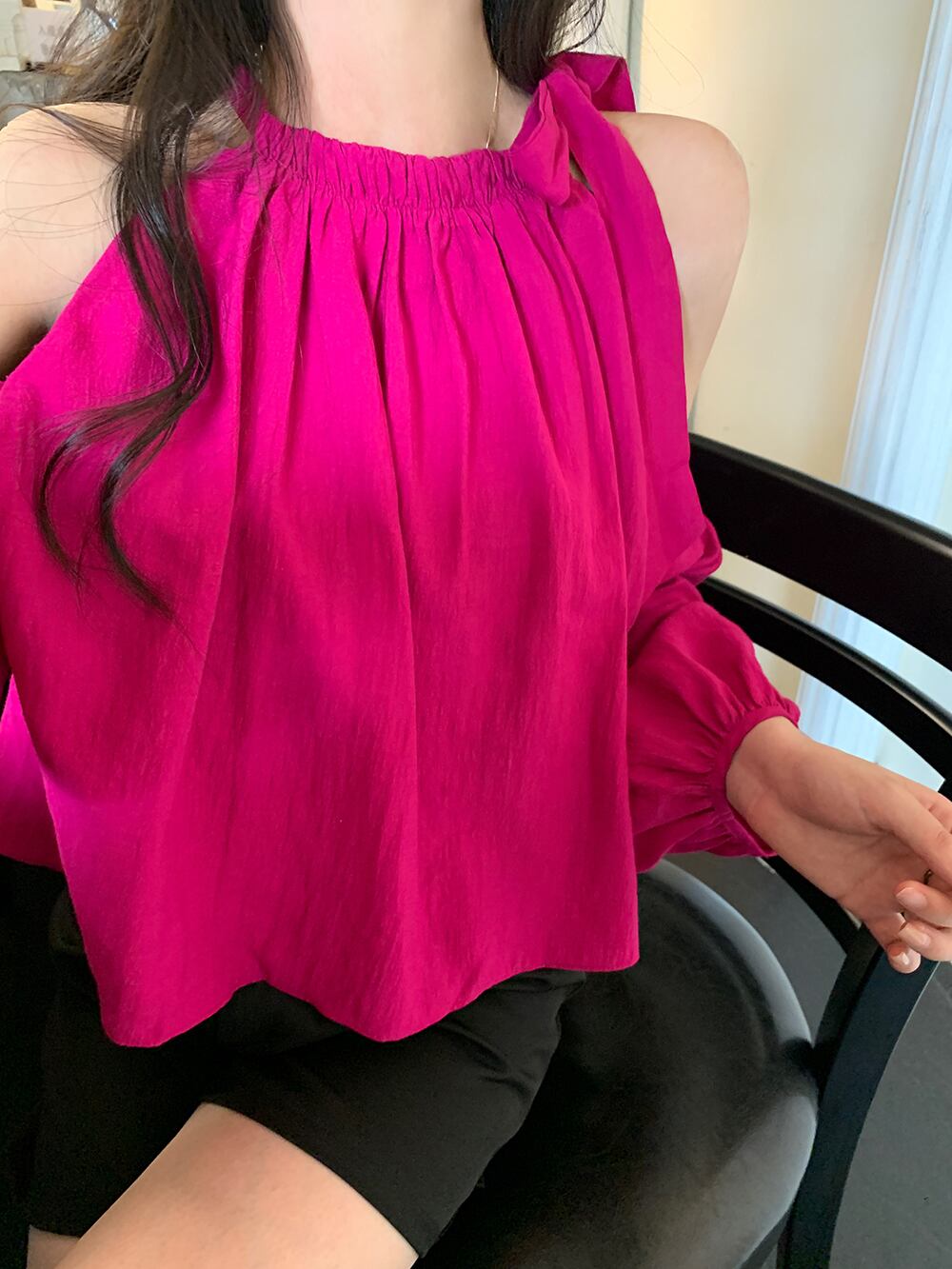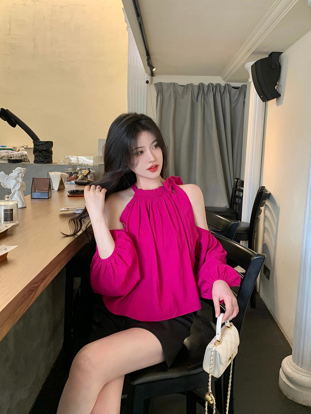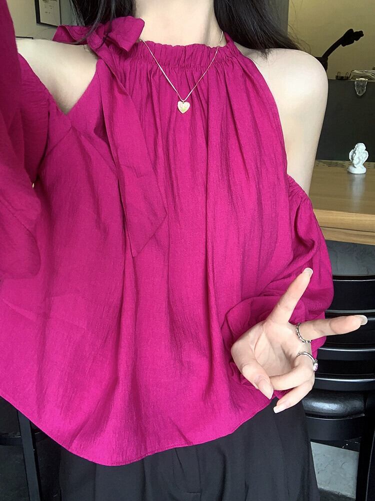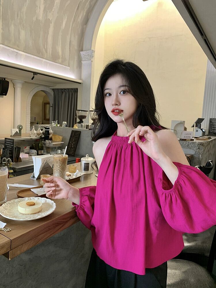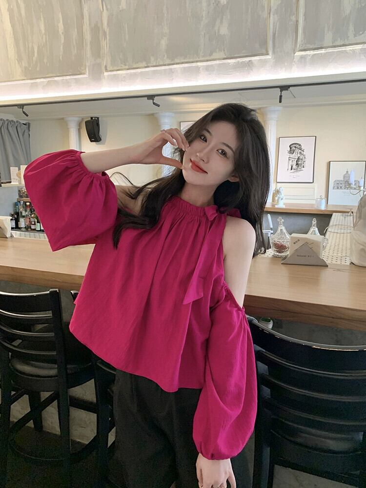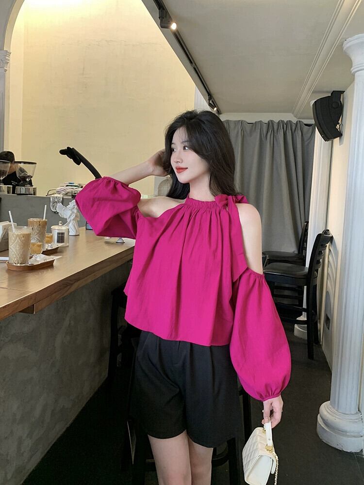 オフショルダーショートトップレディース夏デザインセンスニッチフランスの優しい気質シックなドラゴンフルーツカラー長袖シャツ ロング サマー 夏物 8571687266866847