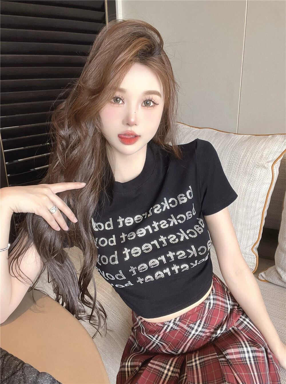 レターダイヤモンド半袖Tシャツレディース夏デザインセンスニッチアメリカンスリムホワイトフロントショルダーショートトップ サマー 夏物 8571675798834152