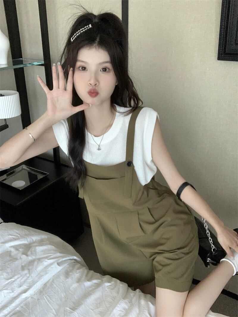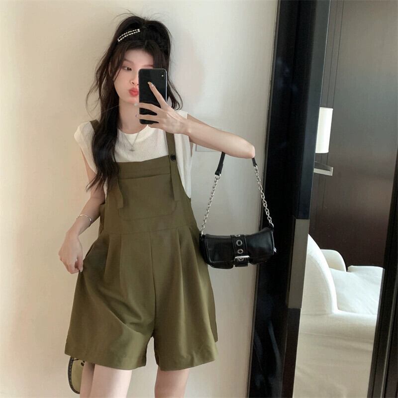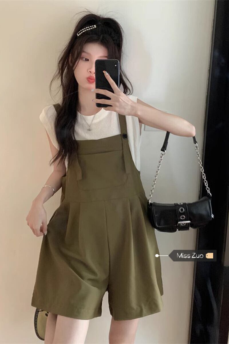 グリーンオーバーオールショートパンツ女性小男性夏2023新しいミルクフフeignスタイル年齢減少ルーズワイドレッグパンツ サマー 夏物 ショーツ ブルマー 8571627766208320