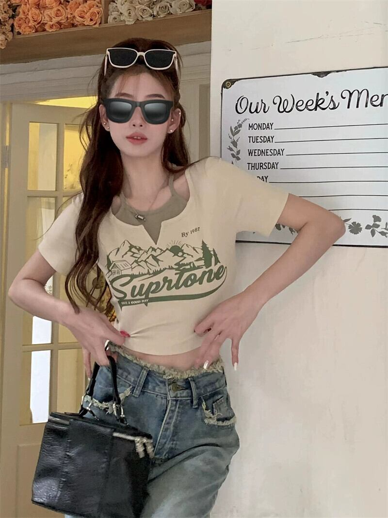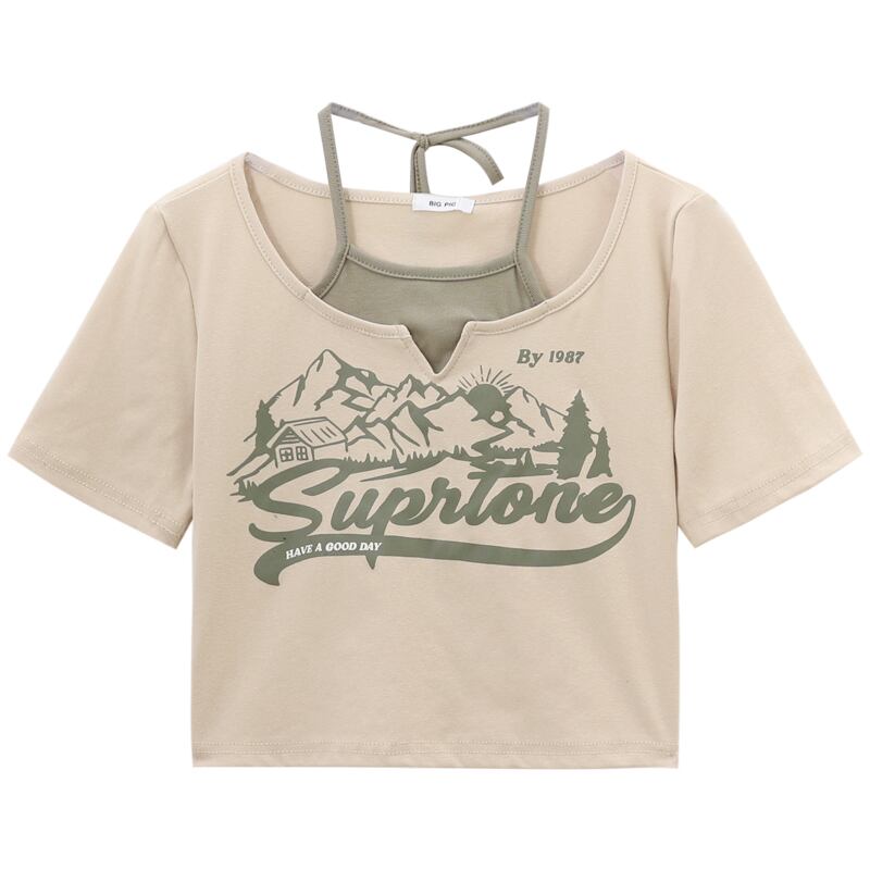アプリコット吊りネック半袖Tシャツレディース2023年夏新デザインセンスニッチ純粋欲望スリムショートトップ サマー 夏物 ピュア 8571662765674859