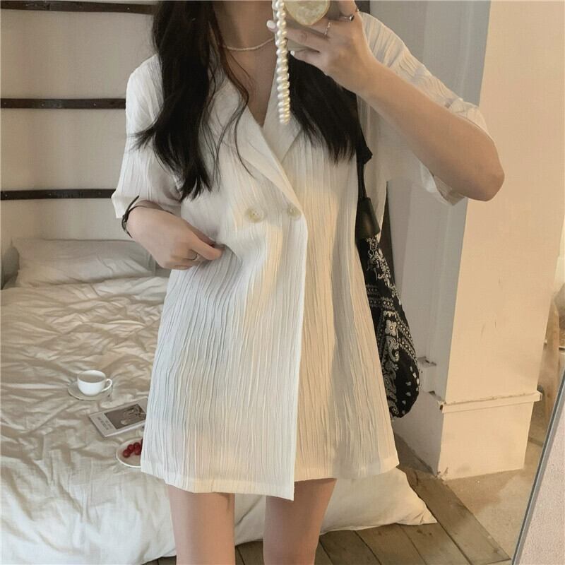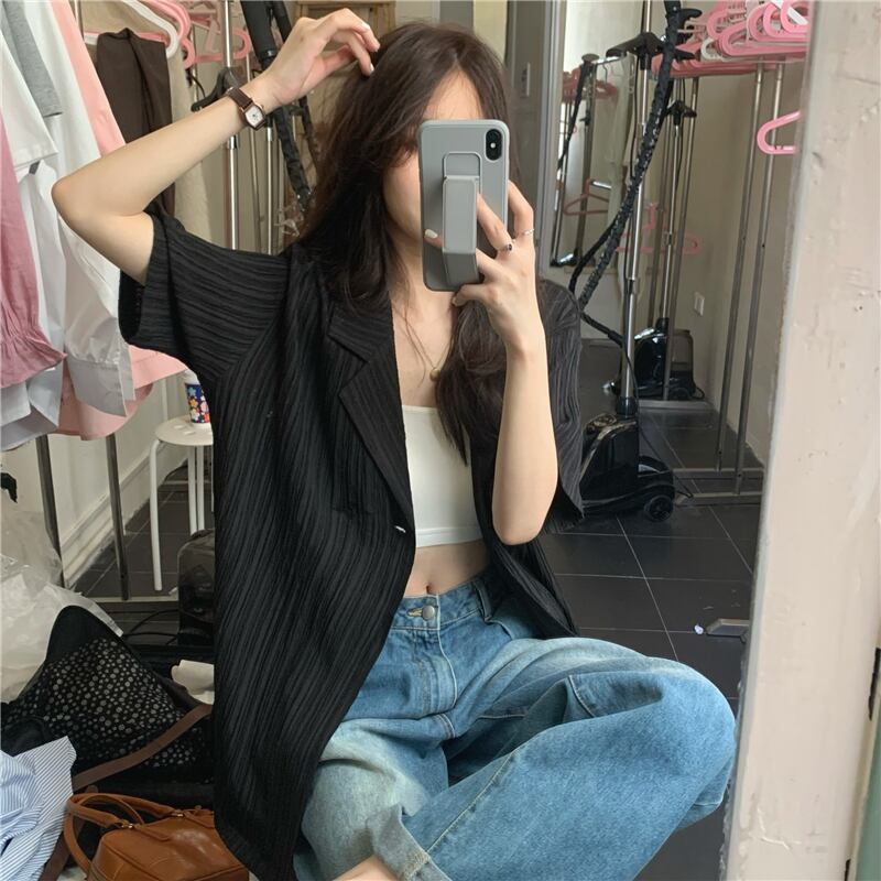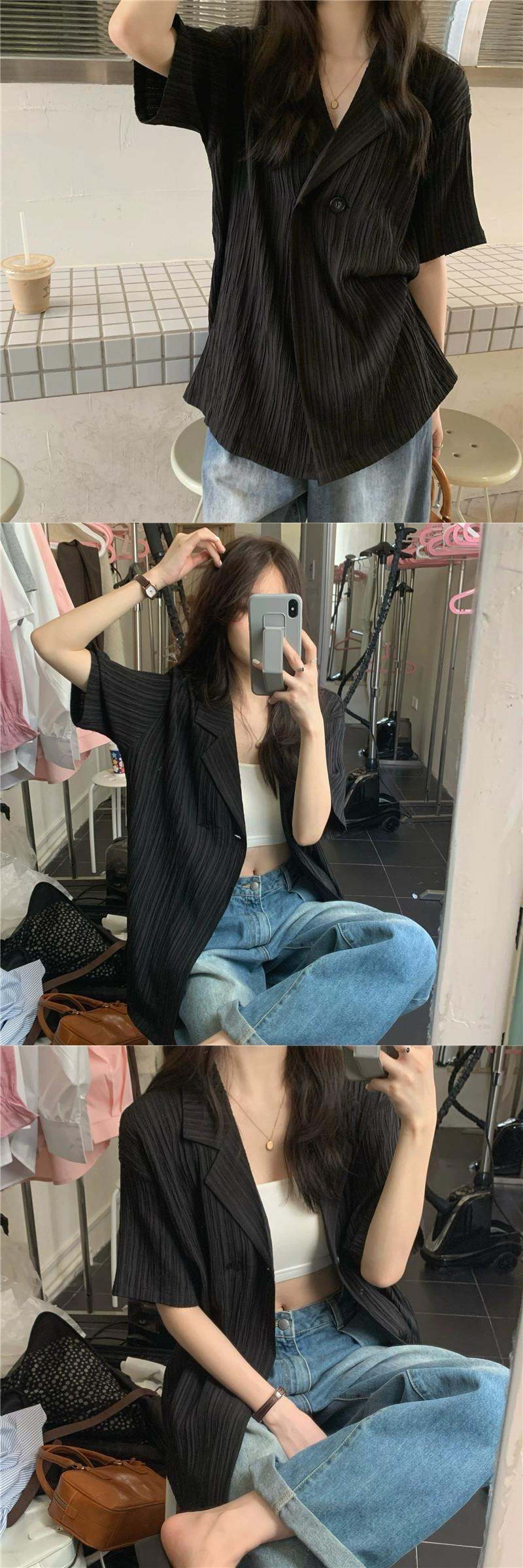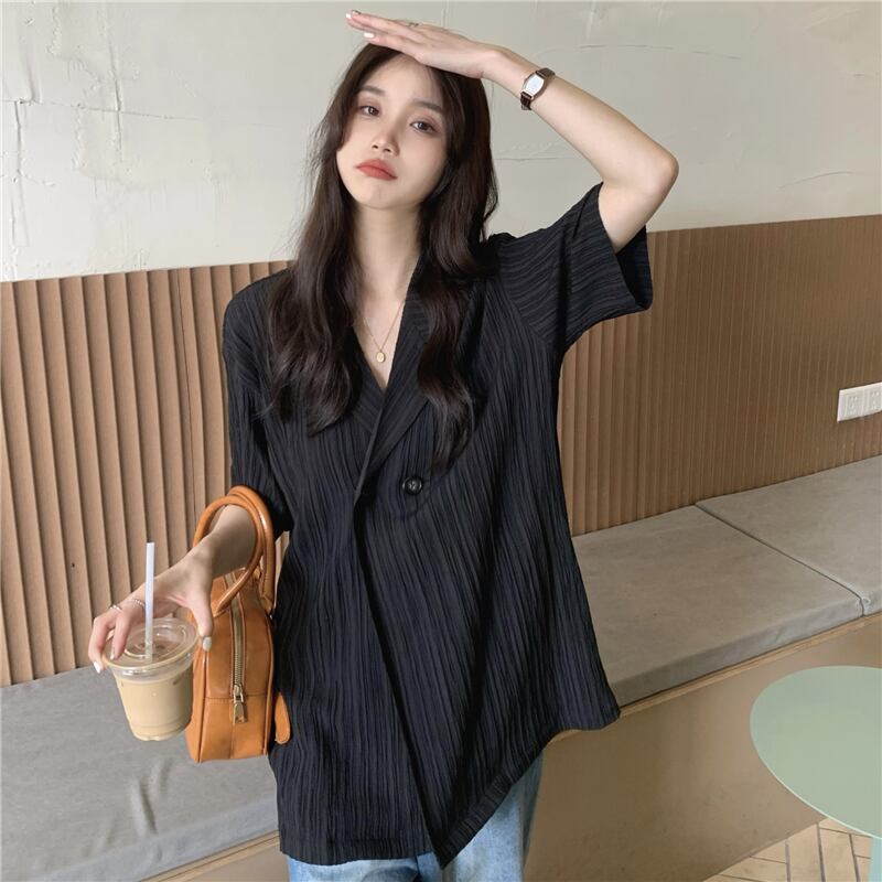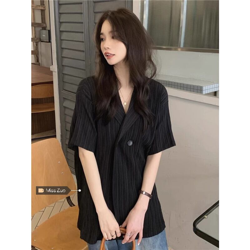 黒半袖スーツシャツジャケット女性の夏の気質ハイエンドデザインセンスニッチ香港スタイルシックなルーズトップ ブラック サマー 夏物 8571626751386473