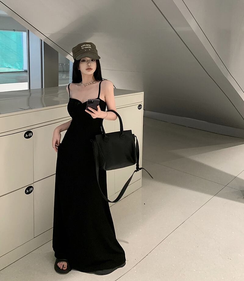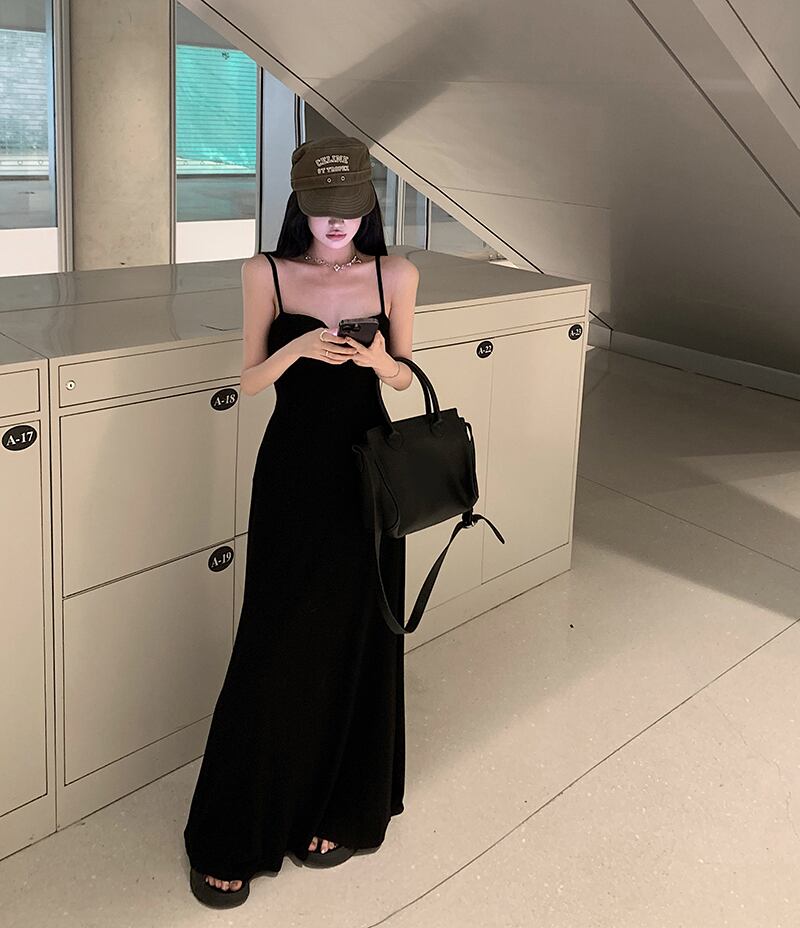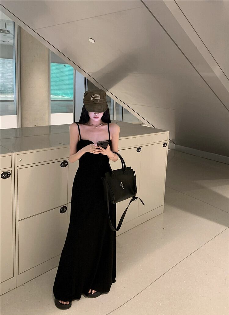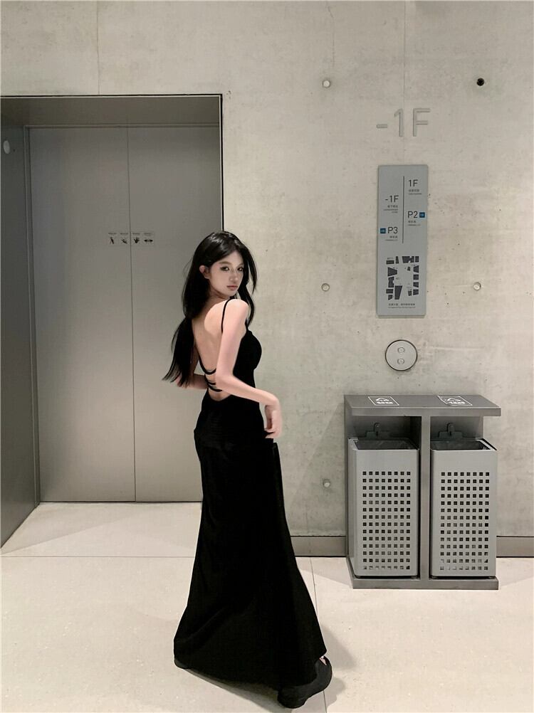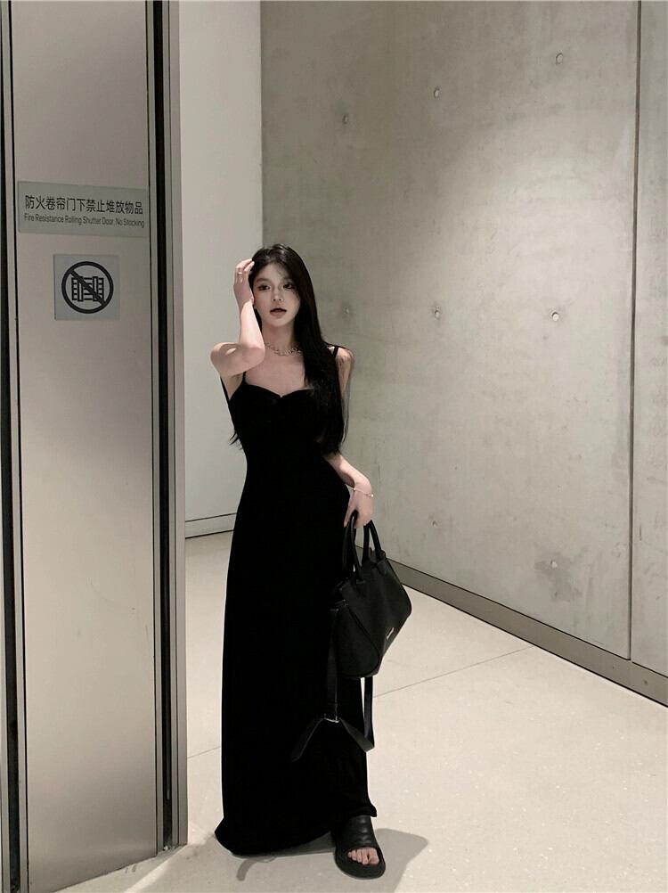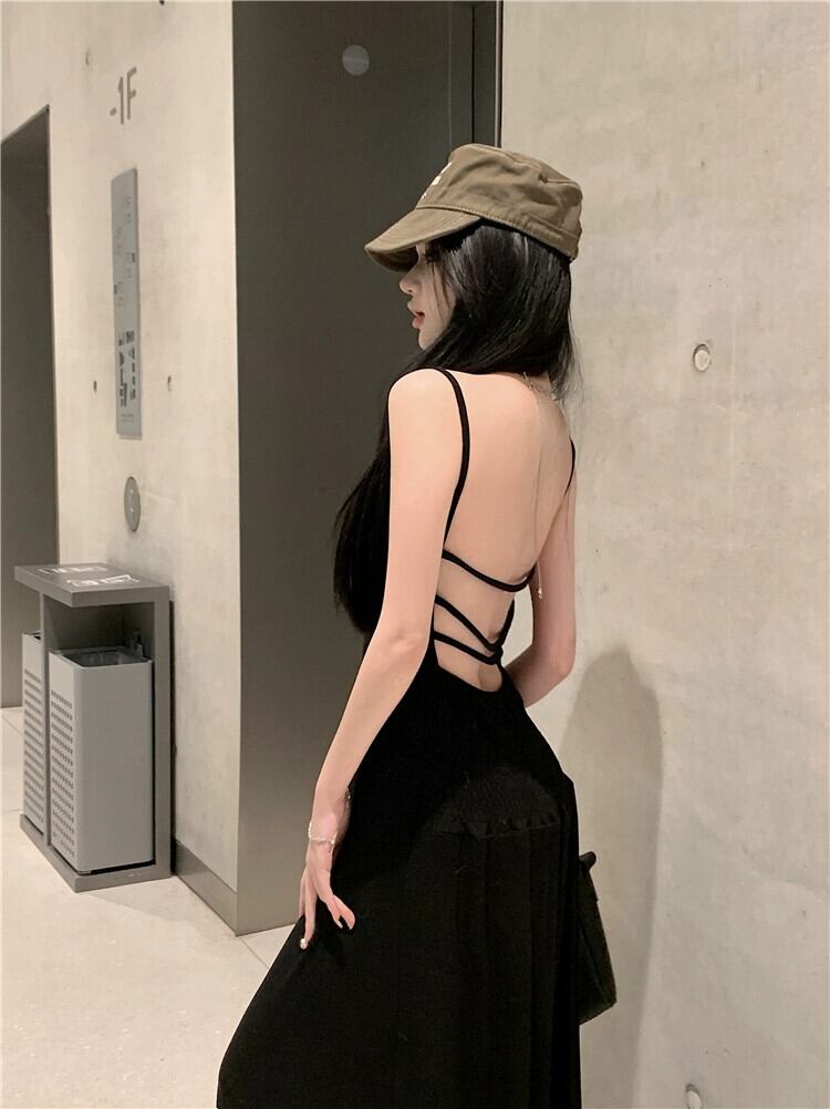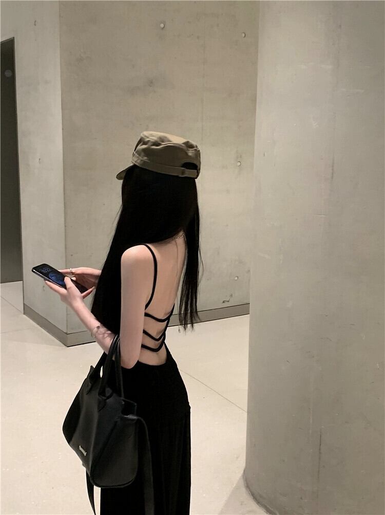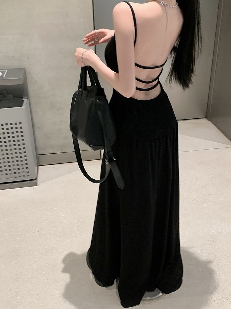 サスペンダードレス レディース 夏 フレンチヘップバーンスタイル リトルブラックドレス 気質エンドセンス 胸パッド付き バックレスロングスカート サマー 夏物 8571644975603940