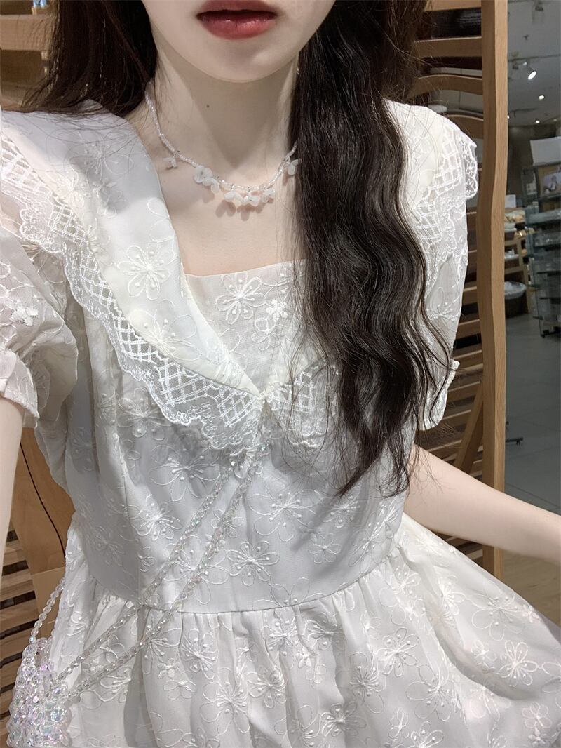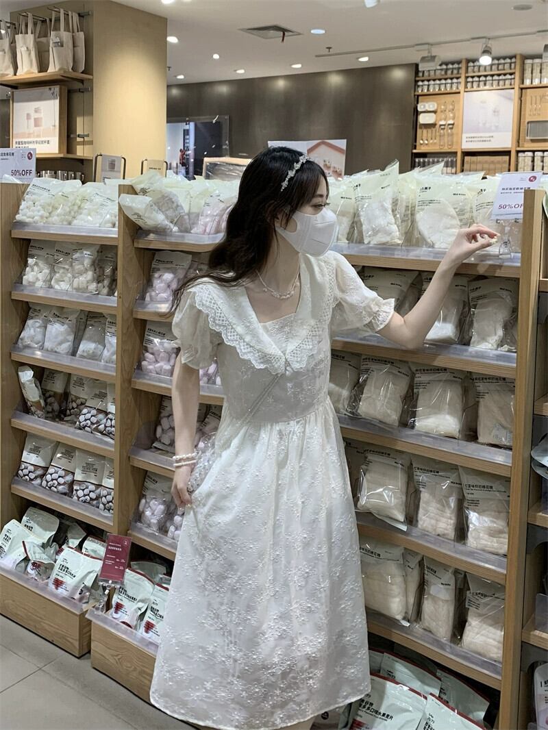 アプリコット人形襟ドレス女性の夏 2023 新しいフレンチスタイルの優しい風初恋スーパー妖精パフスリーブロングスカート サマー 夏物 8571641223586942
