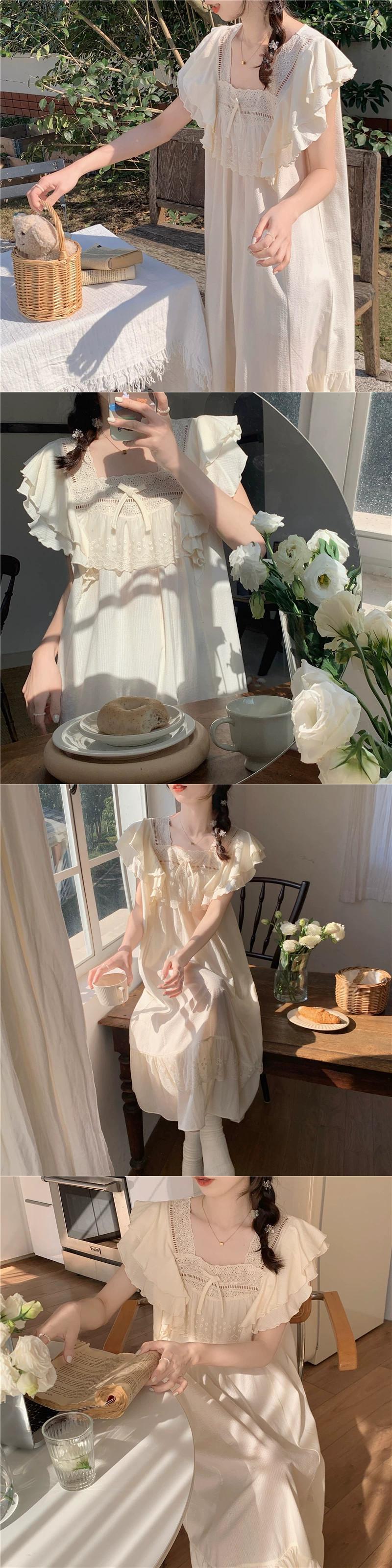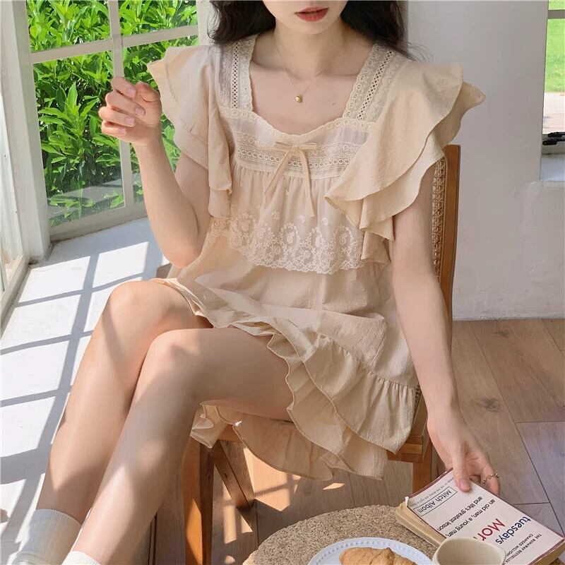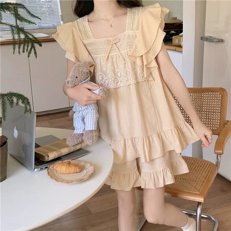 ベージュ宮殿スタイルパジャマ女性の夏の 2023 新しいハイエンドセンスネットレッドスタイル ese スイートホームサービススーツ レース 大人ガーリー スウィート キュート カジュアル サマー 夏物 8571615761229357