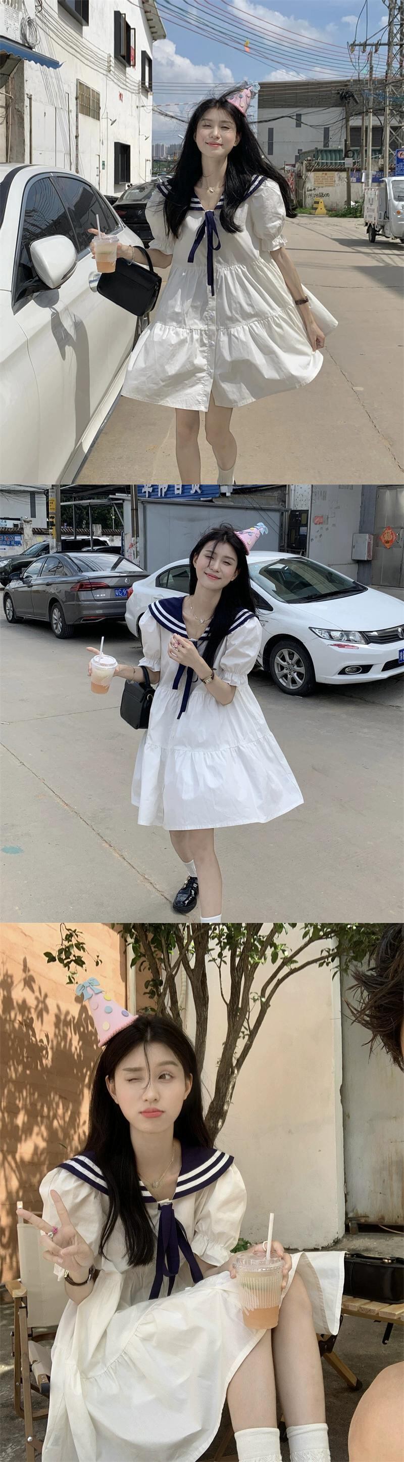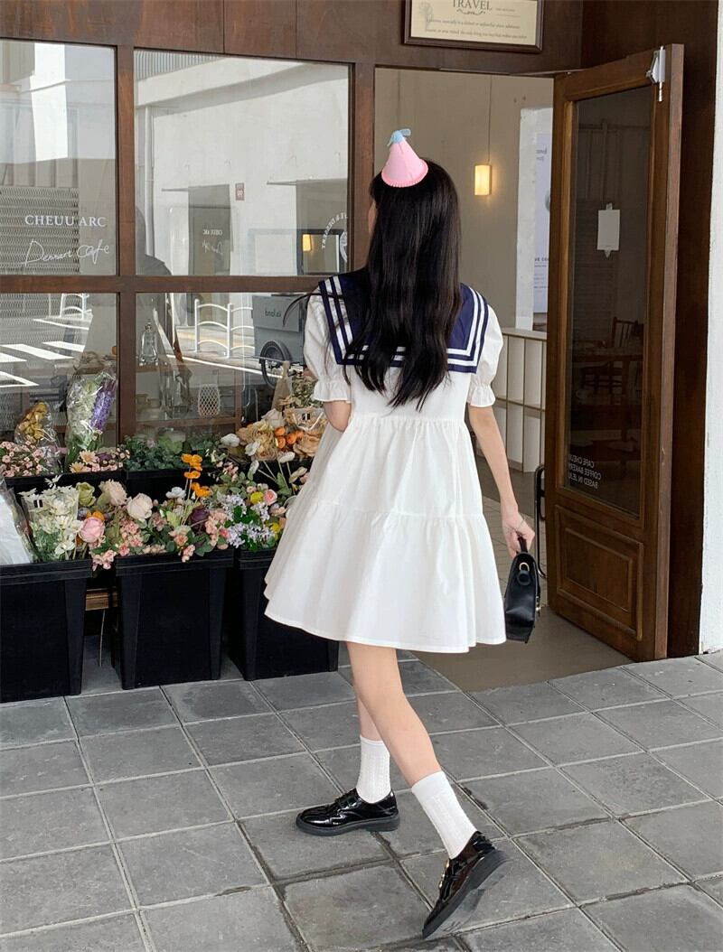 ブルー ネイビー カラー シャツ ドレス レディース サマー プレッピー スタイル 甘くて年齢を軽減する小柄な男性のお腹をカバーするパフ スリーブ スカート 大人ガーリー スウィート キュート カジュアル 夏物 8571677785451597