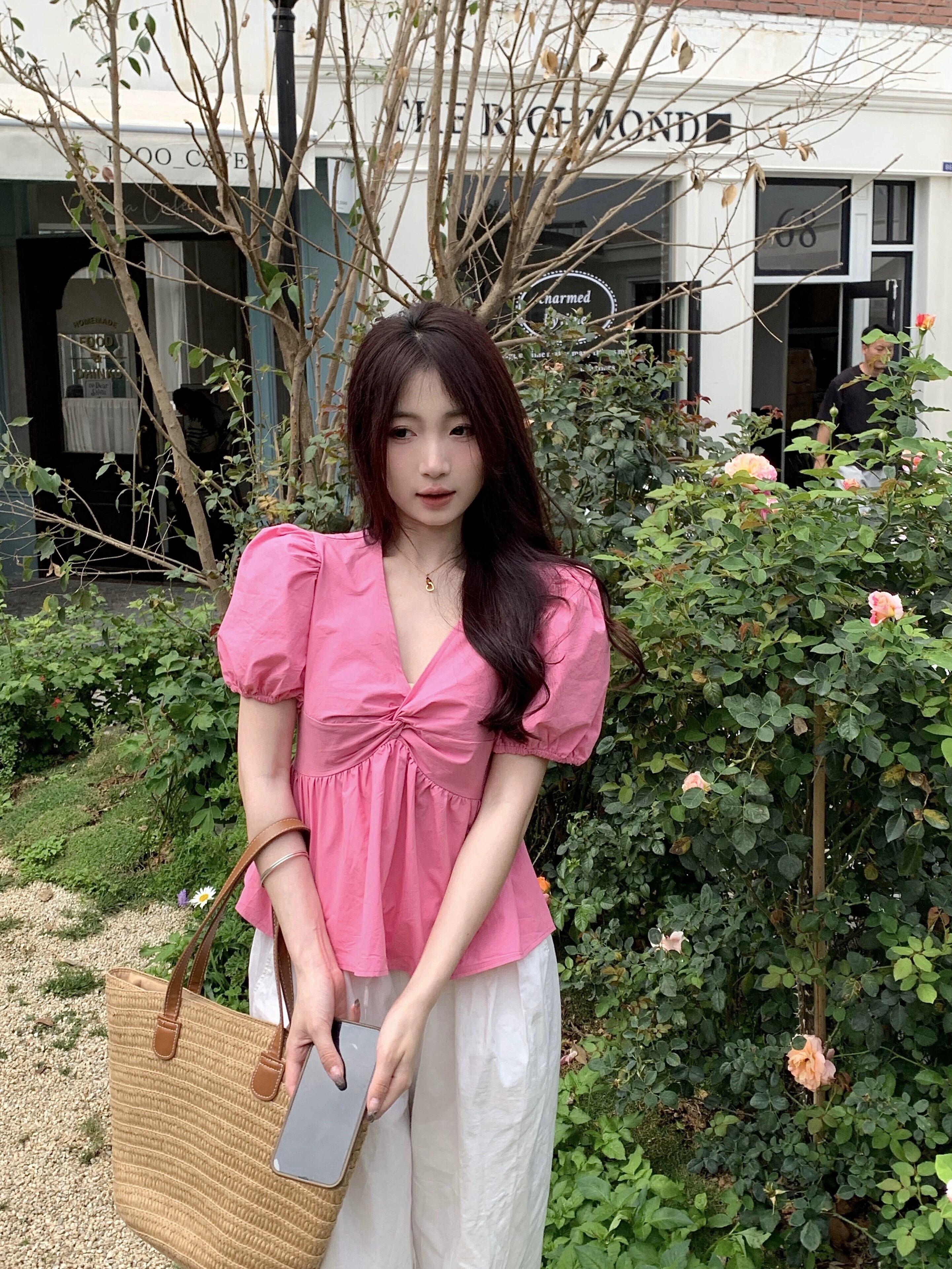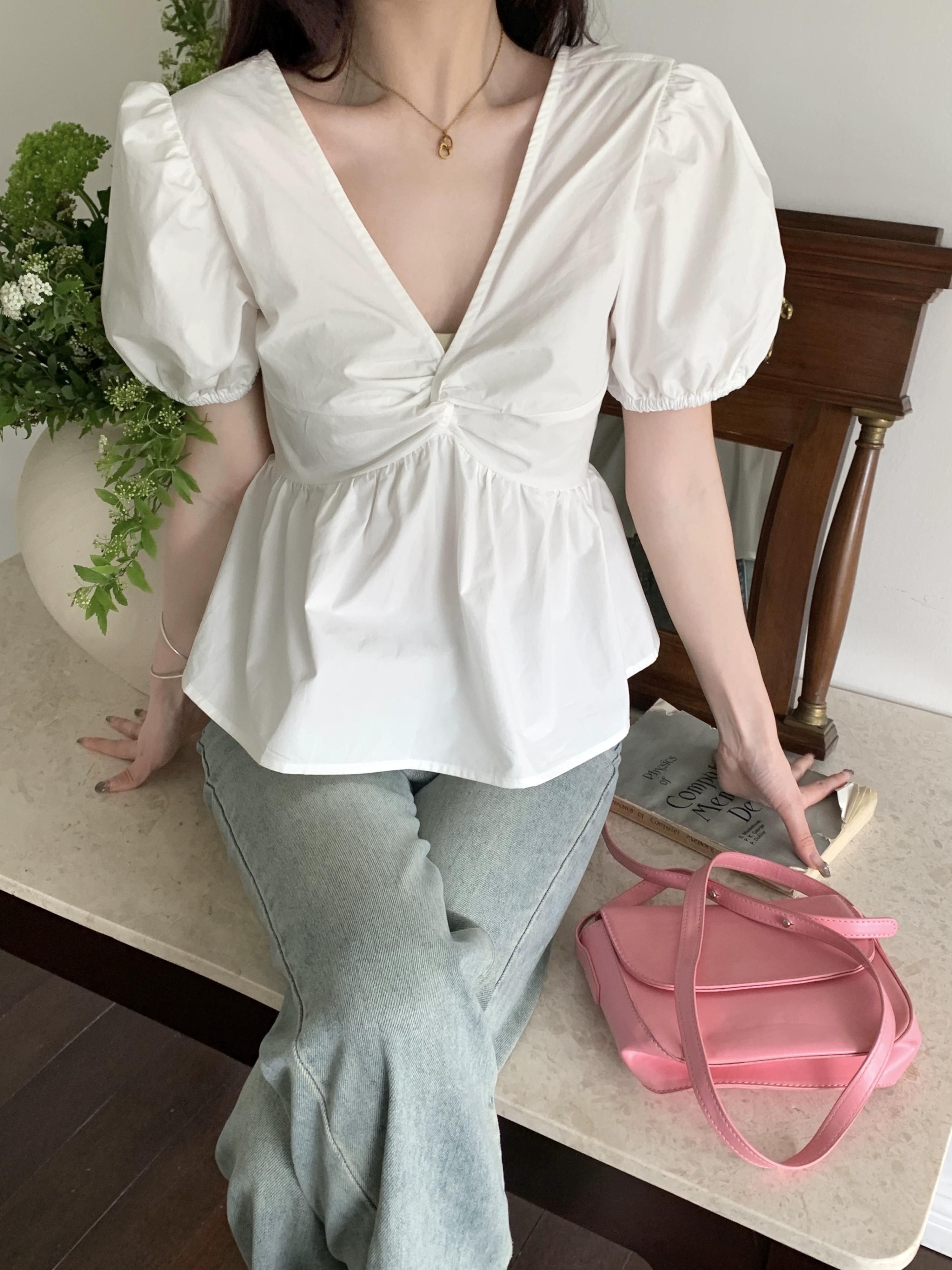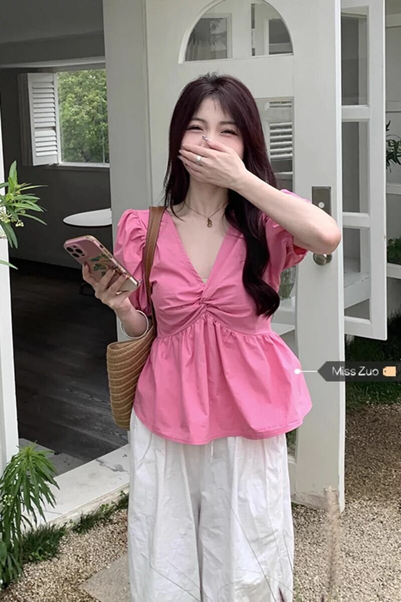 パフスリーブVネックトップスレディース夏デザインセンスニッチフランスの優しい気質ピンク大きいサイズ半袖シャツ 大きめサイズ サマー 夏物 8571624362837656