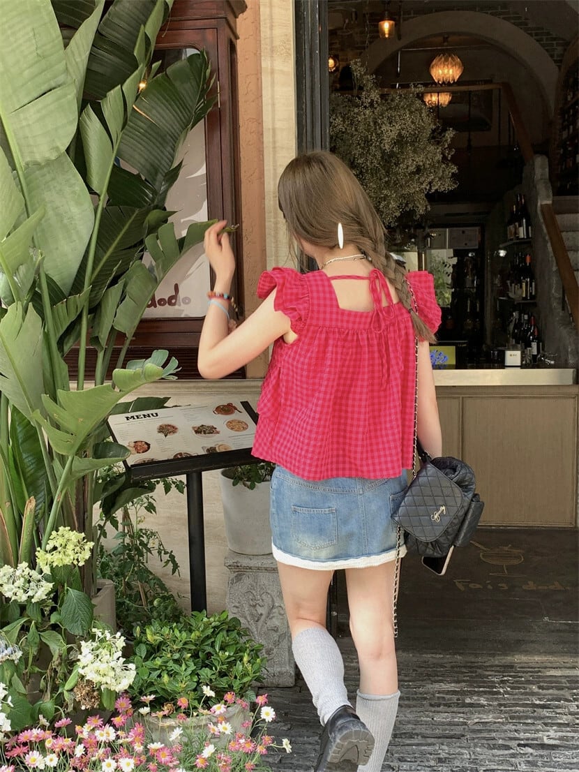 小さなフライングスリーブショートトップレディースサマーデザインセンスニッチスイートユニークシックでユニークなフリルチェック柄シャツ 大人ガーリー スウィート キュート カジュアル 夏物 8571682679837917