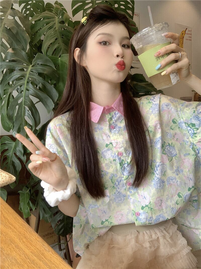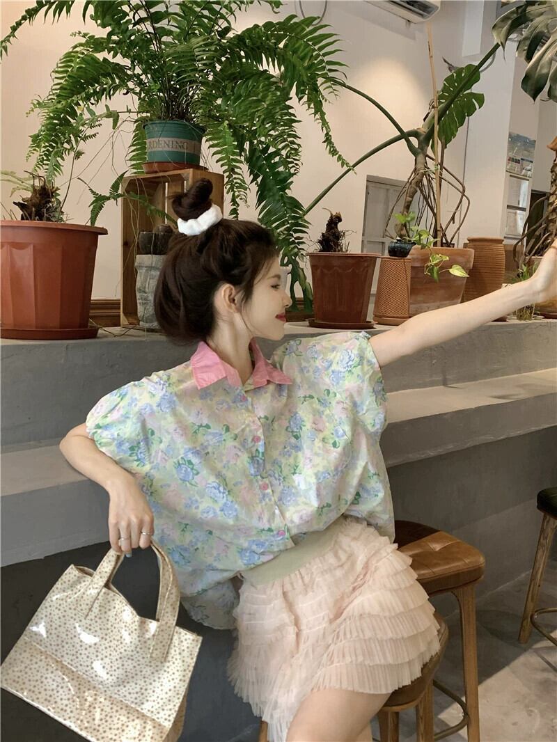 ランタンスリーブ花柄シャツ女性の夏のデザインセンスニッチ2023新しいフレンチスイートジェントルシックトップ 大人ガーリー スウィート キュート カジュアル サマー 夏物 8571693328217146