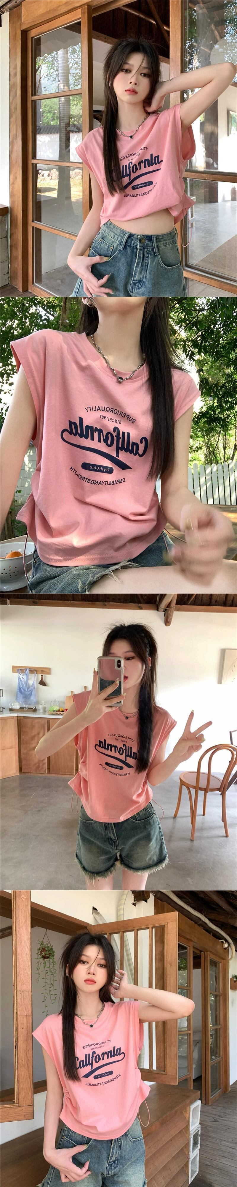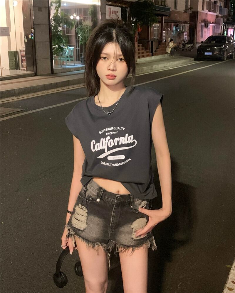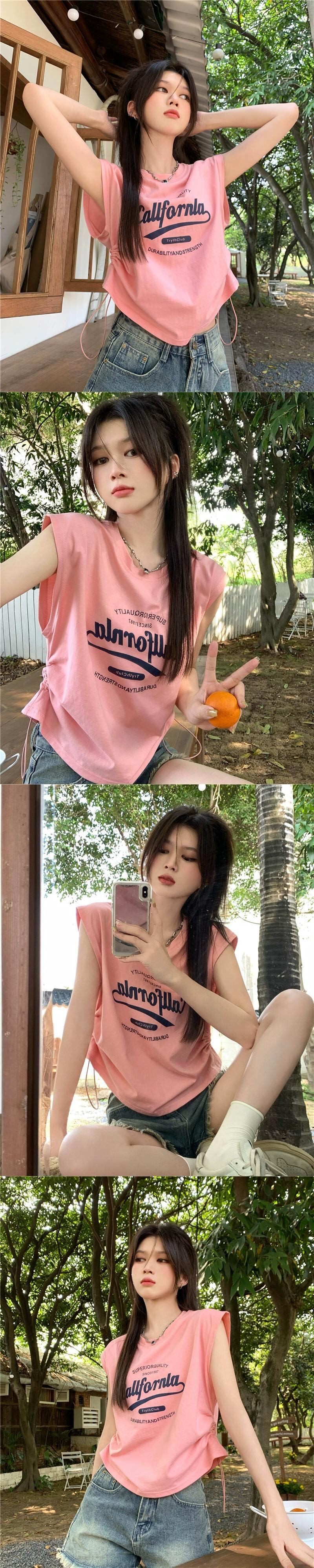 グレーノースリーブ Tシャツベスト女性の夏のデザインセンスニッチ 2023 新しいアメリカンスタイルのハイストリートルーズ巾着トップ サマー 夏物 8571655020735124