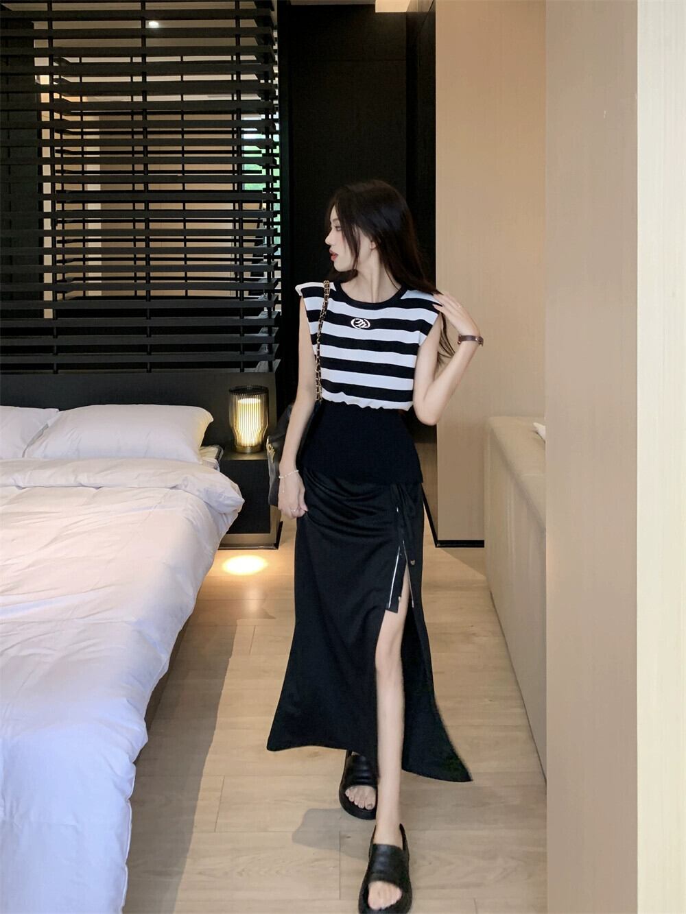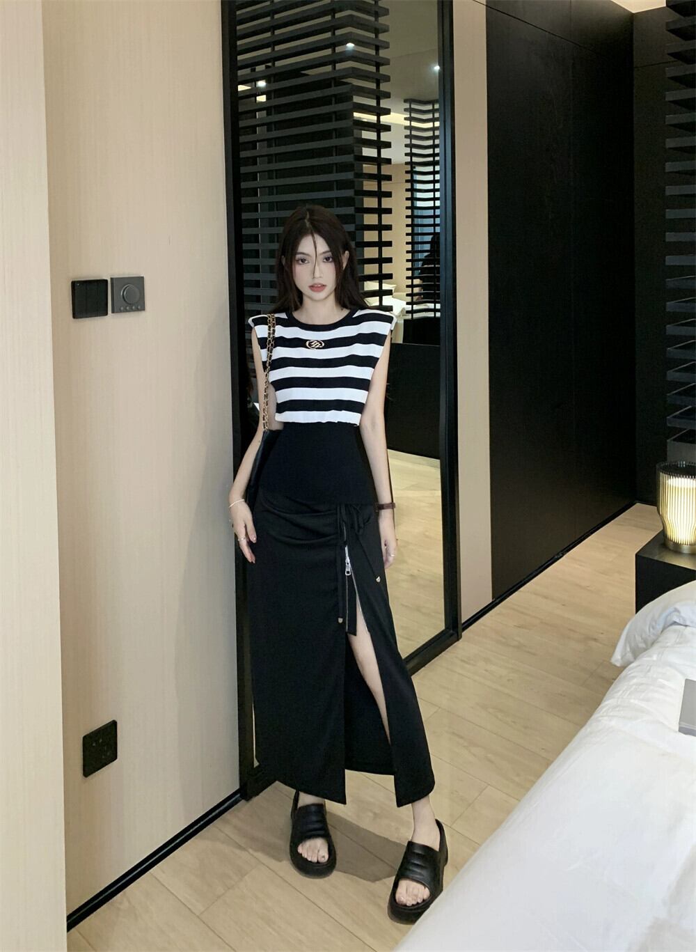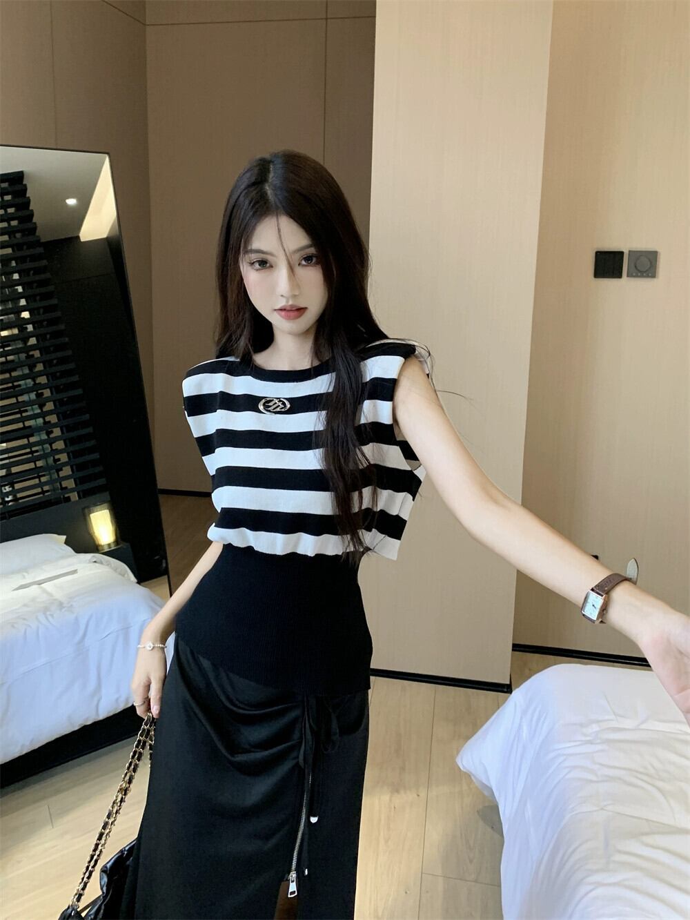 色:ブラックとホワイトのストライプトップ,黒スカート