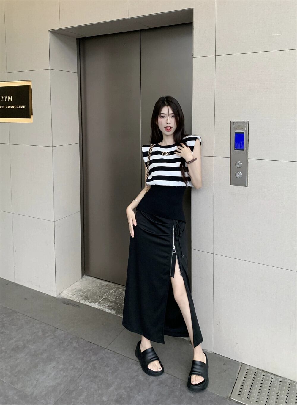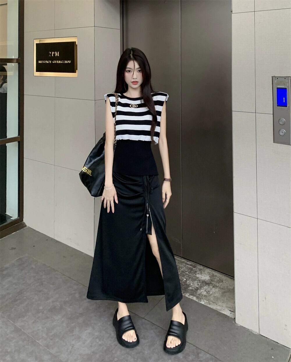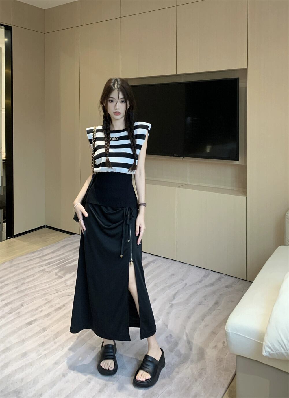 色:ブラックとホワイトのストライプトップ,黒スカート