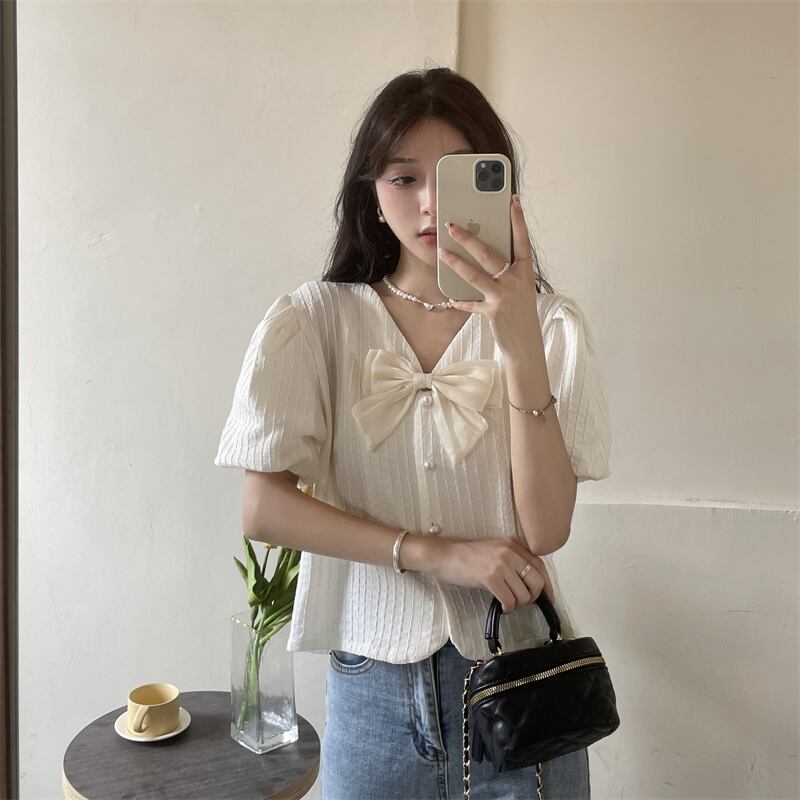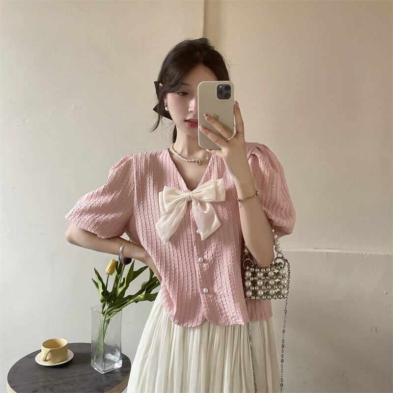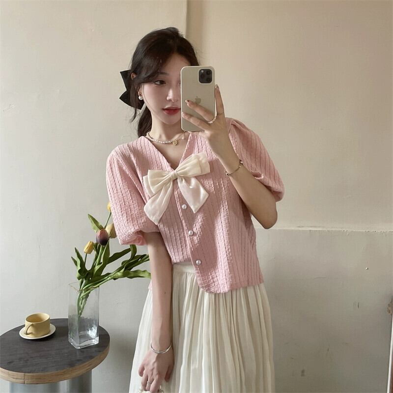 ピンクリボン半袖シャツレディース夏デザインセンスニッチフレンチミルク系優しいパフスリーブショートトップス サマー 夏物 8571644640372098