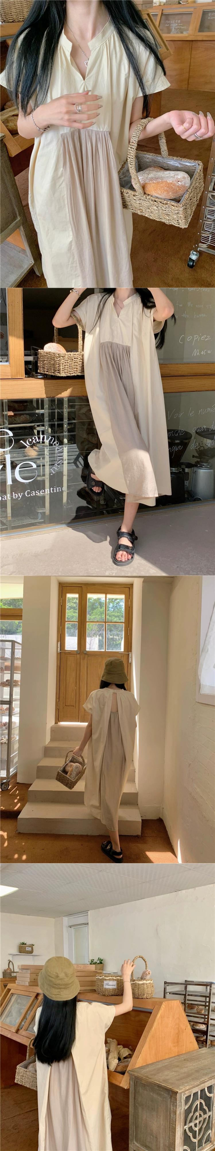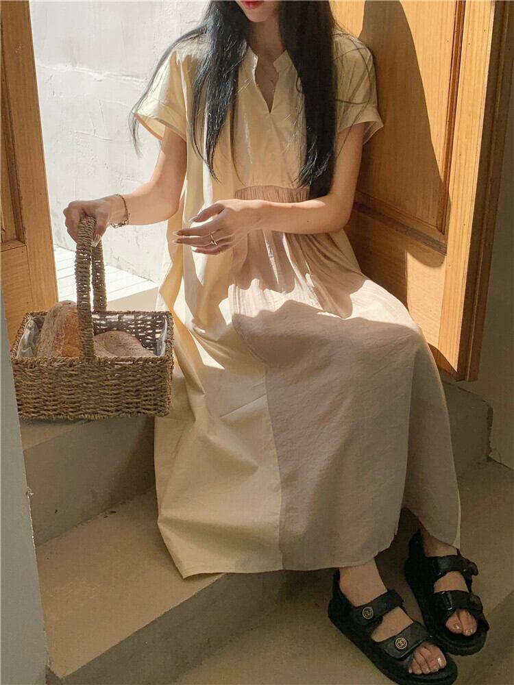 コントラストカラー半袖ドレス女性の夏のニッチデザイン洋ナシ形の図穏やかな風カバー腹ルーズロングスカート サマー 夏物 8571652168302386