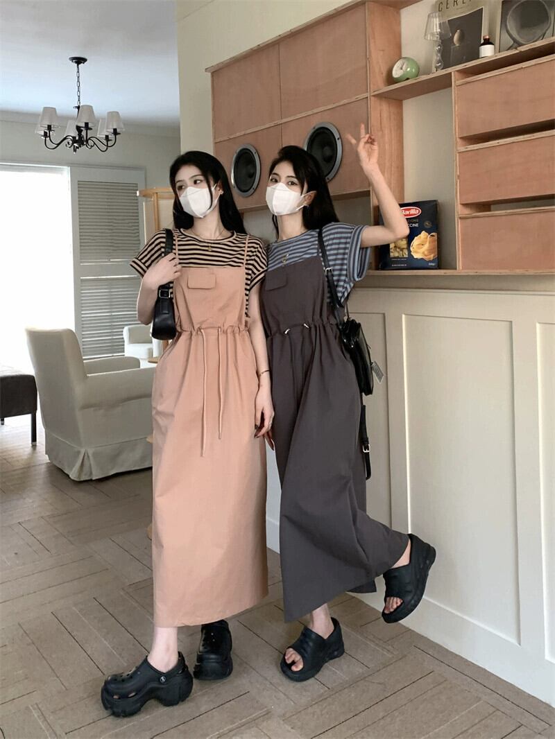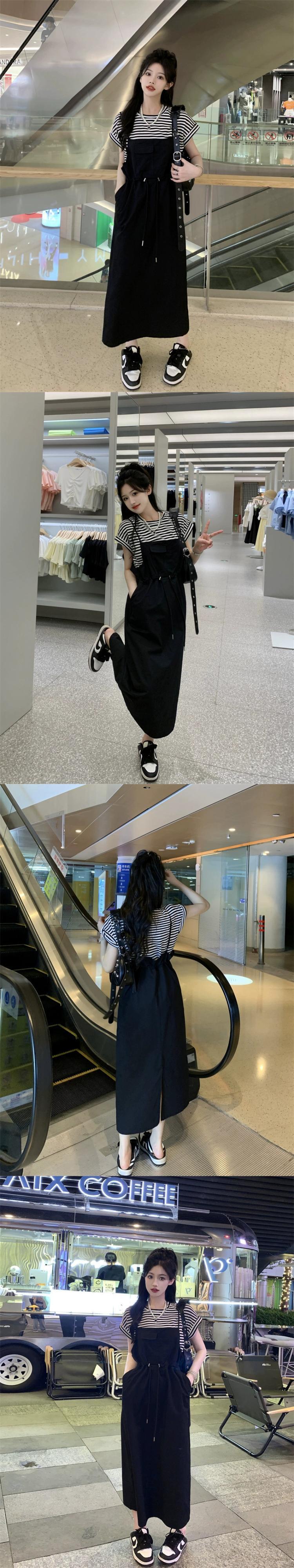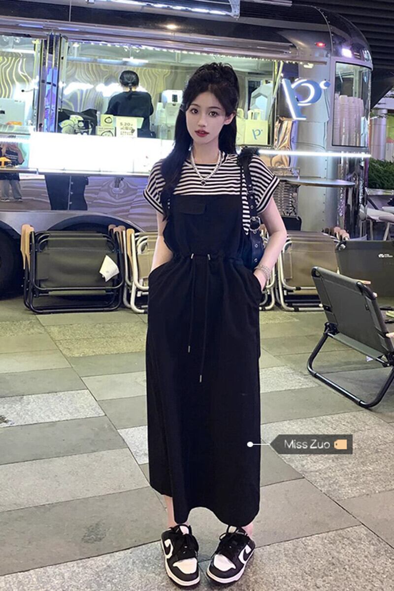 黒のサスペンダードレスの女性の夏の 2023 新しい香港スタイルのレトロな梨の形の図巾着ウエストロングスカート ブラック サマー 夏物 8571686694832657