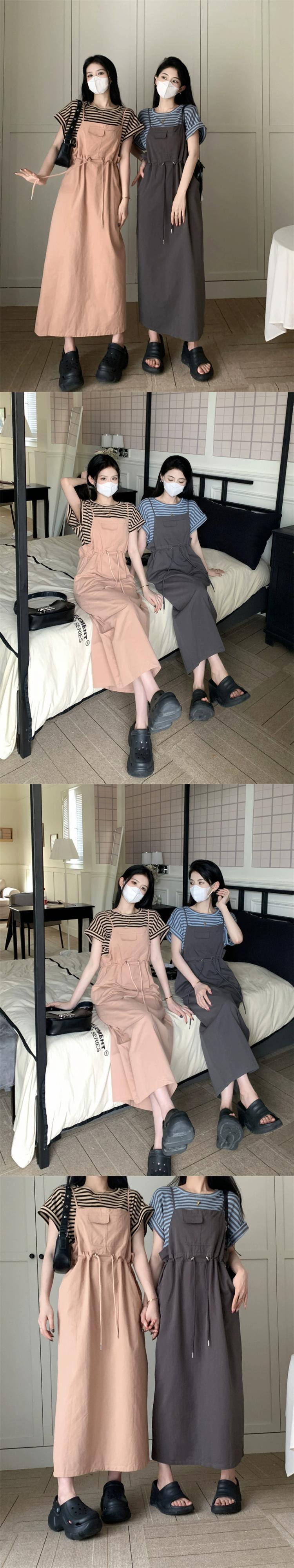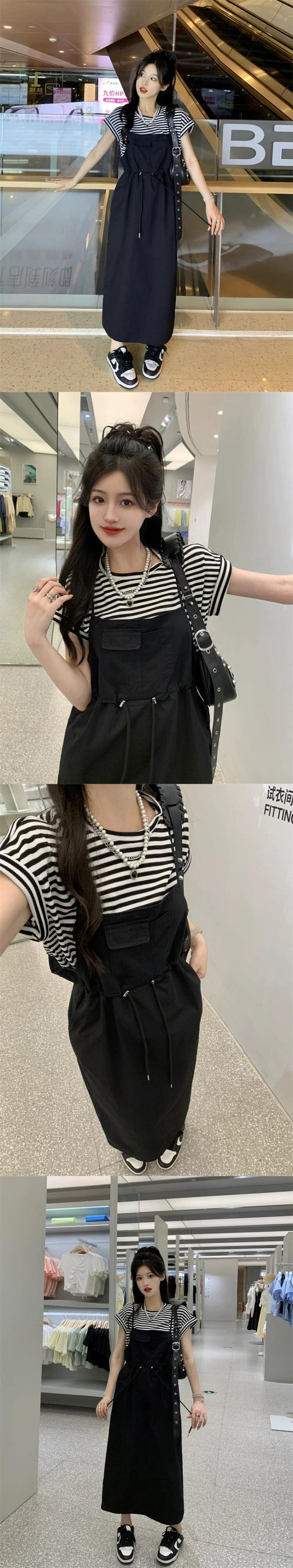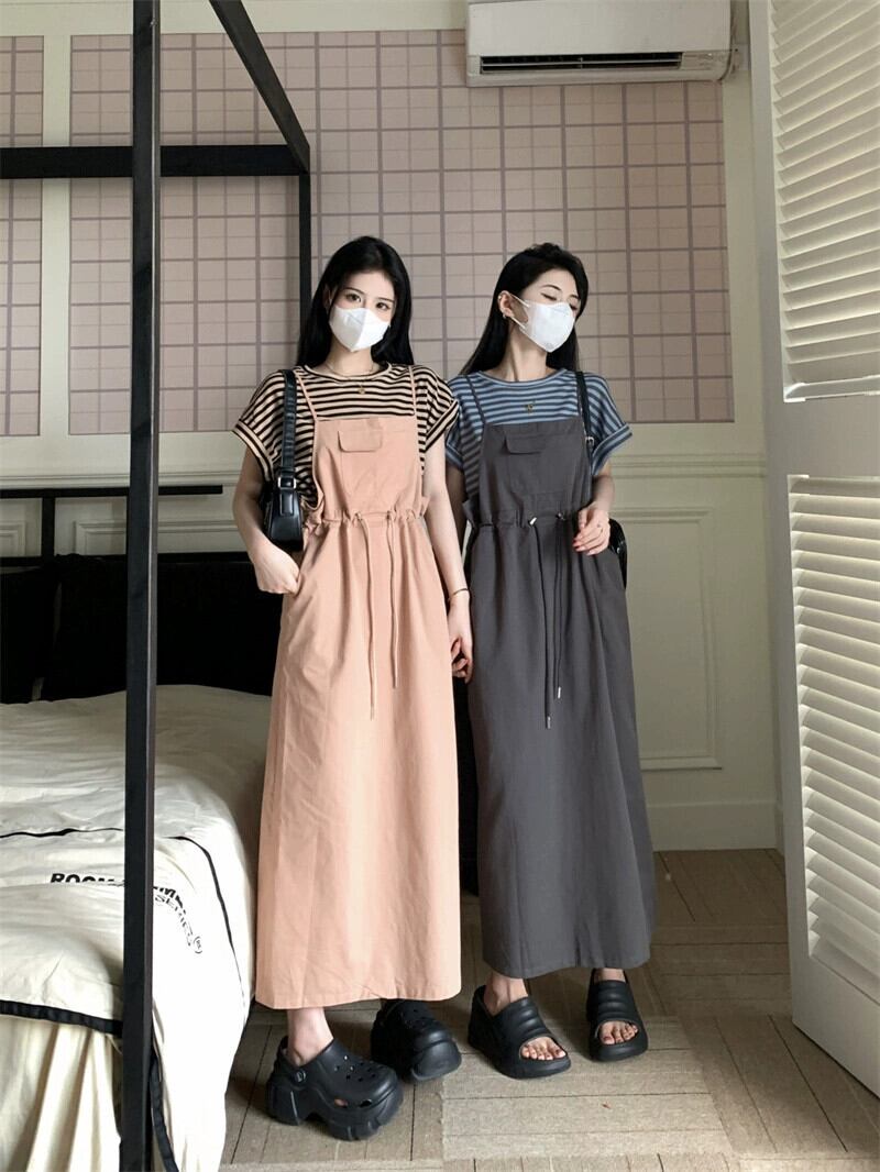 黒のサスペンダードレスの女性の夏の 2023 新しい香港スタイルのレトロな梨の形の図巾着ウエストロングスカート ブラック サマー 夏物 8571686694832657