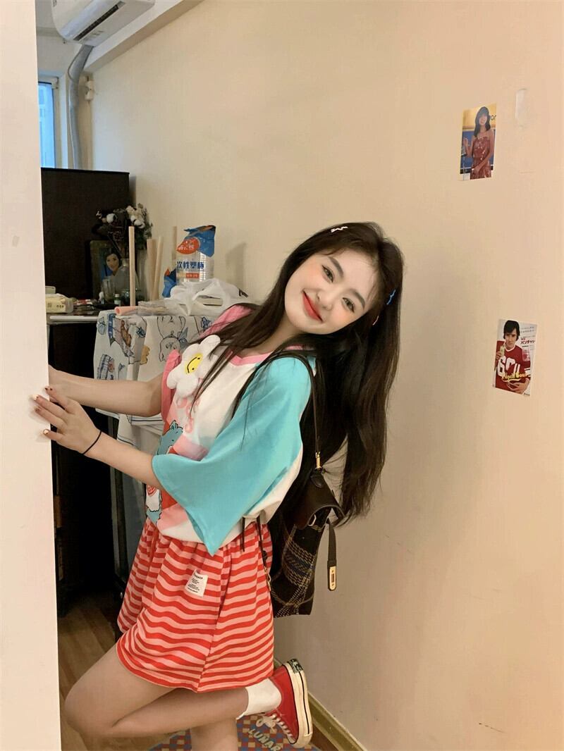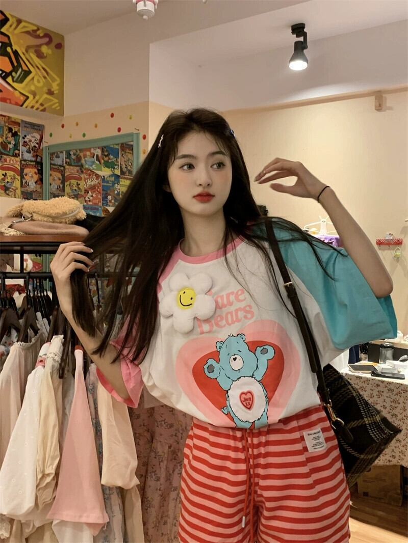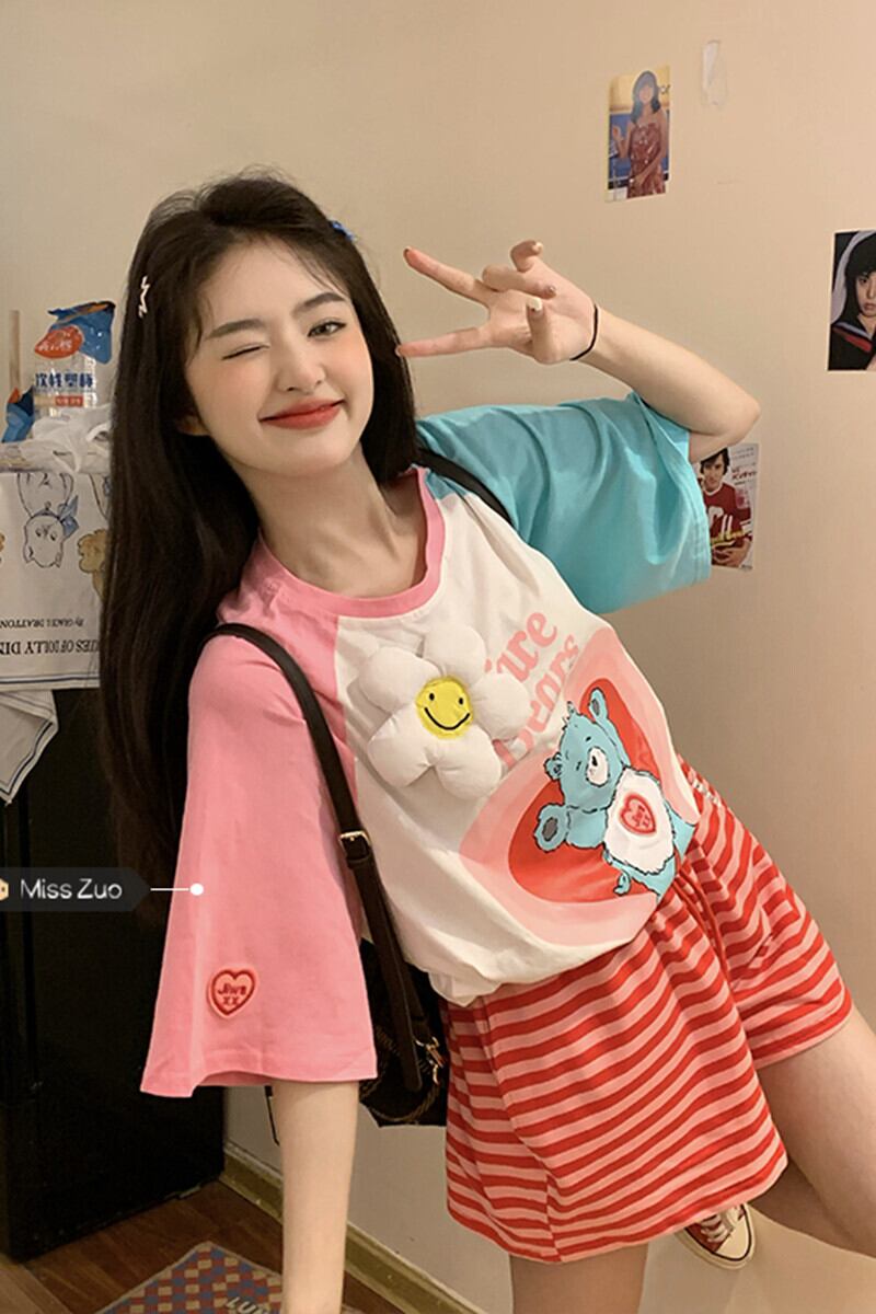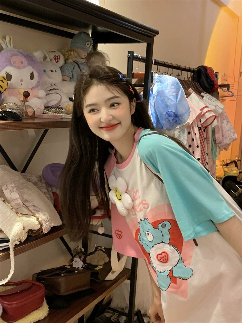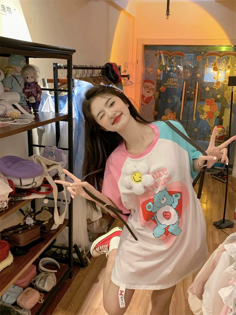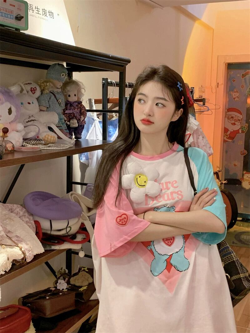 コントラストカラーラグランショルダー半袖Tシャツレディース夏デザインセンスニッチ2023新作甘くて可愛い立体フラワートップス 大人ガーリー スウィート キュート カジュアル サマー 夏物 フラワーデザイン 8571646617112464