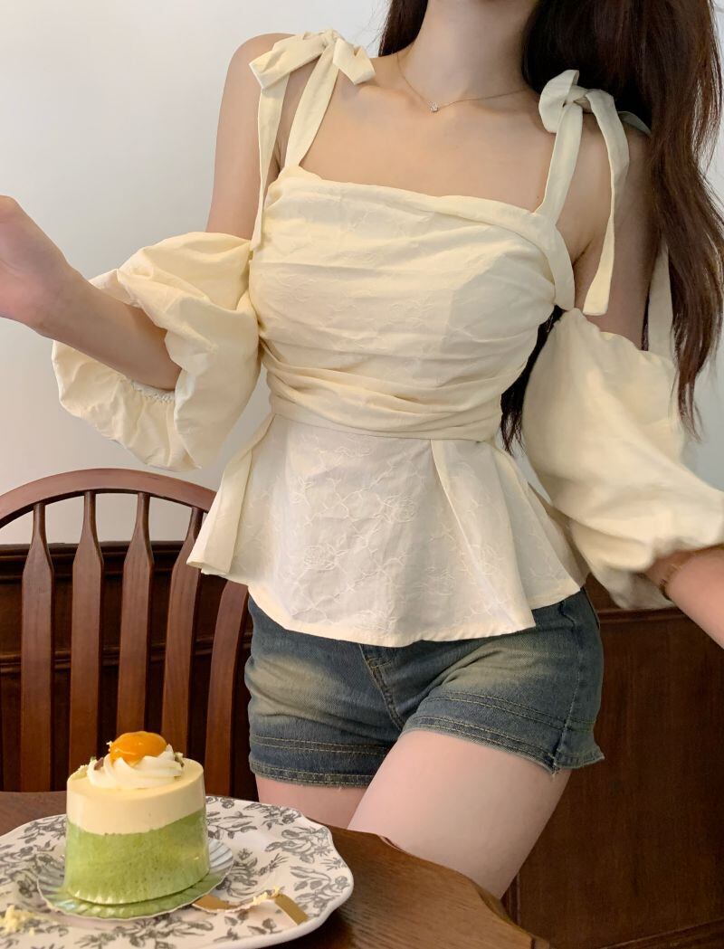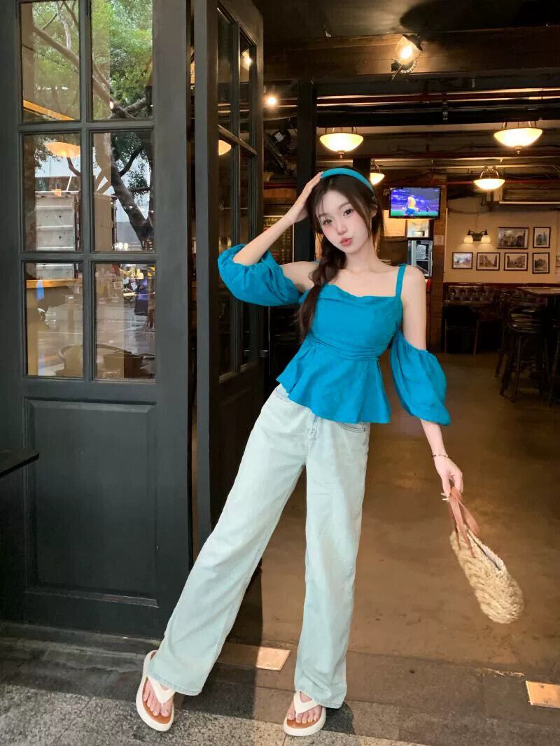 ワンショルダー サスペンダー トップ レディース 夏 デザイン センス ニッチ ピュア ディザイア シック 美しい ブルー パフスリーブ シャツ サマー 夏物 8571638101581516