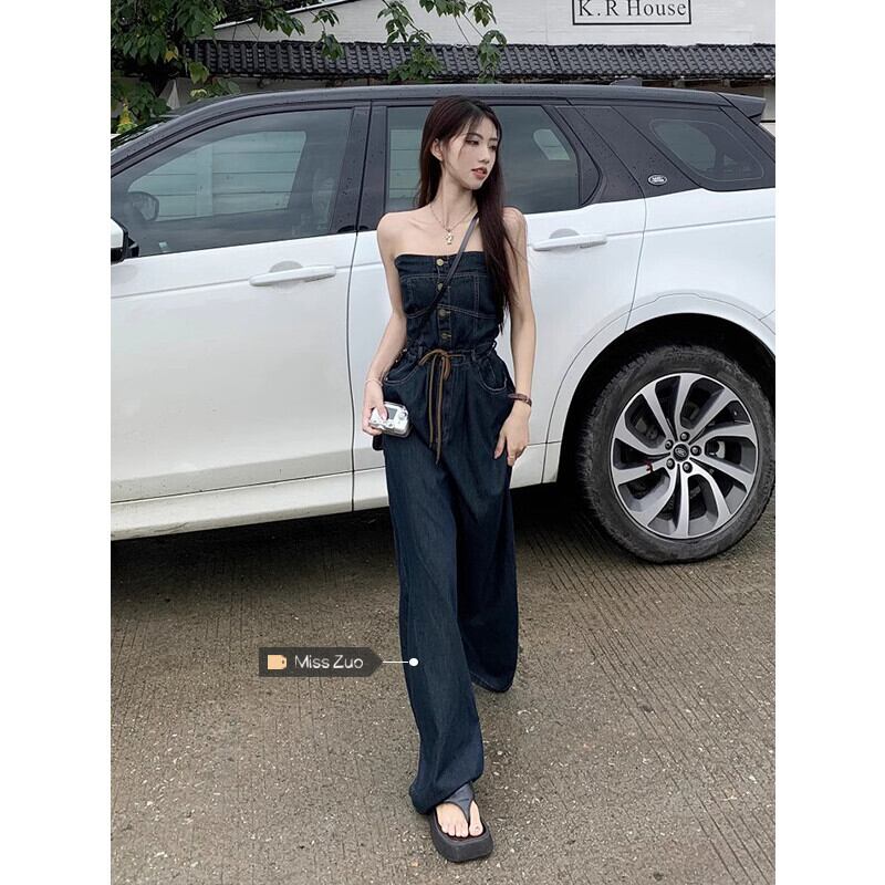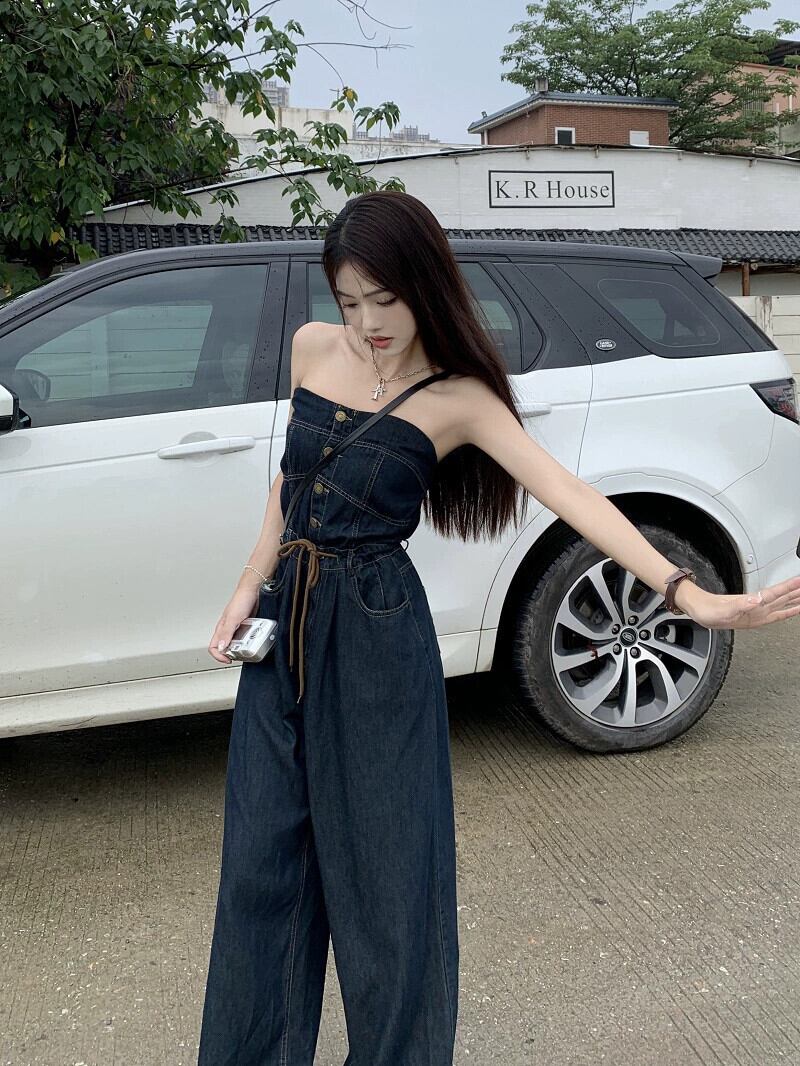 ダークブルーチューブトップデニムジャンプスーツ女性の夏2023新しい小さなジャンプスーツネットレッドスタイルジャンプスーツ サマー 夏物 8571640898702075