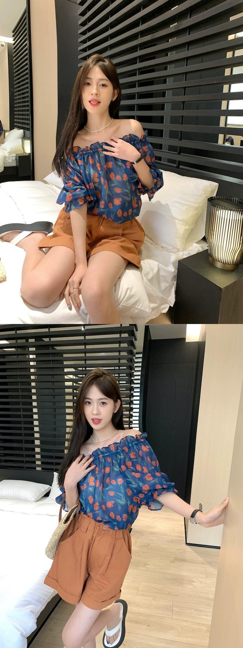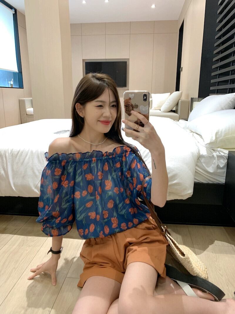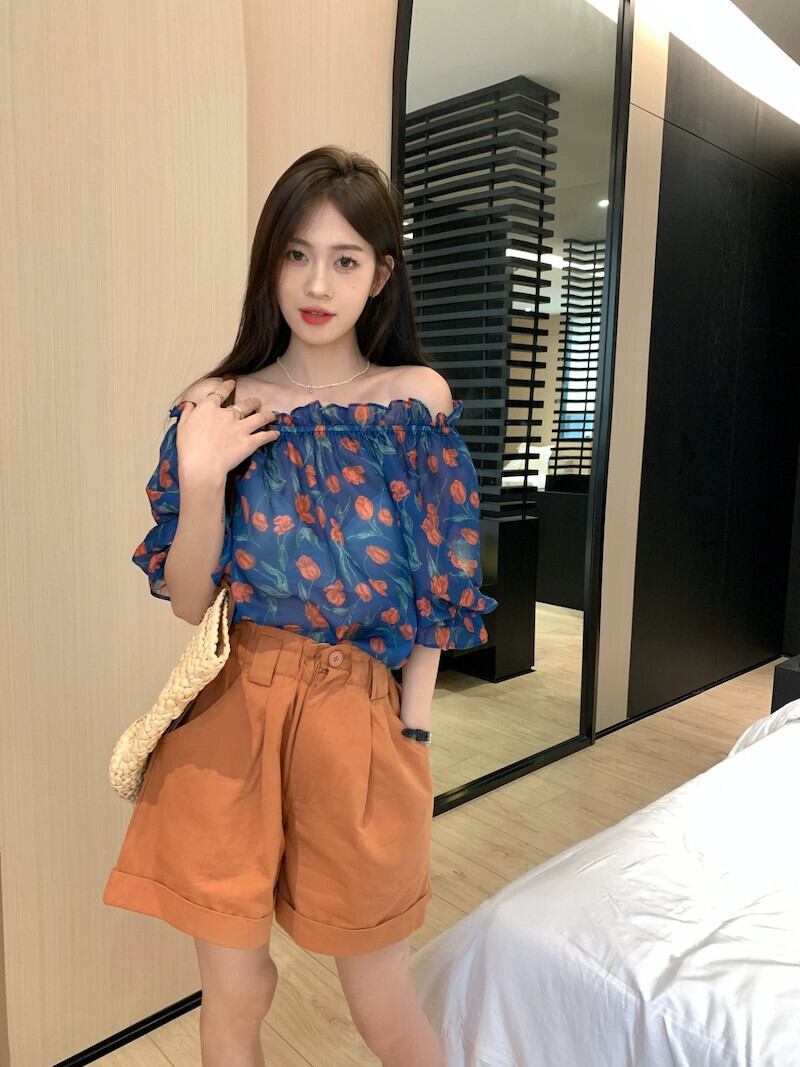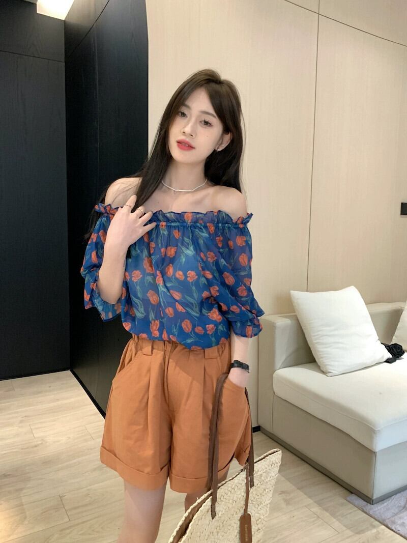 ワンショルダーパフスリーブトップレディース2023年夏新デザインセンスニッチフレンチ鎖骨美しい花柄シャツ サマー 夏物 8571661590411082