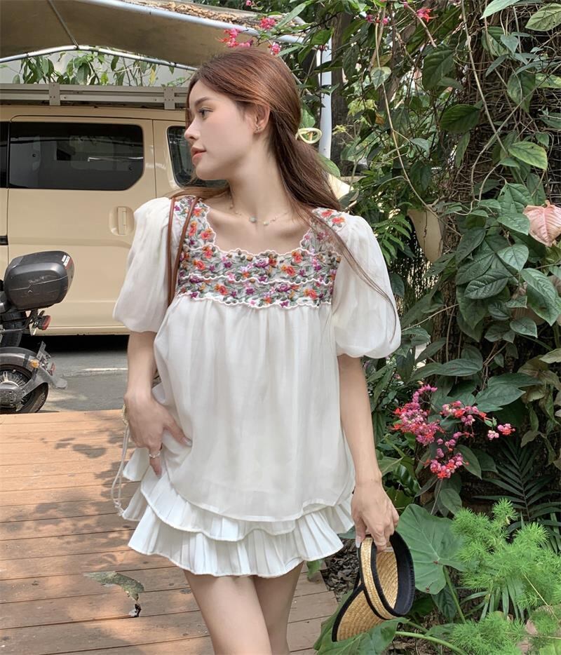 パフスリーブ スクエアカラー トップス レディース 夏 デザインセンス ニッチ フレンチ 優しく美しい ワインレッド 花刺繍 シャツ サマー 夏物 フラワーデザイン スクウェア 8571680120093569