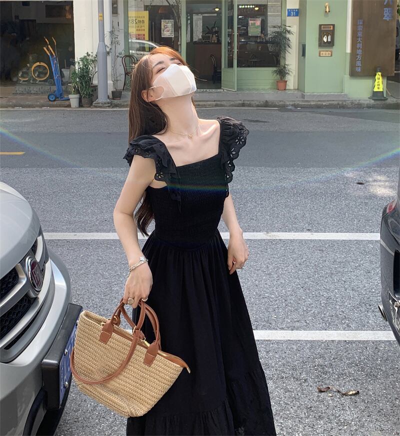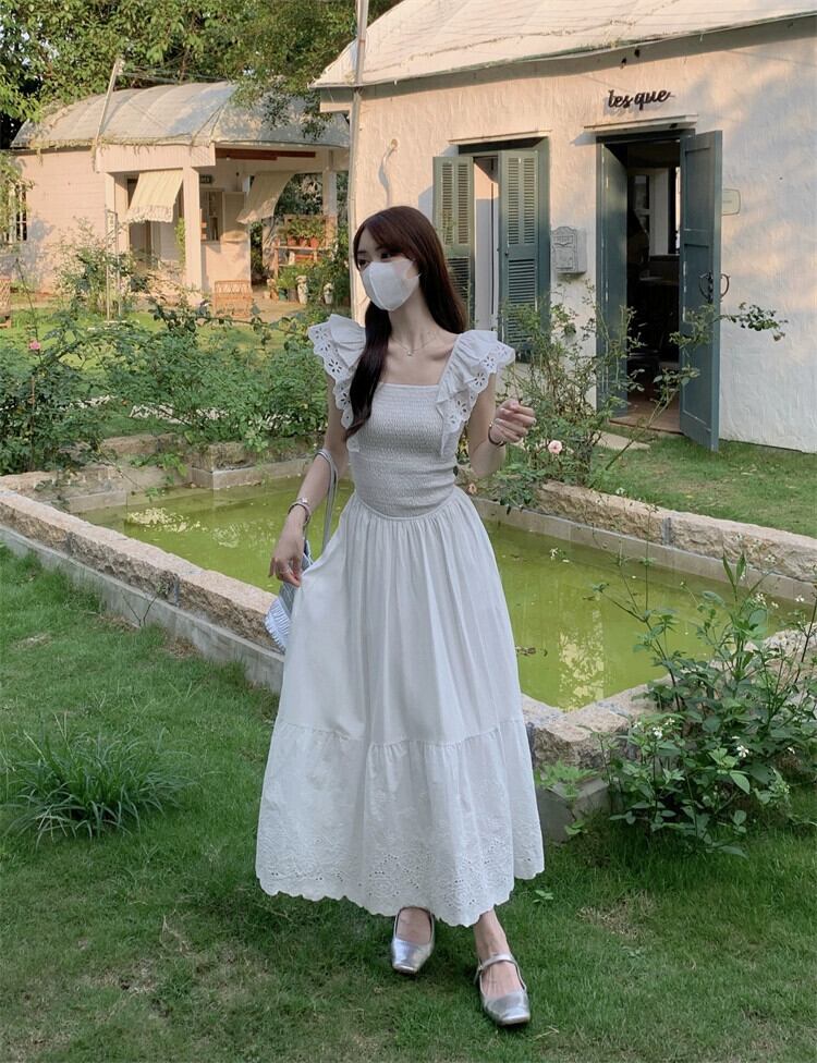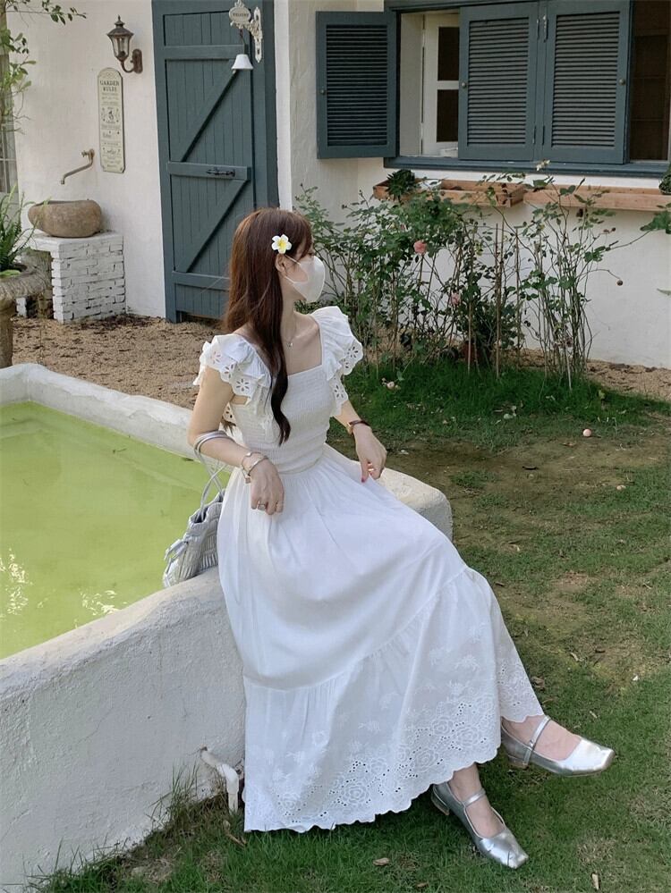 白い小さなフライングスリーブドレスの女性の夏の2023新しいフレンチスタイルの優しいスタイルの気質スクエアカラーウエスト痩身スカート ホワイト サマー 夏物 スクウェア 8571675388607649