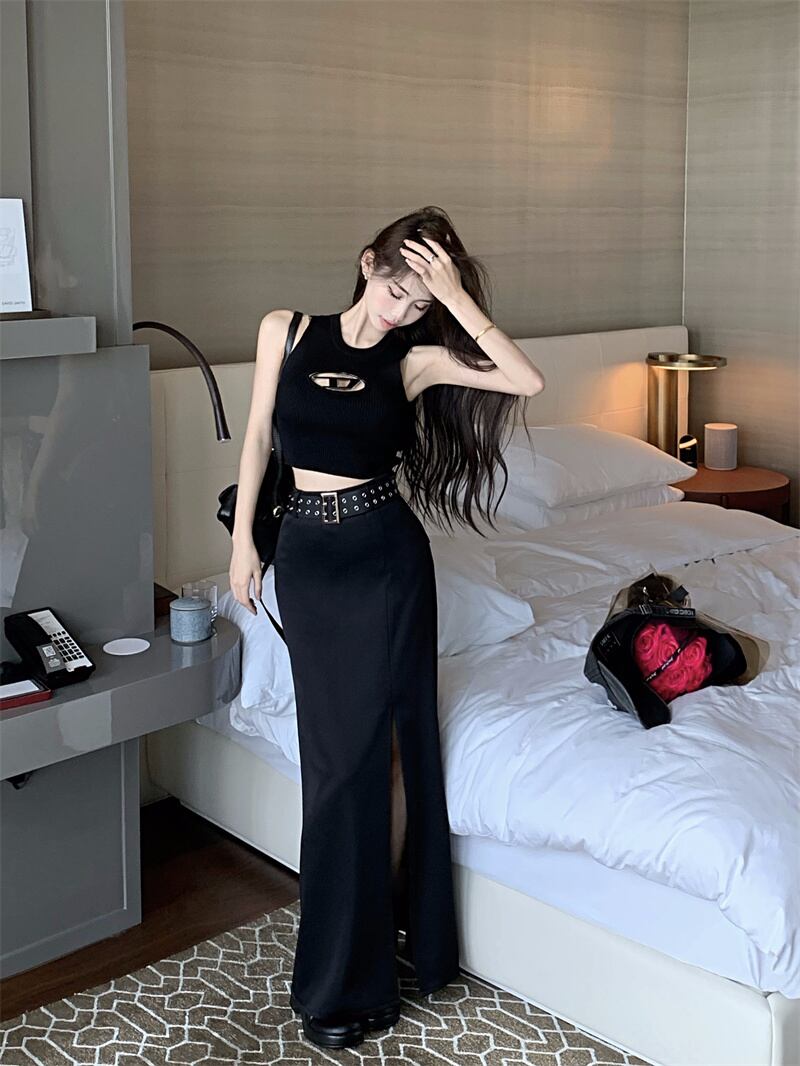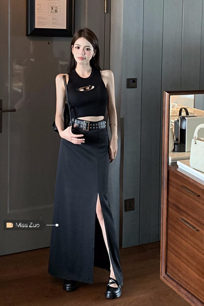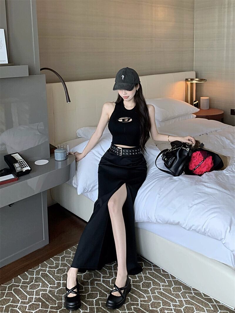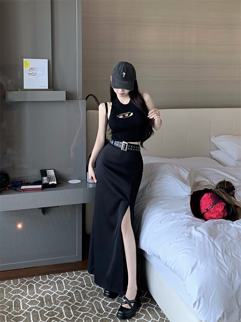 黒のスリットスカートの女性のハイウエスト痩身ワンステップスカート 2023 夏の新作ヒップ付きミドル丈スカート ハイウェスト ブラック サマー 夏物 8571634788025114