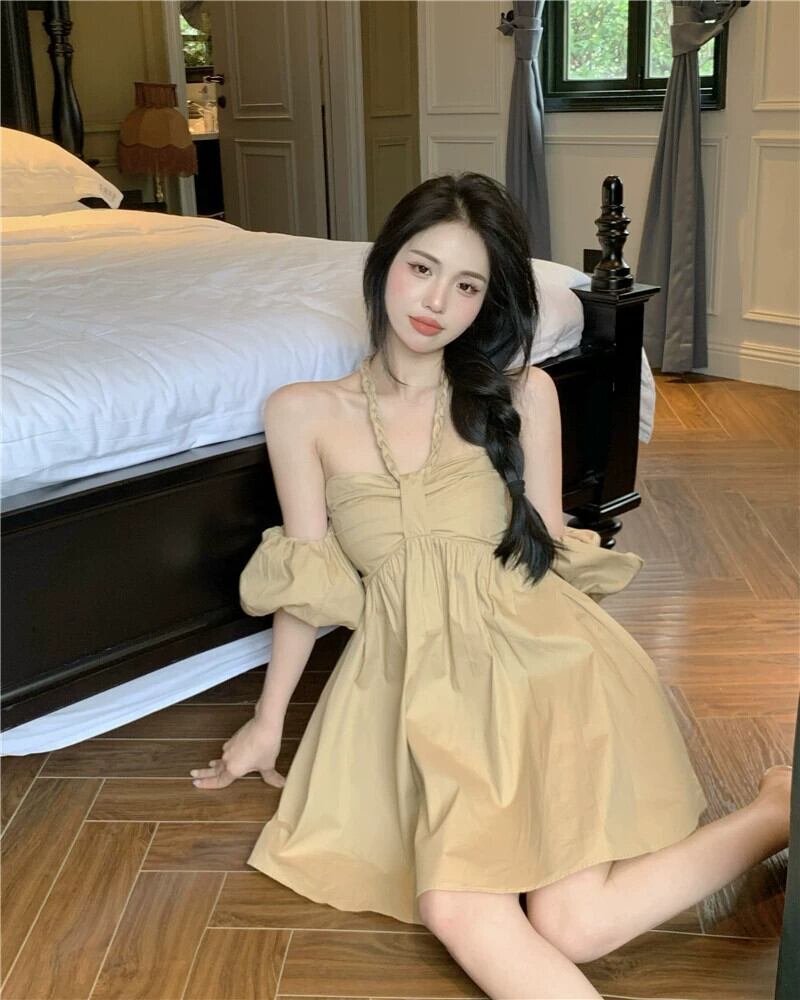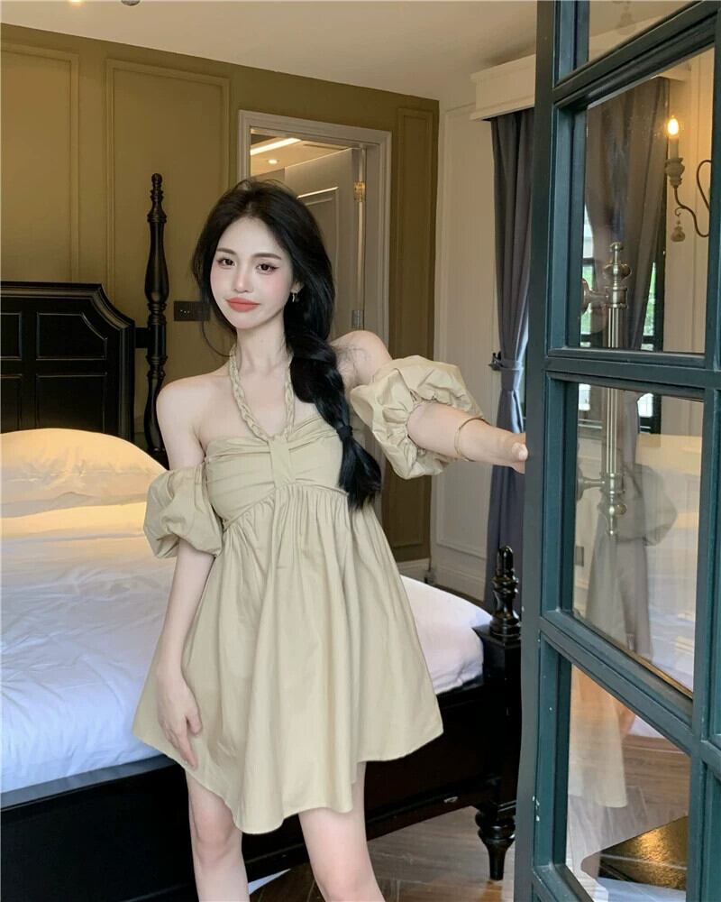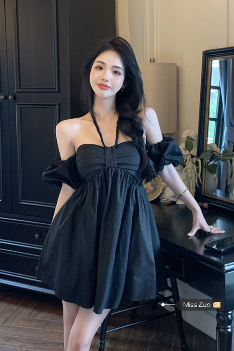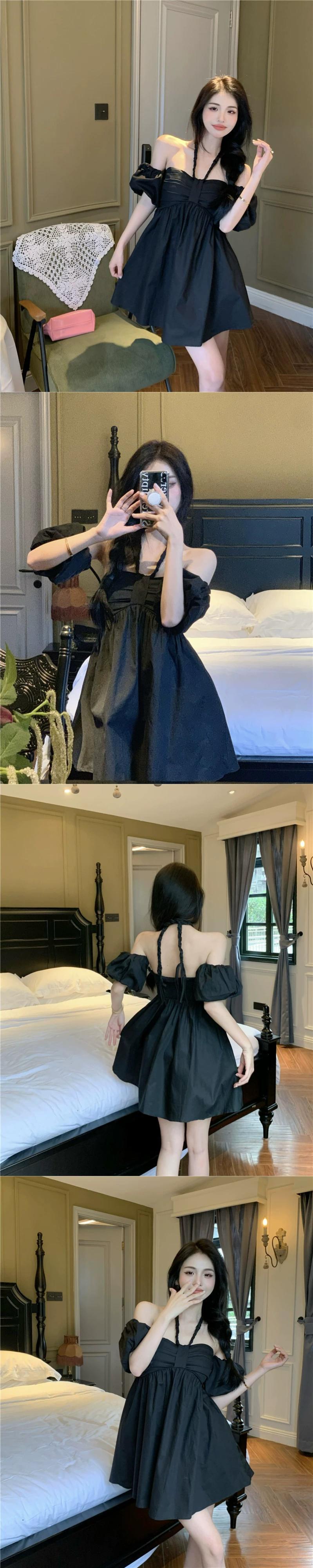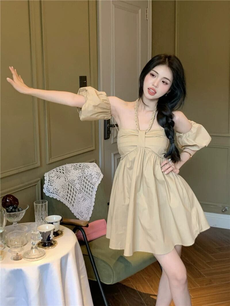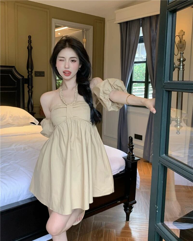 ワンショルダーハンギングネックドレスレディース2023年夏新作フレンチスタイルの優しい気質の小さなパフスリーブショートスカート サマー 夏物 8571665279044611