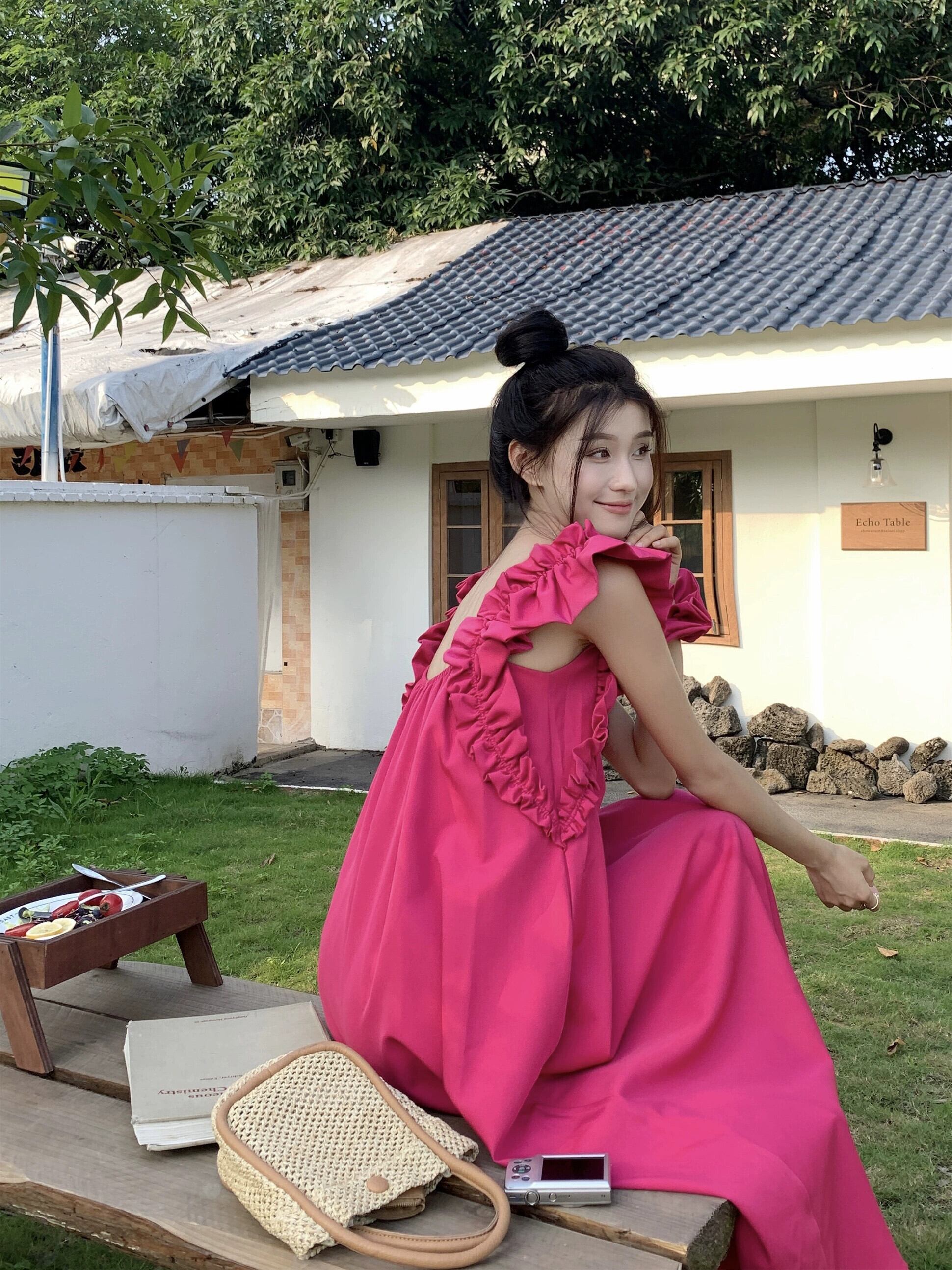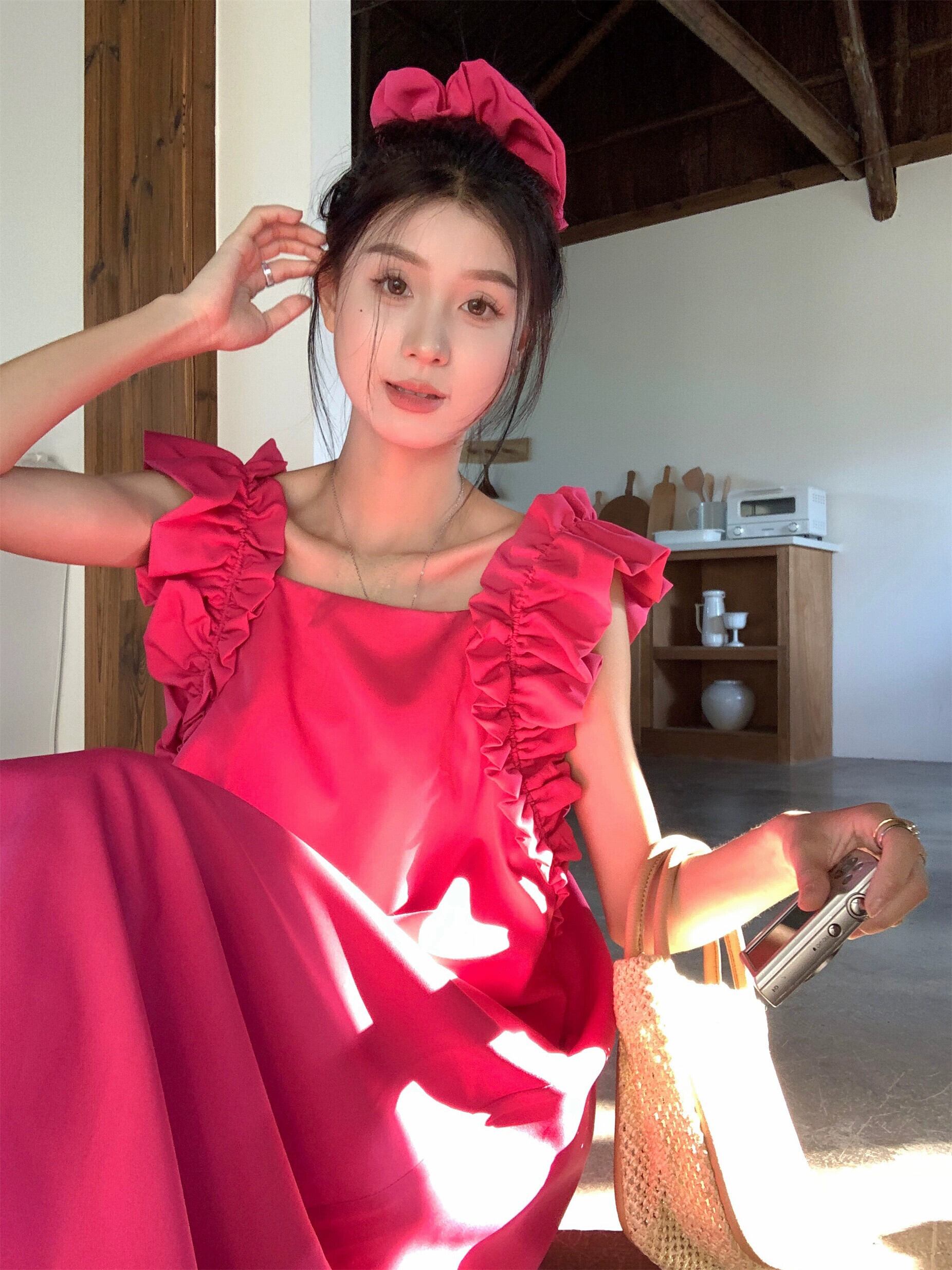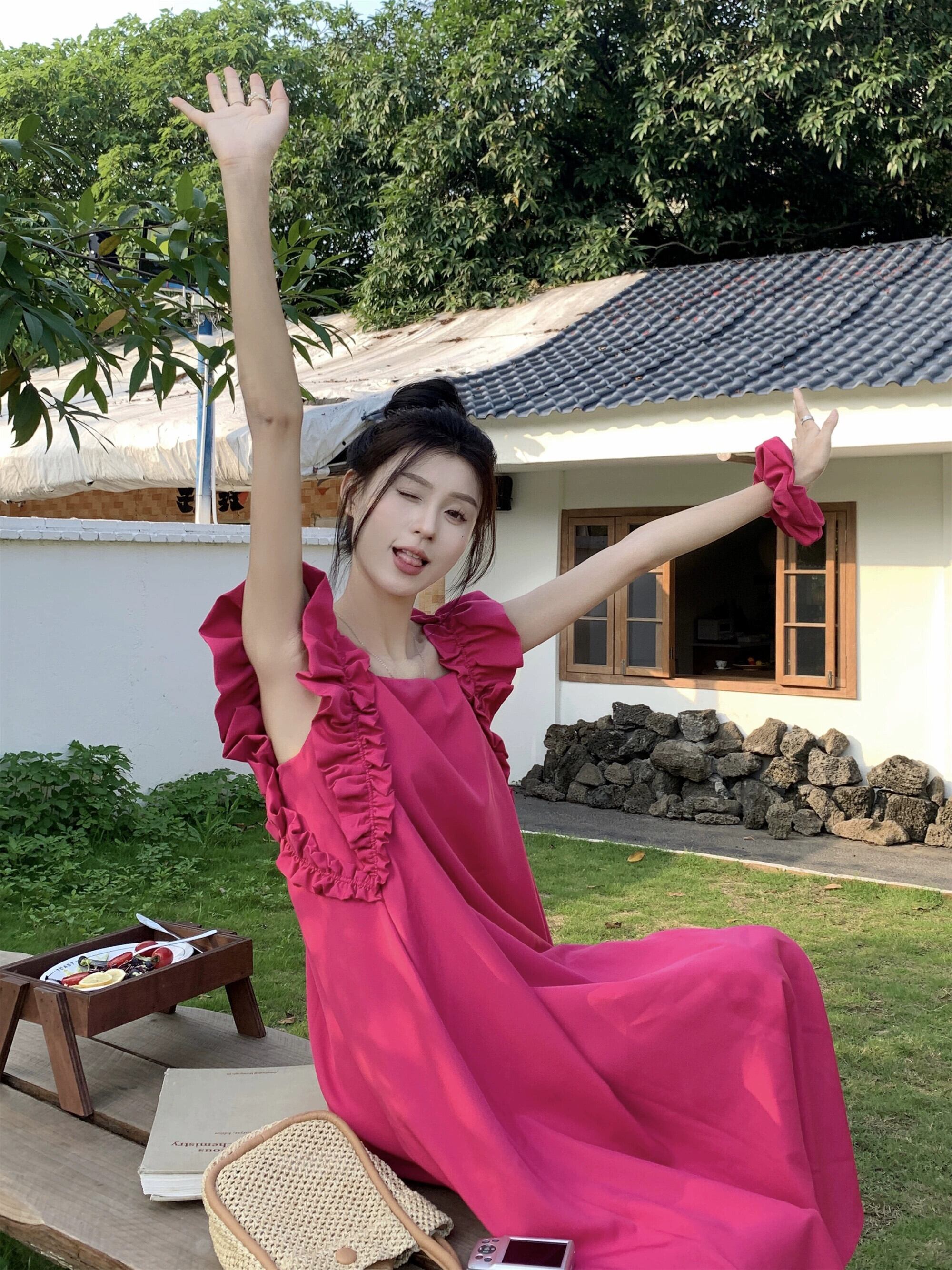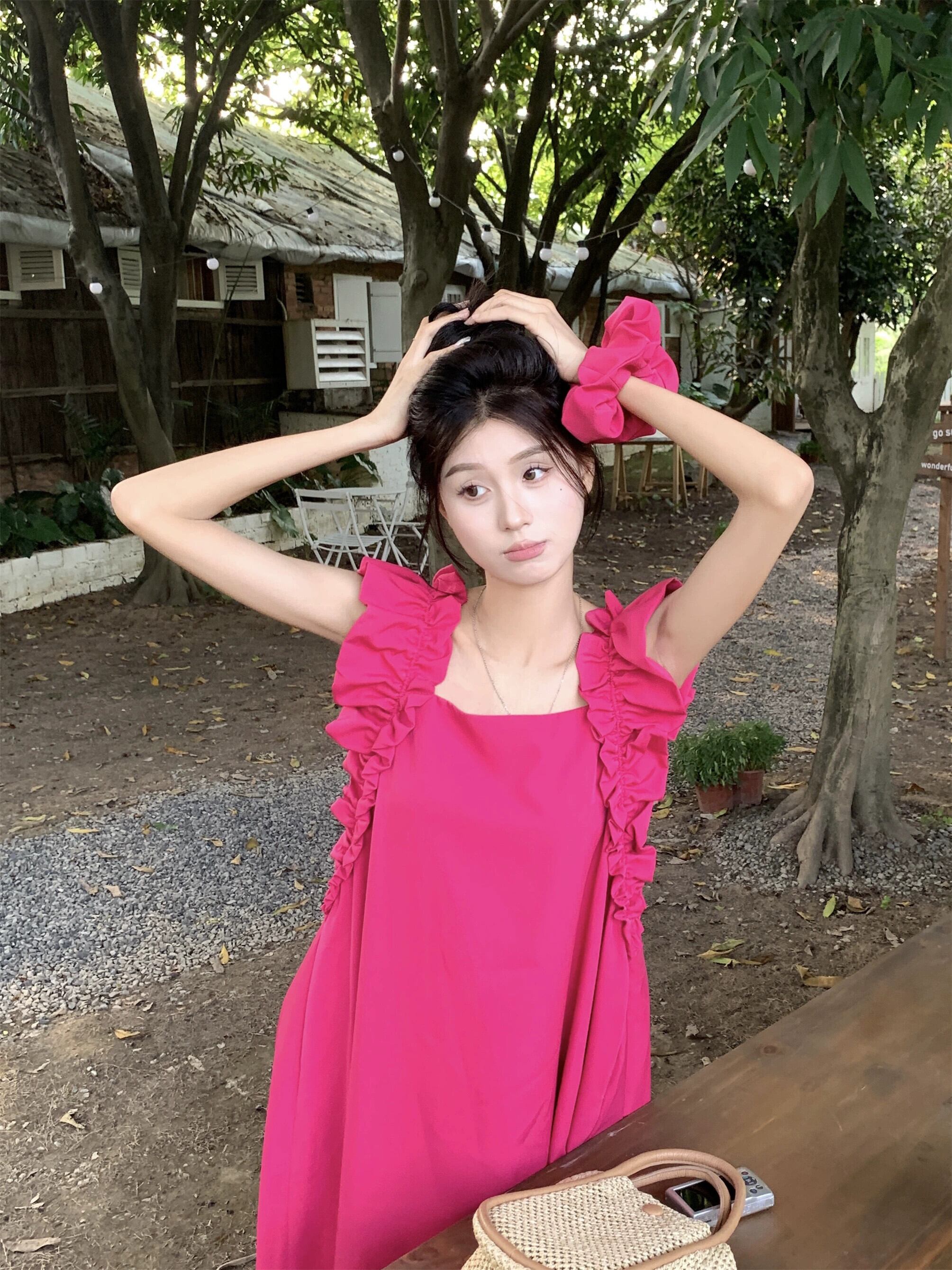 ラズベリーピンクフライングスリーブドレス女性の夏2023新しい甘くて優しい初恋白いスクエアカラーロングスカート ホワイト 大人ガーリー スウィート キュート カジュアル サマー 夏物 スクウェア 8571683484584324