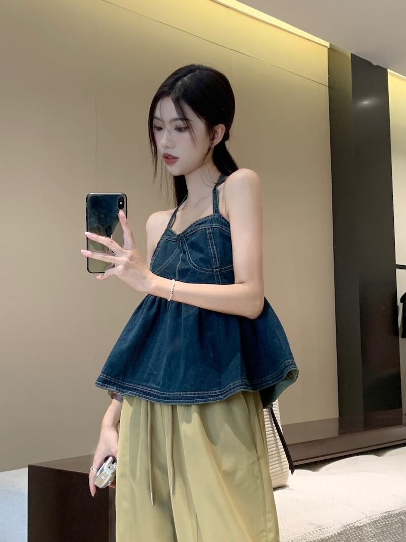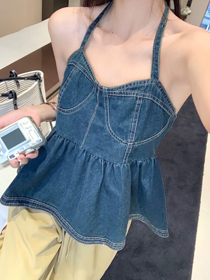 デニムホルターネックキャミソールレディースアウター夏感覚ニッチスパイスガールズセクシーな香港スタイルシックなオールマッチトップス サマー 夏物 8571671483224103