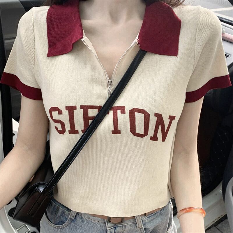 アイスシルクニット半袖Tシャツレディース夏デザインセンスニッチアメリカンレトロ小さなポロカラーショートトップ サマー 夏物 8571696072290490