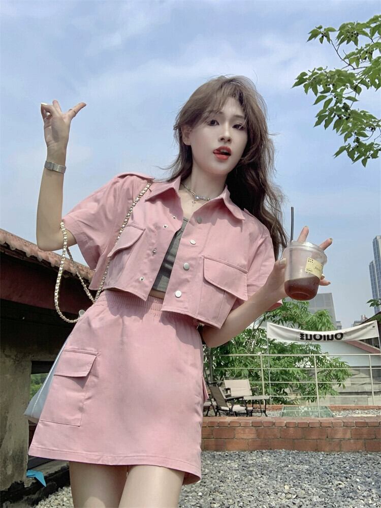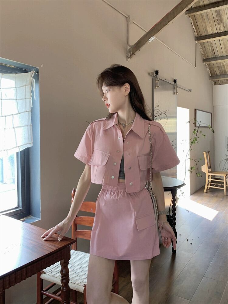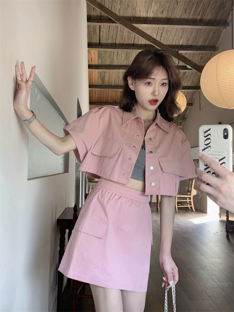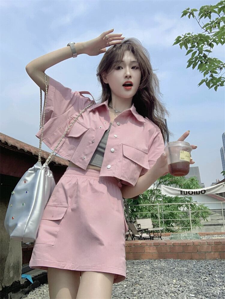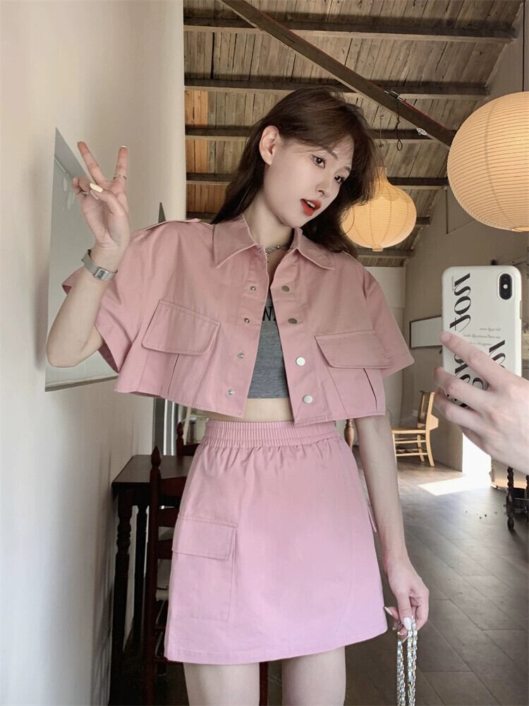 ピンクツーリング半袖ジャケット女性デザインセンスニッチ2023夏新しい小さなハイエンドセンスショートトップ サマー 夏物 8571619437745355