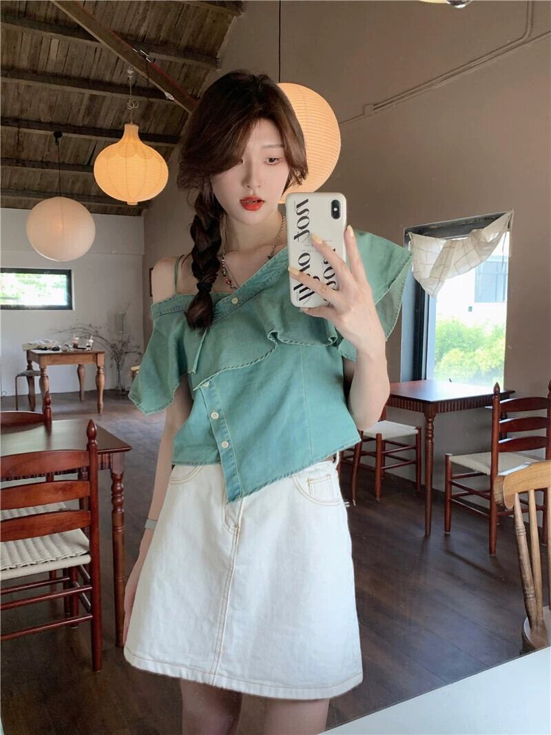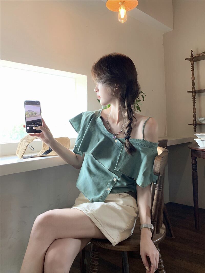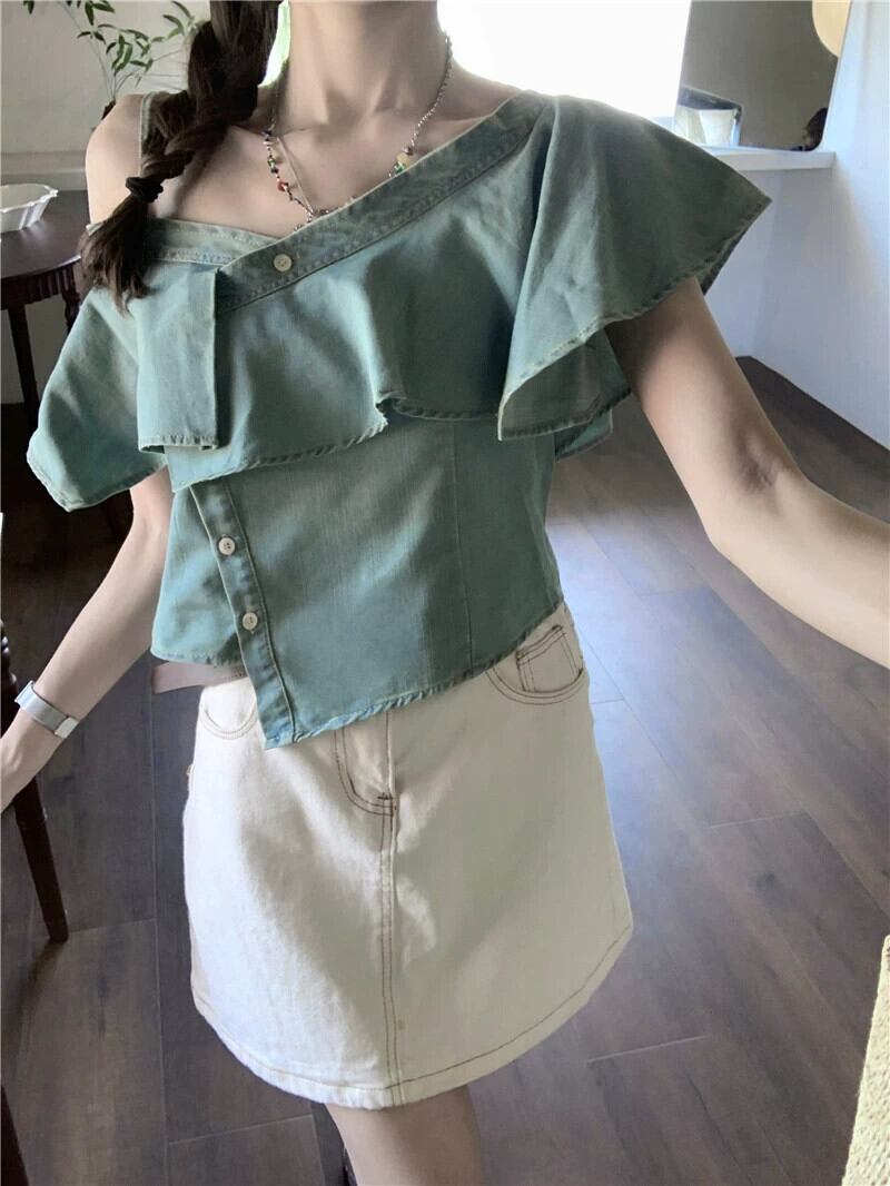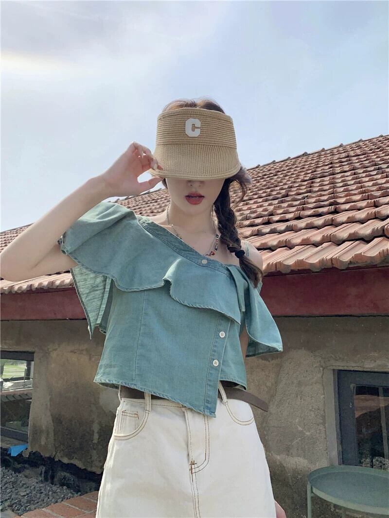 フリルオフショルダーショートトップレディース夏デザインセンスニッチアインスタイルユニークでユニークな不規則なデニムシャツ サマー 夏物 8571611945343344