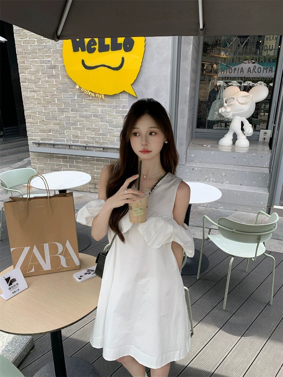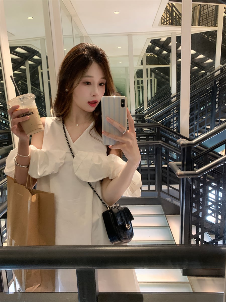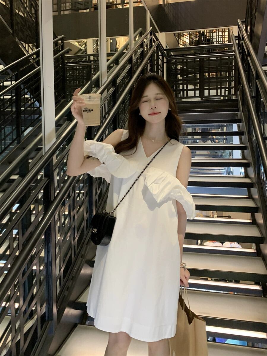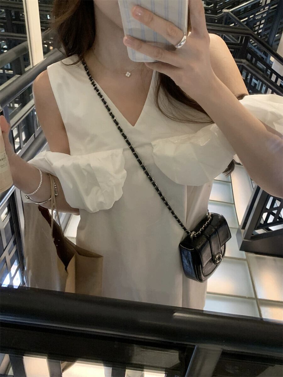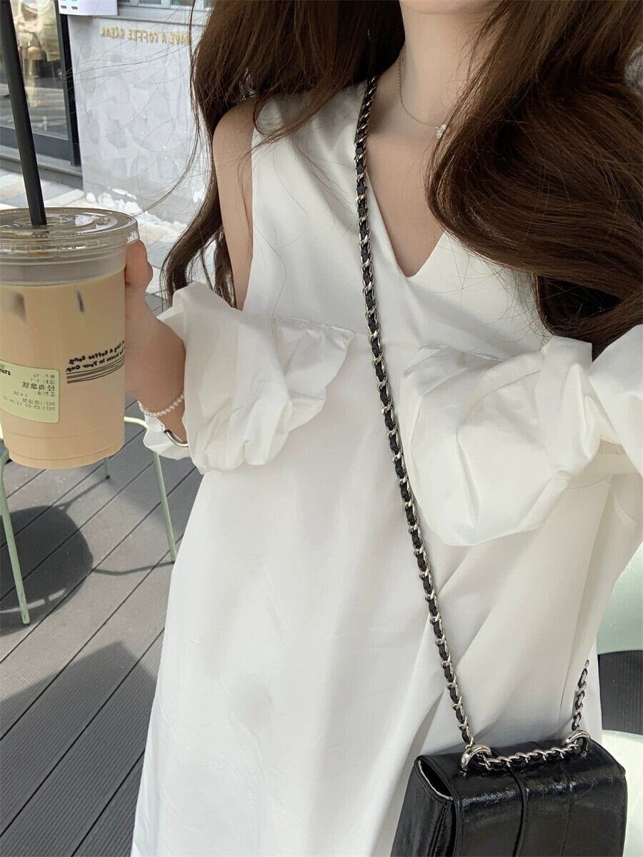 白いオフショルダードレスの女性の2023年夏新作フレンチスタイルの優しい気質のハイエンドの小さなVネックスカート ホワイト サマー 夏物 8571618654190710