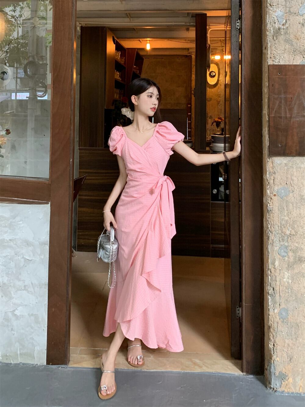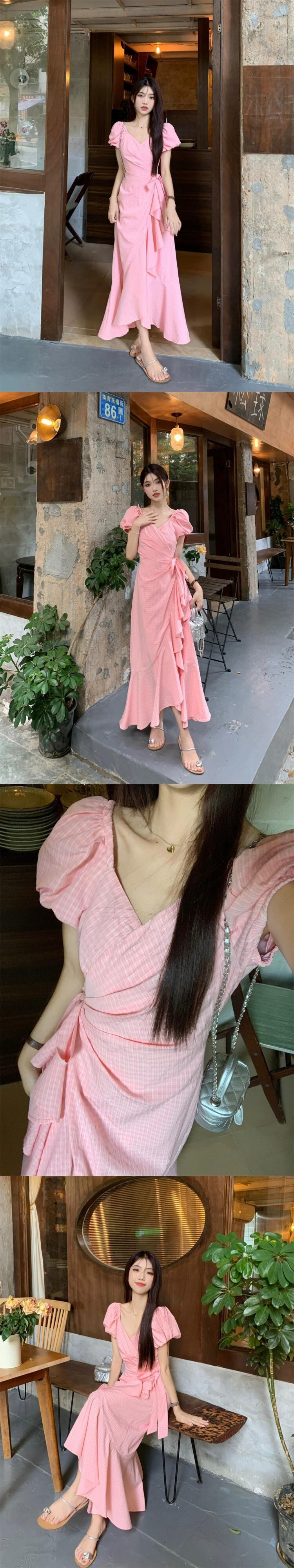 ピンクのパフスリーブドレスの女性の夏の 2023 新しいフレンチスタイルの穏やかな気質蓮の葉のエッジウエストロングスカート サマー 夏物 8571693779762502