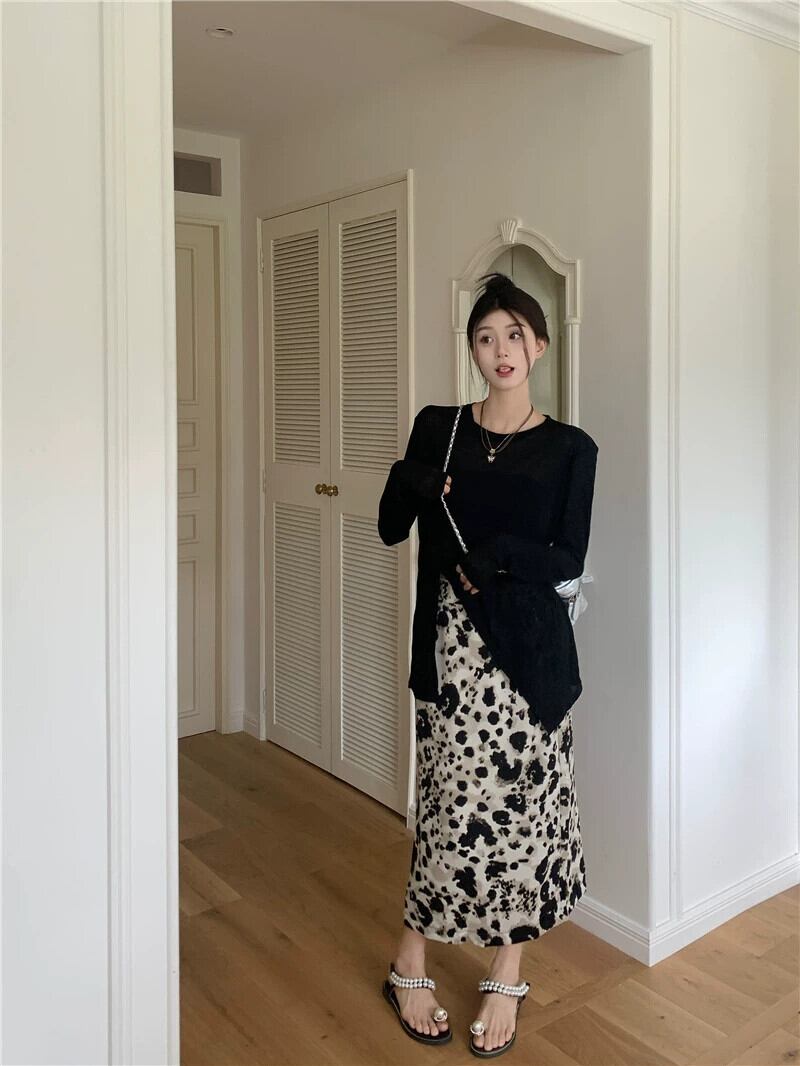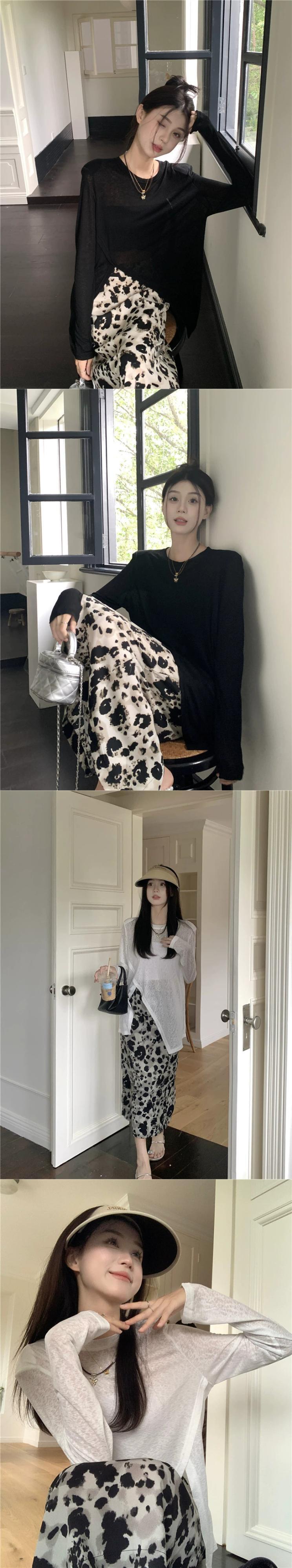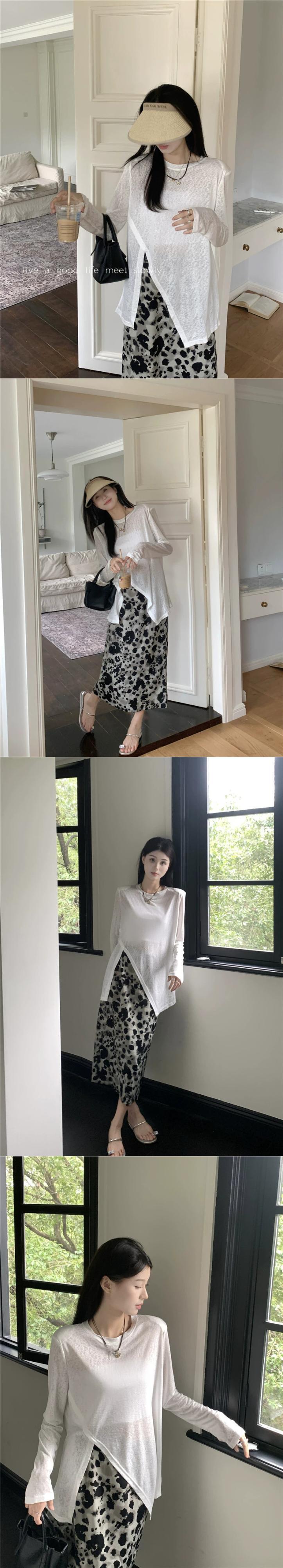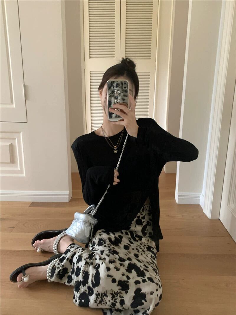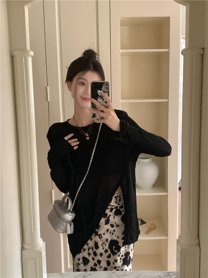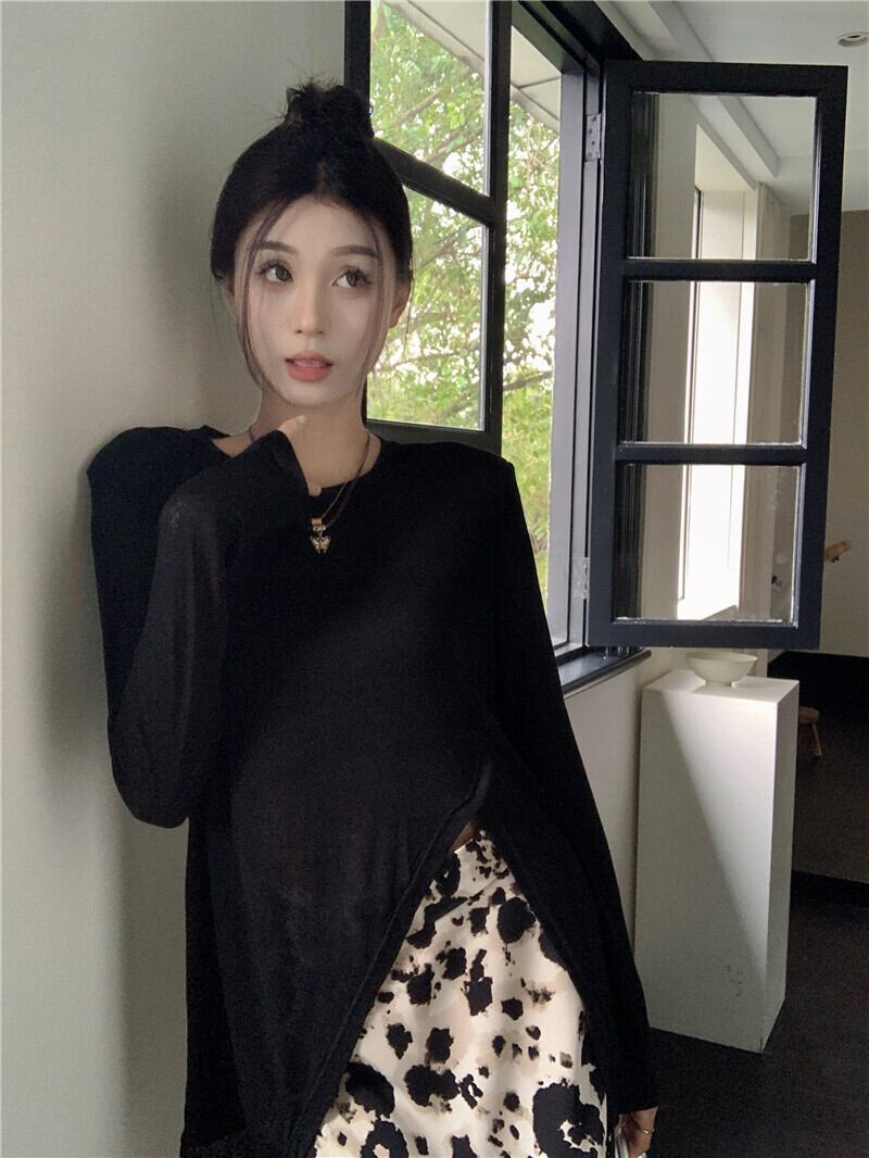 黒スリット日焼け止め長袖 Tシャツレディース 2023 春の新しいデザインセンスニッチファッションエインスタイルファッショナブルなトップス ロング ブラック スプリング 春物 8571652136025039