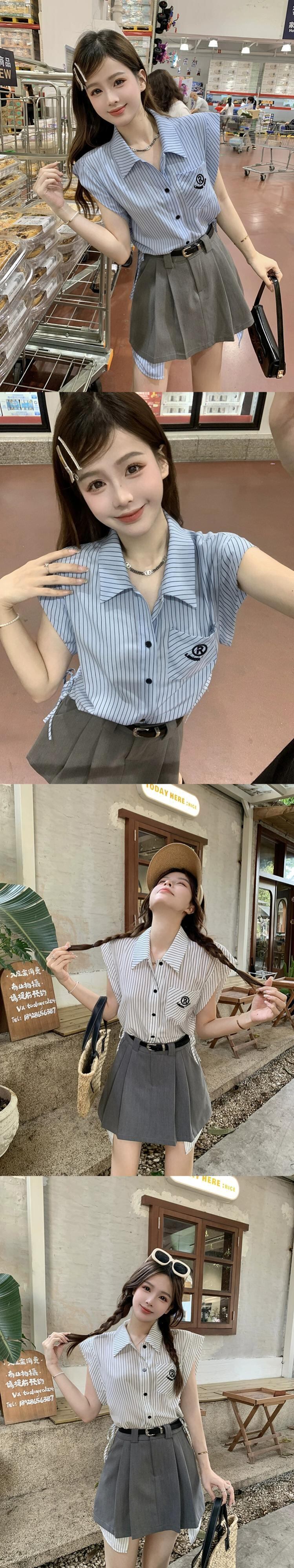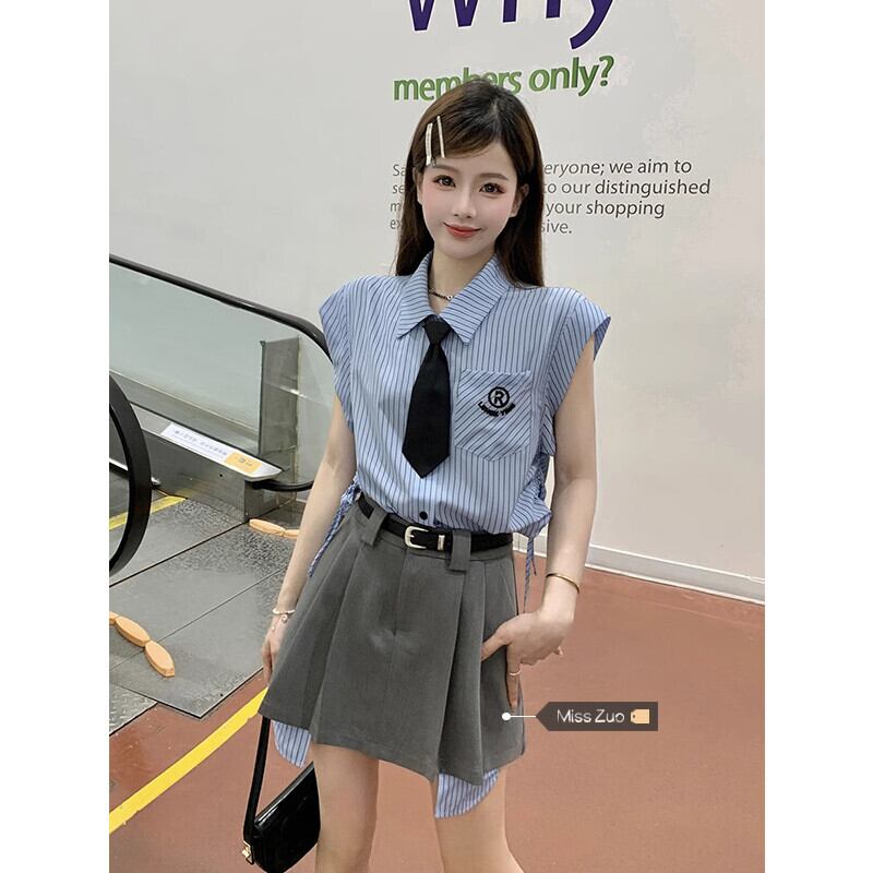 ブルーストライプJKシャツレディース2023年夏新デザインセンスニッチカレッジスタイルウエスタンスタイル年齢軽減ノースリーブトップ サマー 夏物 8571642928146342