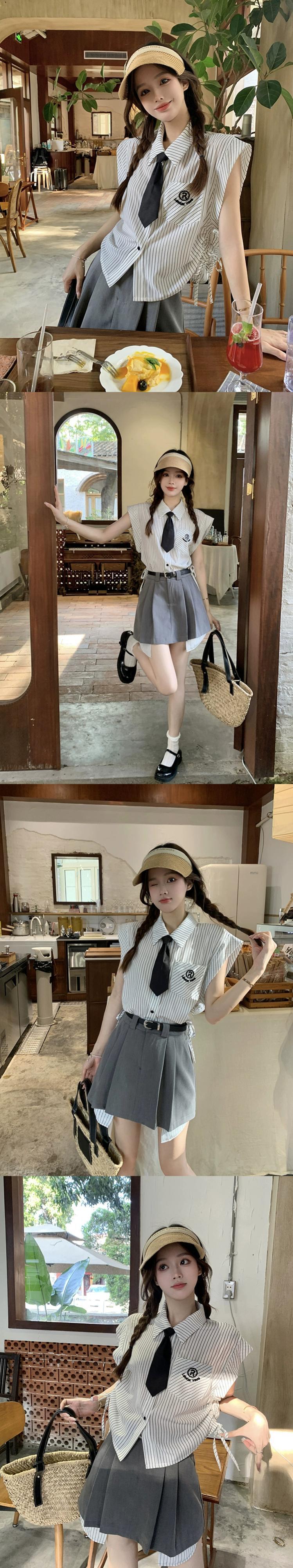 色:ブルーストライプシャツ+ネクタイ,白のストライプのシャツ+ネクタイ,ブルーストライプグレーハーフスカート+ベルト,白ストライプグレースカート+ベルト